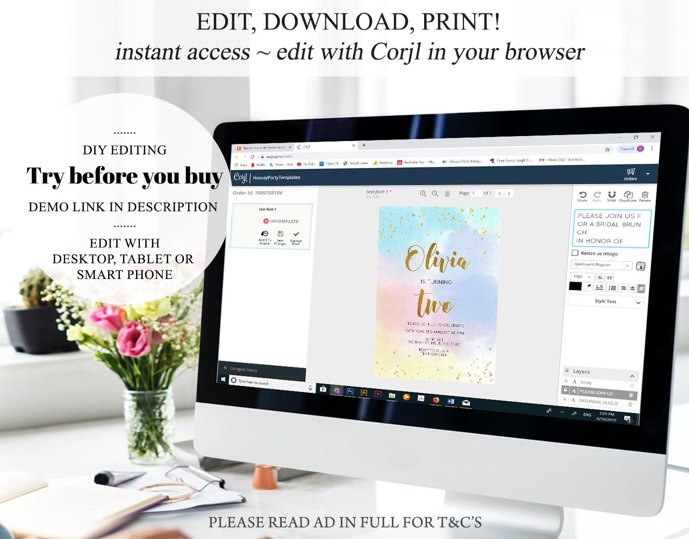 •Try before you buy! • DEMO LINK- https://www.corjl.com/d/23KJ6G PLEASE READ AD IN FULL!! •Digital file. No physical item will be shipped •Do it yourself Editing. Edit online with Corjl or Edit with your mobile ITEM DETAILS Invitation size: 5’x7’ File type: PDF, JPEG Resolution: 300DPI PDF FILE OPTIONS: •Recommended for printing •Ability to print multiple per page (if size permits) •Option to include bleed/ trim marks JPG FILE OPTIONS: •Recommended for MMS/ SMS/ Electronic send out •Can be used to print as photo •Option to include bleed/ trim marks EDITING • Do it yourself editing • Mobile editing is available • Google chrome is the recommend browser for Corjl. Please download here for FREE: https://www.google.com/chrome/ • Using other browsers may not show all of Corjl's editing features • Editing on a desktop/ laptop computer is recommended to access all of Corjl features • Mobile editing is available, please use a desktop/ laptop computer to access all of Corjl features DOWNLOADS & EXPIRY •Maximum 3 downloads on the same edit •Link expires 30 days after purchase DOWNLOAD NOTICE •Once you have reached your download limits &/ “approve proof” in Corjl. You will not be able to request further downloads on your design. Further download requests are not permitted WHAT IS EDITABLE •Text - colours, fonts, size, move, delete & rotation. •Please see demo link for what you can and can’t do WHAT YOU CAN’T EDIT •Template size •Template orientation •Graphics CAN NOT BE deleted, moved, or changed in colour •Please see demo link for what you can and can’t do HOW TO 1. Choose design template & checkout on Etsy. 2. Email will be sent from Corjl. Follow link to access template 3. Edit, save & print INSTRUCTIONS •Instructions on how to edit your design have been written by Corjl and will be available with your purchase. PRINTING •Colours can vary depending on the monitor, printer & cardstock •Can be printed at home •Home printing will require you to select the high quality print settings, select appropriate paper thickness & click "Actual size" prior to you printing •This design was test printed on 100 gsm paper •Can be printed at local print shop. Please check printing requirements & any printing restrictions prior to purchase PERSONAL USE ONLY. This item cannot be shared, re-sold, or used commercially for profit. REFUND POLICY •We are unable to provide a refund/ exchange on commenced & completed work, instant downloads or self-editing link templates. Please use the demo link to work out if this product is right for you. Copyright © 2018 by InvitePrintablesShop PTY LTD All rights reserved. This file or any portion thereof may not be reproduced or resold without the express written permission of the publisher (including edits to the design). Our files are provided as high-resolution PDFs – the end result is dependent upon the printer and paper used. If using a professional printing company, InvitePrintablesShop are not responsible for their specific printing requirements, paper or colour quality. Any changes required to the template are not included with your purchase – the files come as described in the listing only and cannot be changed. Thank you for visiting Invite Printables Shop:)