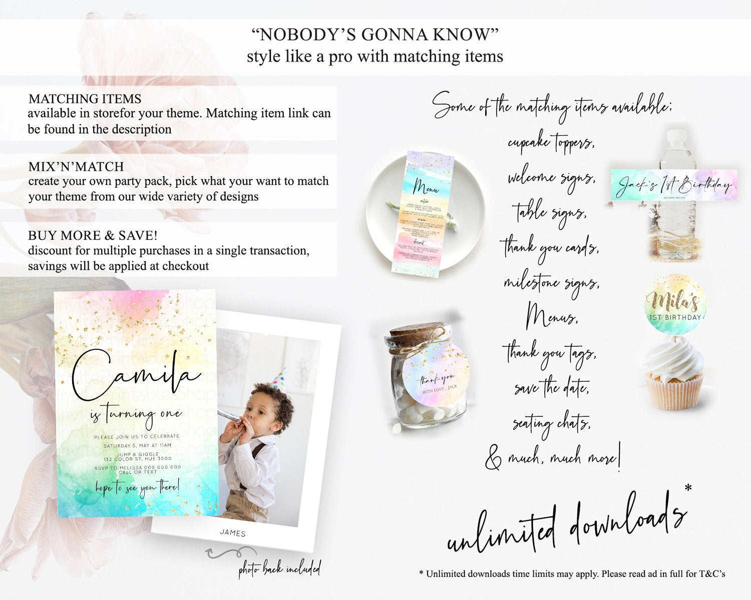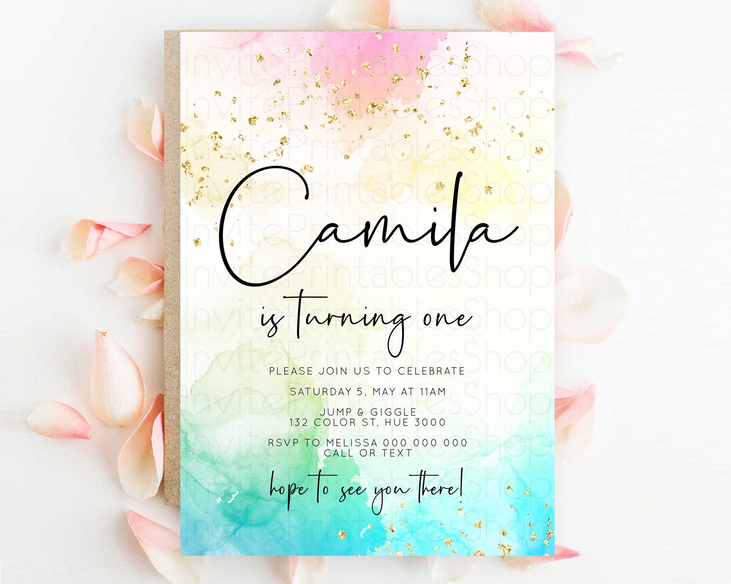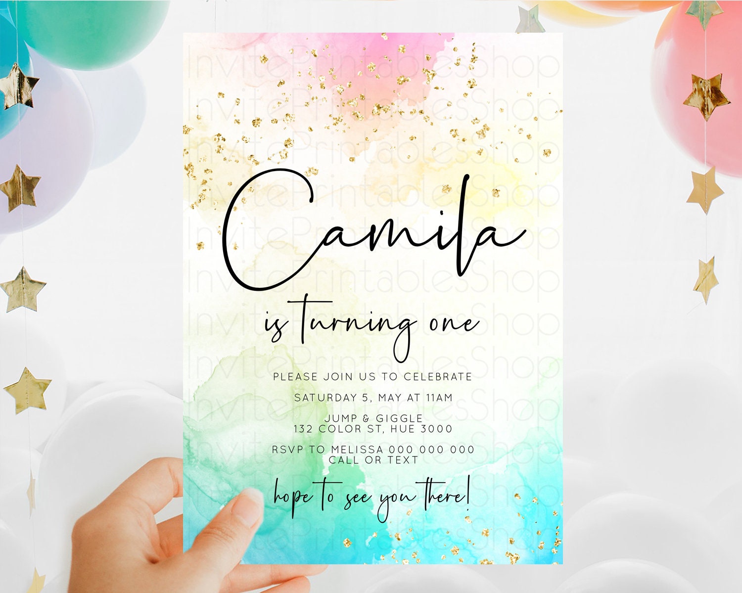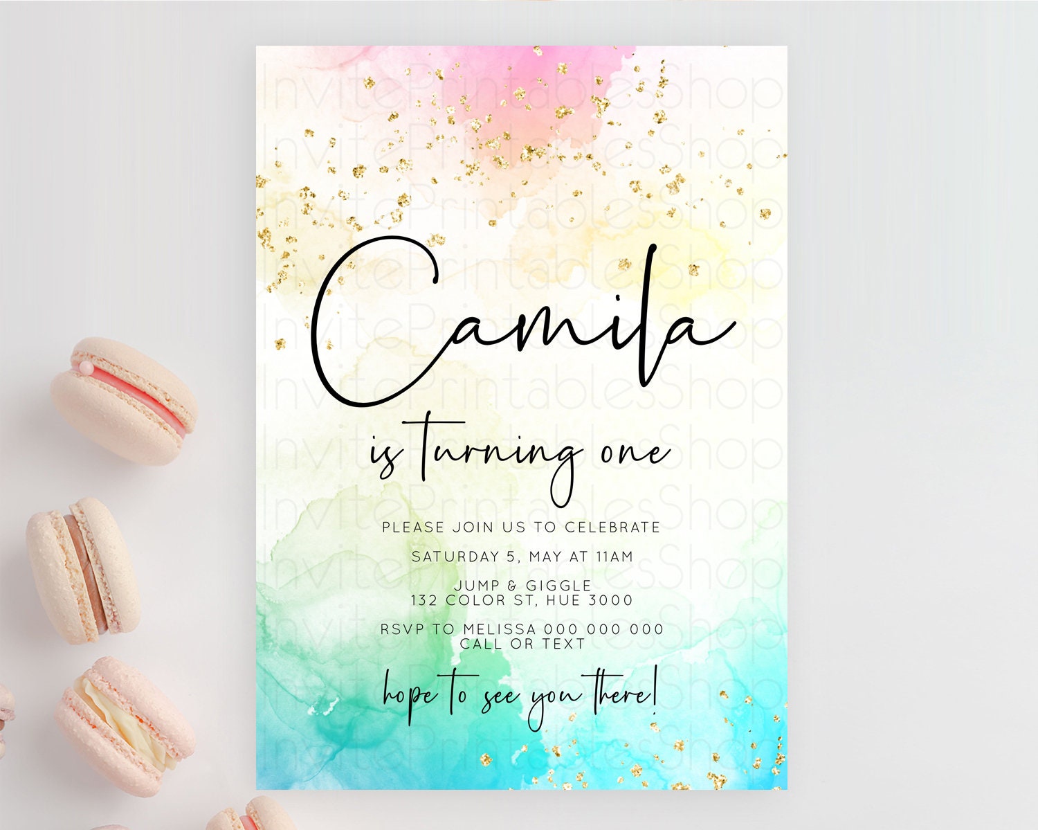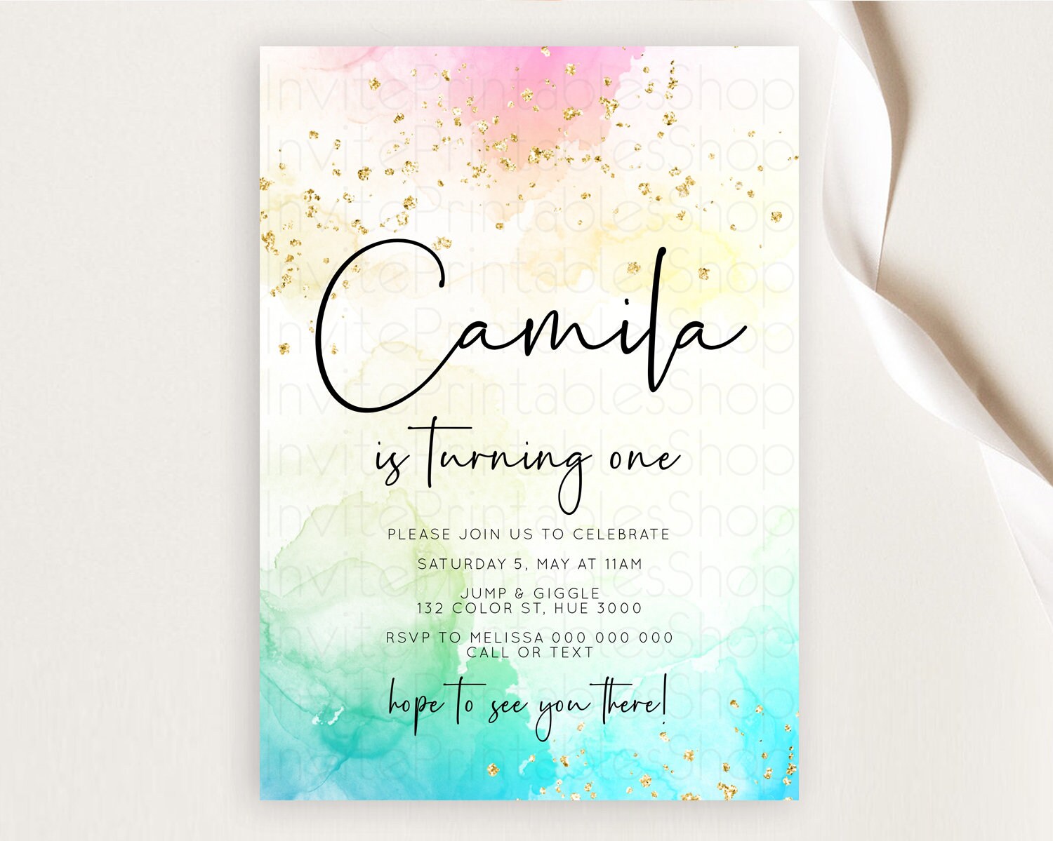 Rainbow Birthday Invitation Colorful Pastel Watercolor Invitation Gold Glitter Sprinkles Ombre Pastel 1st 2nd 3rd Birthday D10151