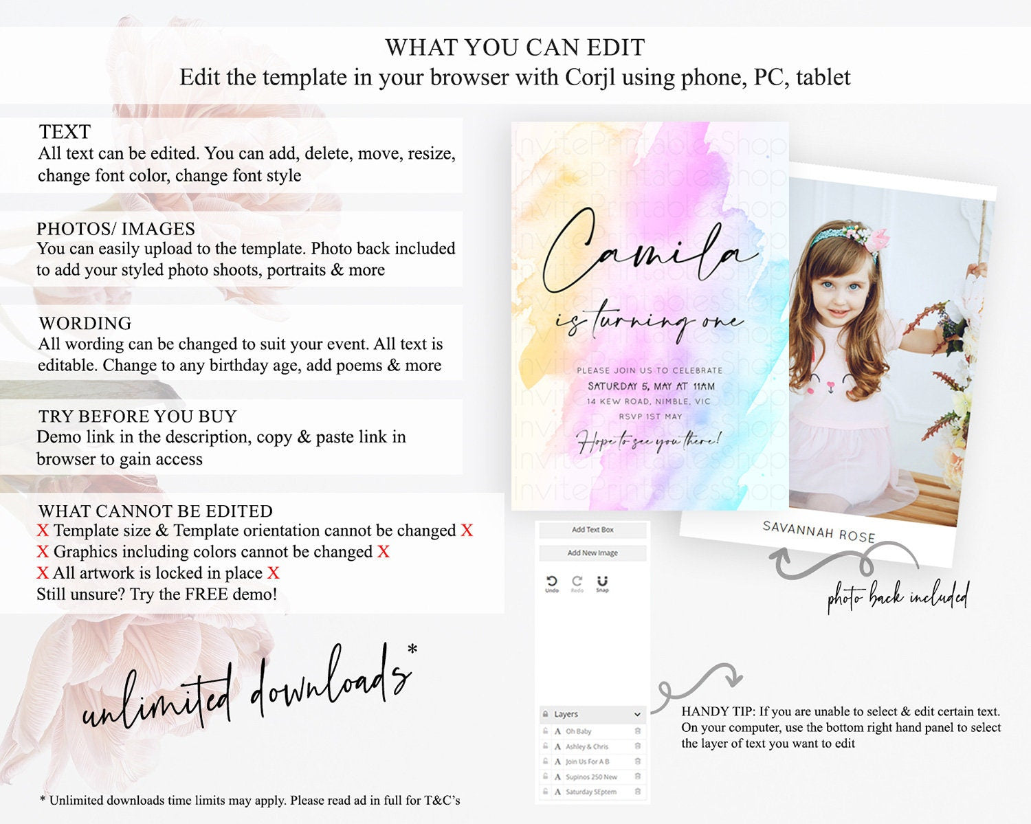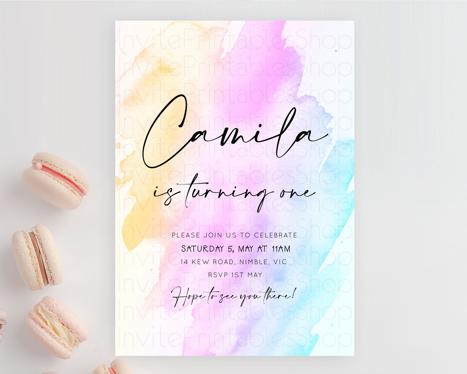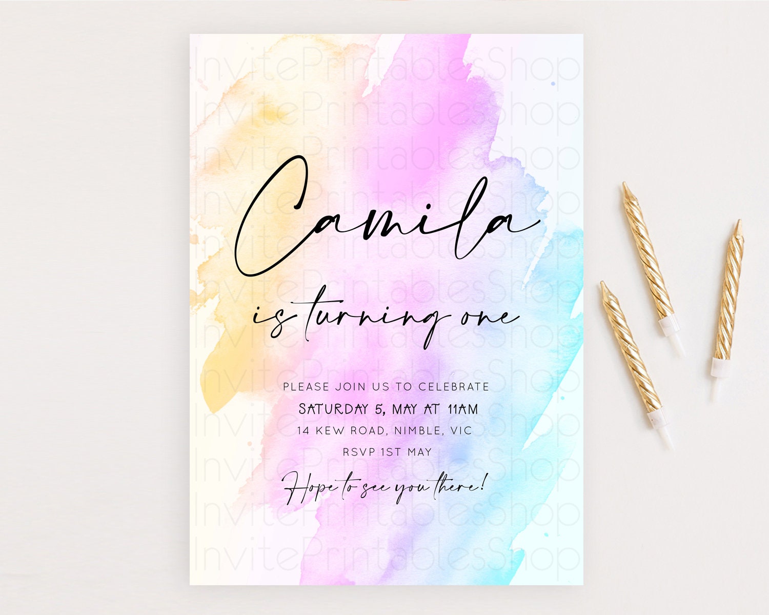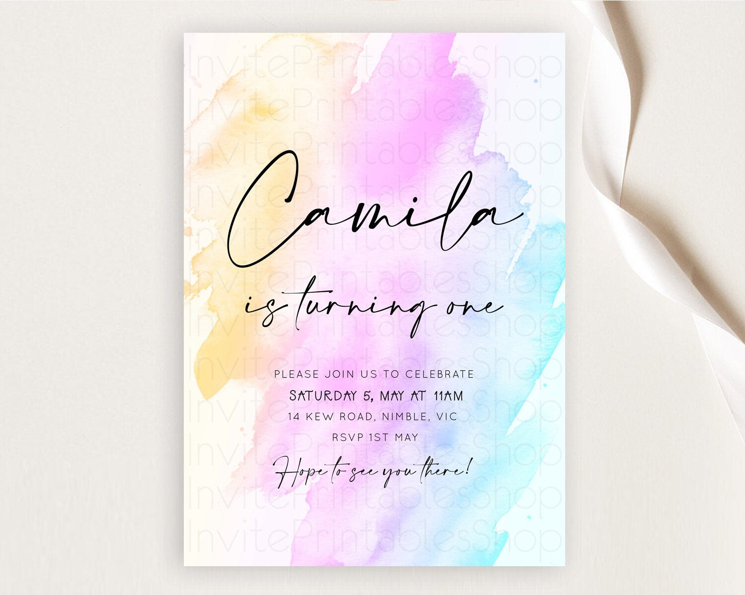 Rainbow Birthday Invitation Colorful Pastel Watercolor Invitation Gold Glitter Sprinkles Ombre Pastel 1st 2nd 3rd Birthday D10175