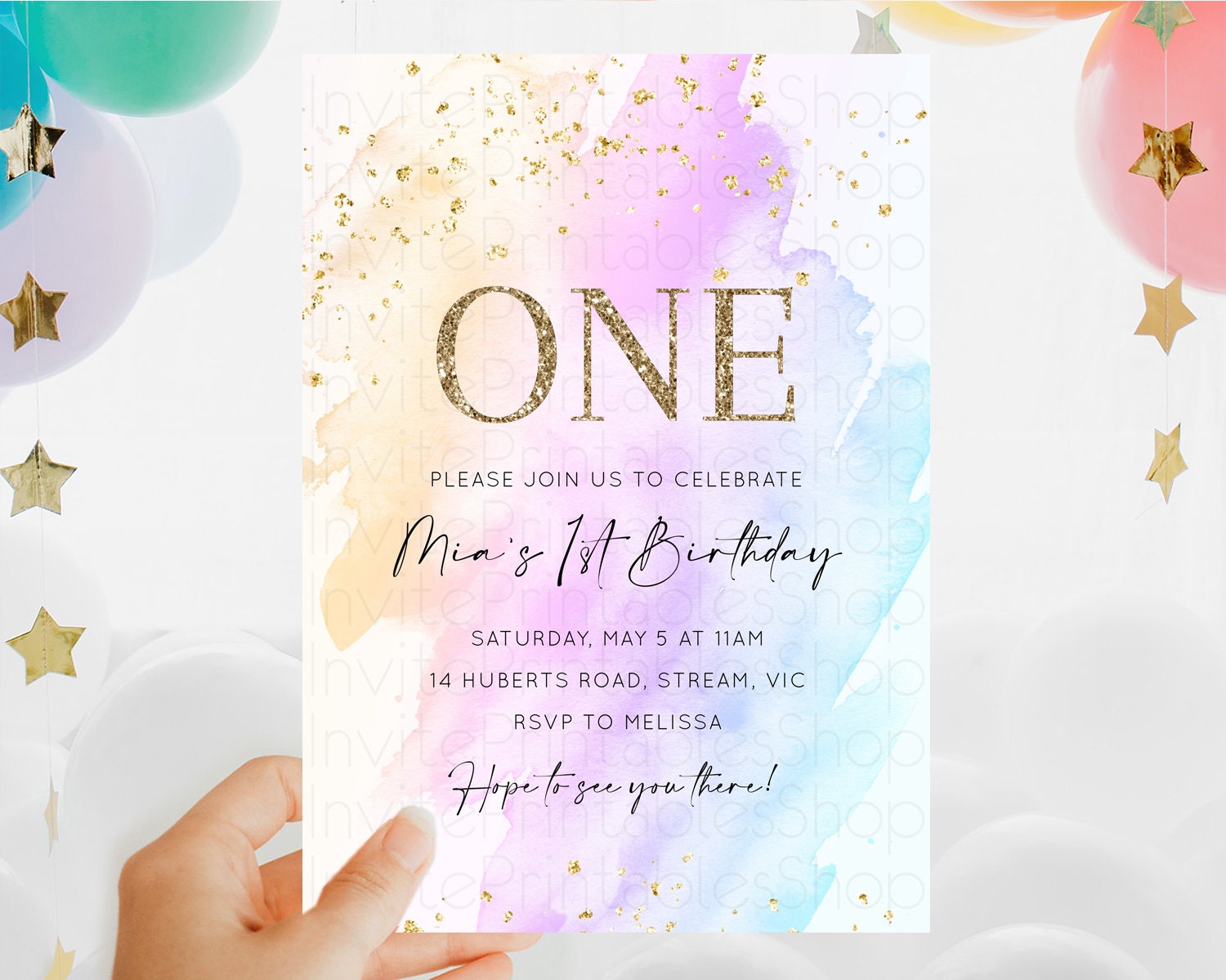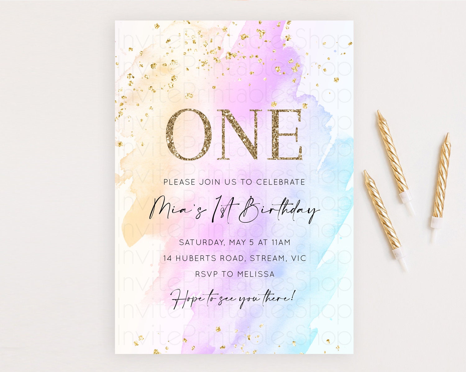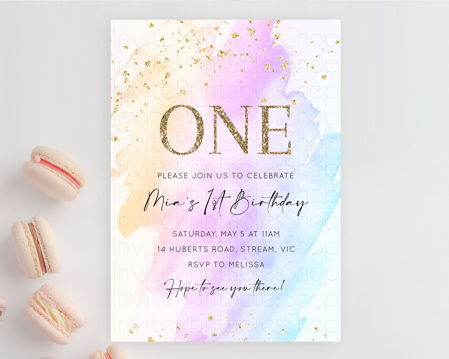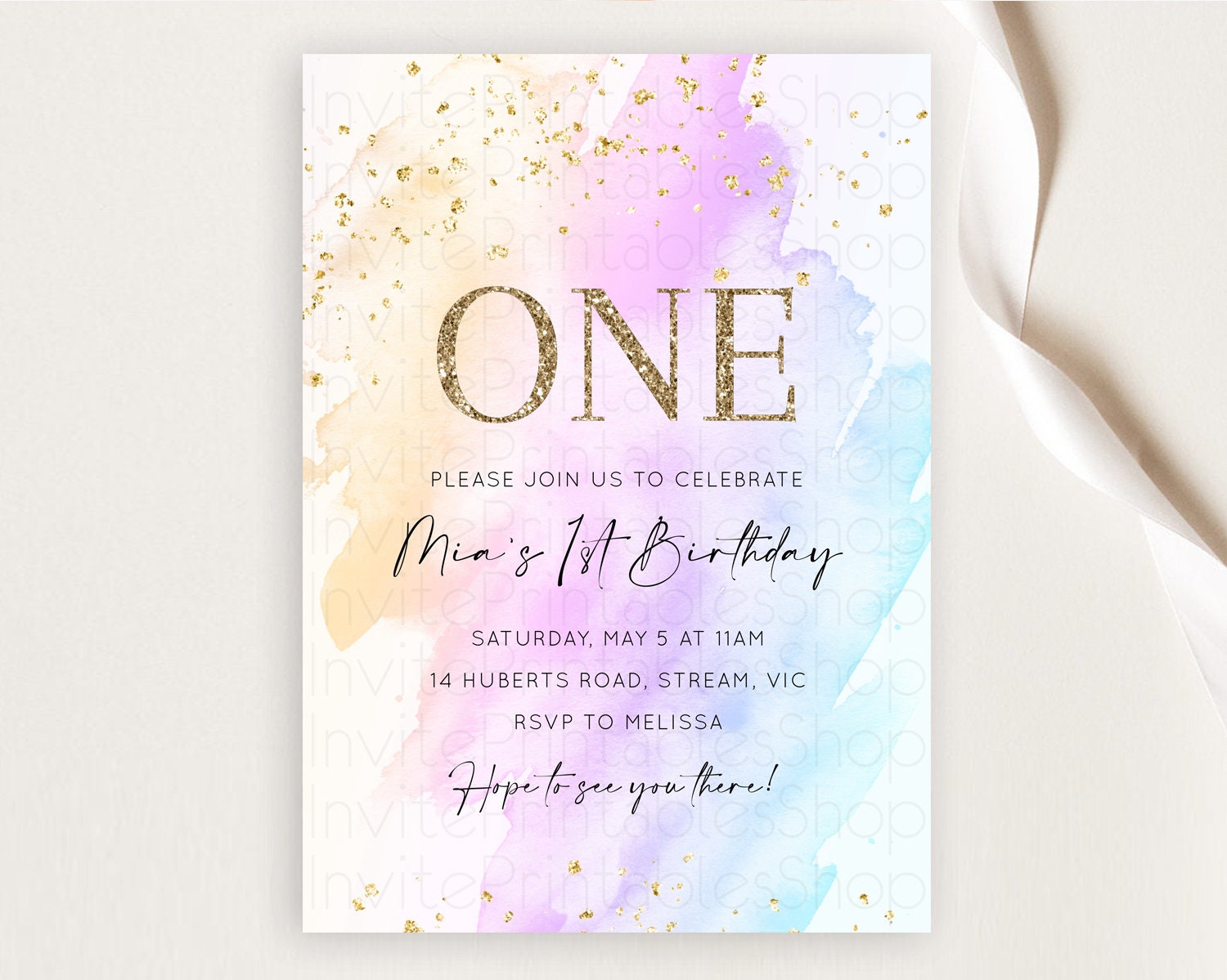 Rainbow Birthday Invitation Colorful Pastel Watercolor Invitation Gold Glitter Sprinkles Ombre Pastel 1st 2nd 3rd Birthday D10175