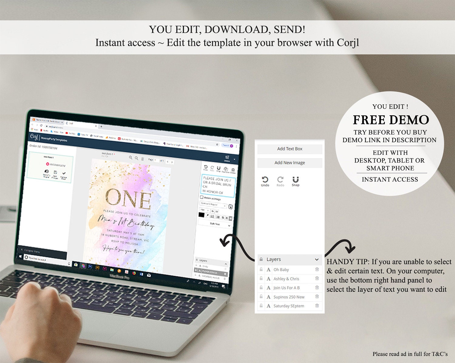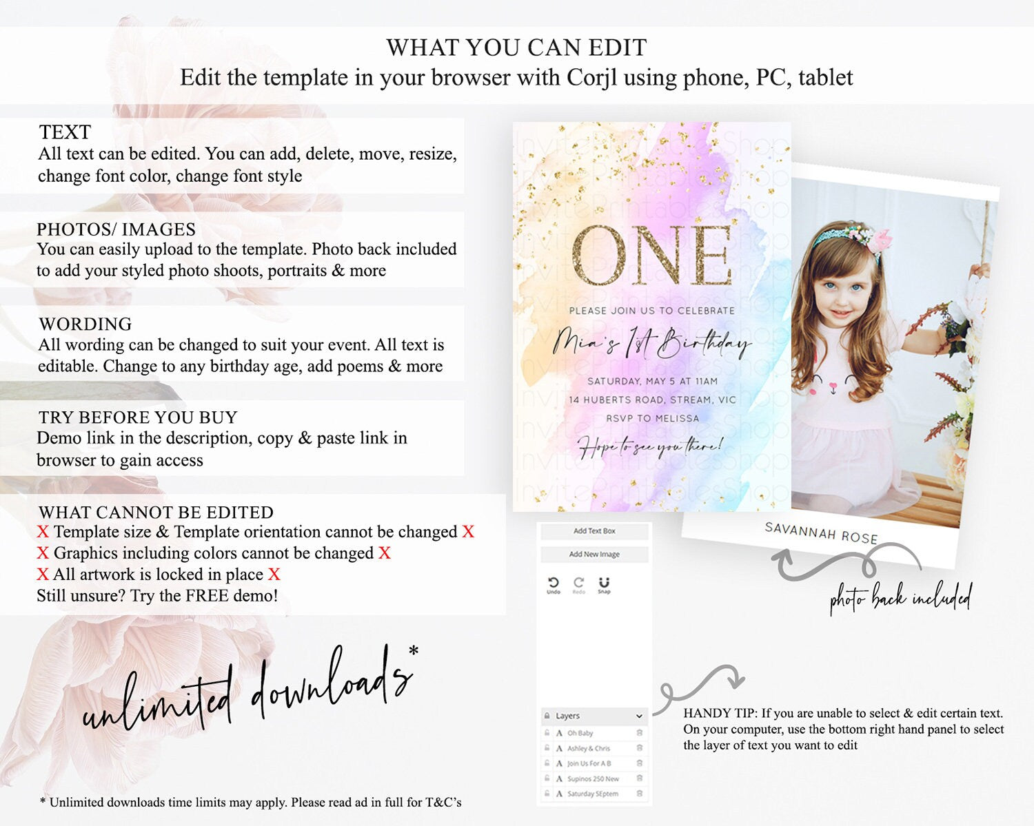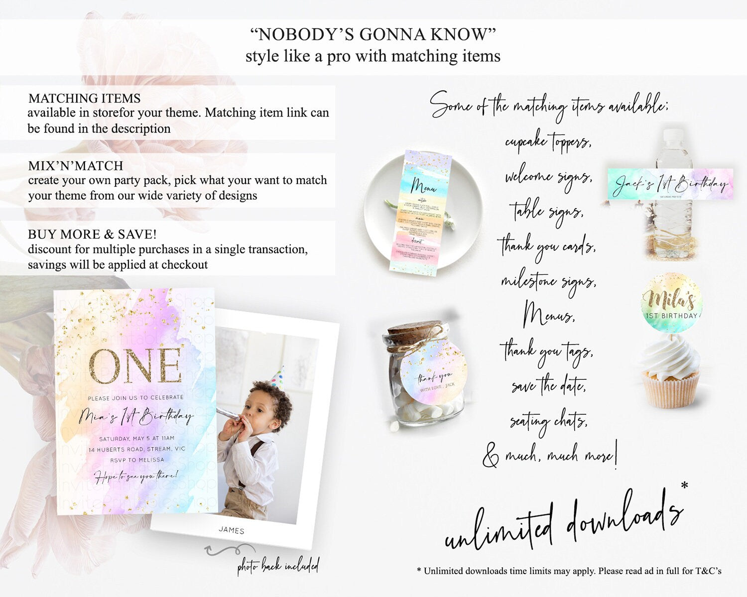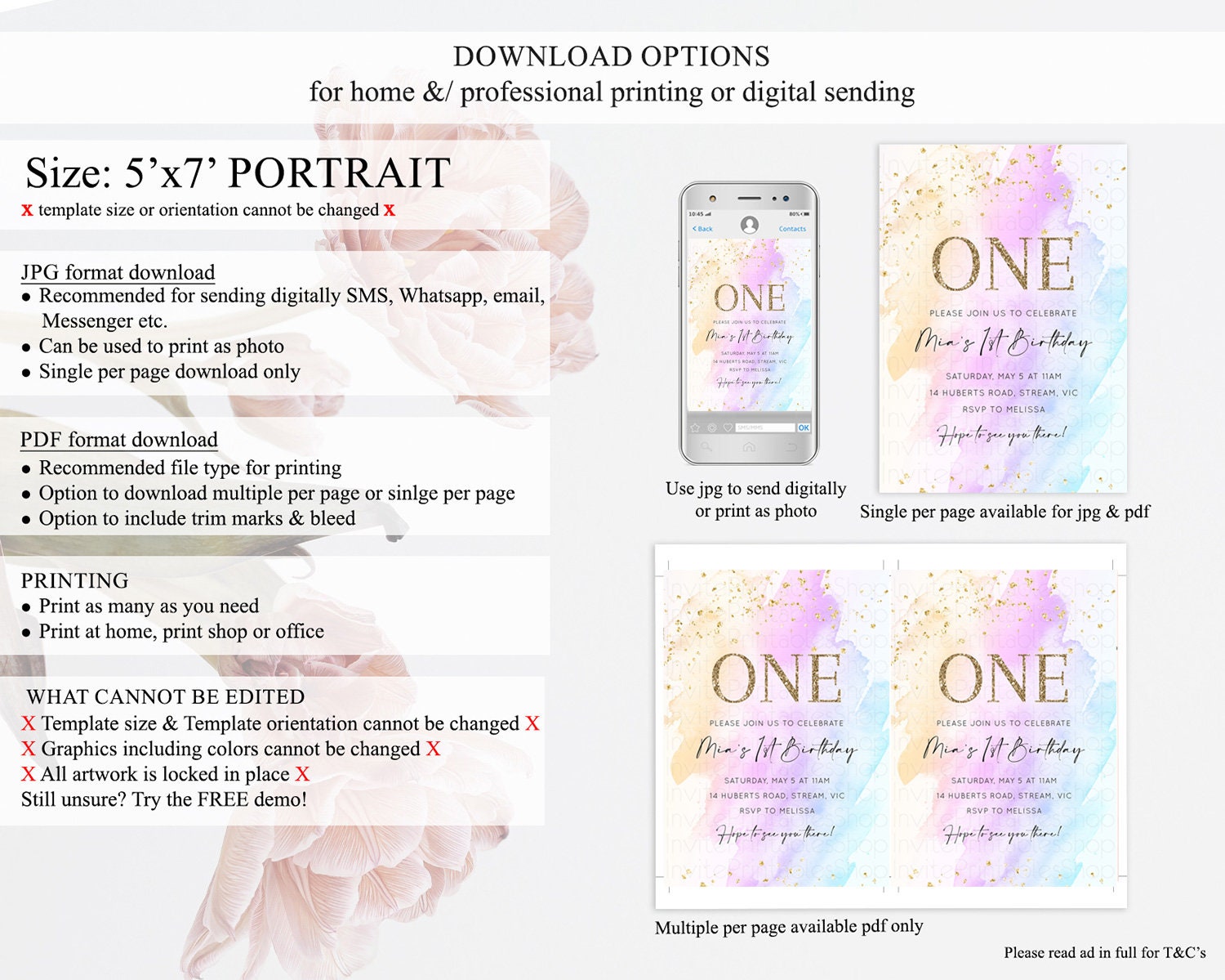 Rainbow Birthday Invitation Colorful Pastel Watercolor Invitation Gold Glitter Sprinkles Ombre Pastel 1st 2nd 3rd Birthday D10175