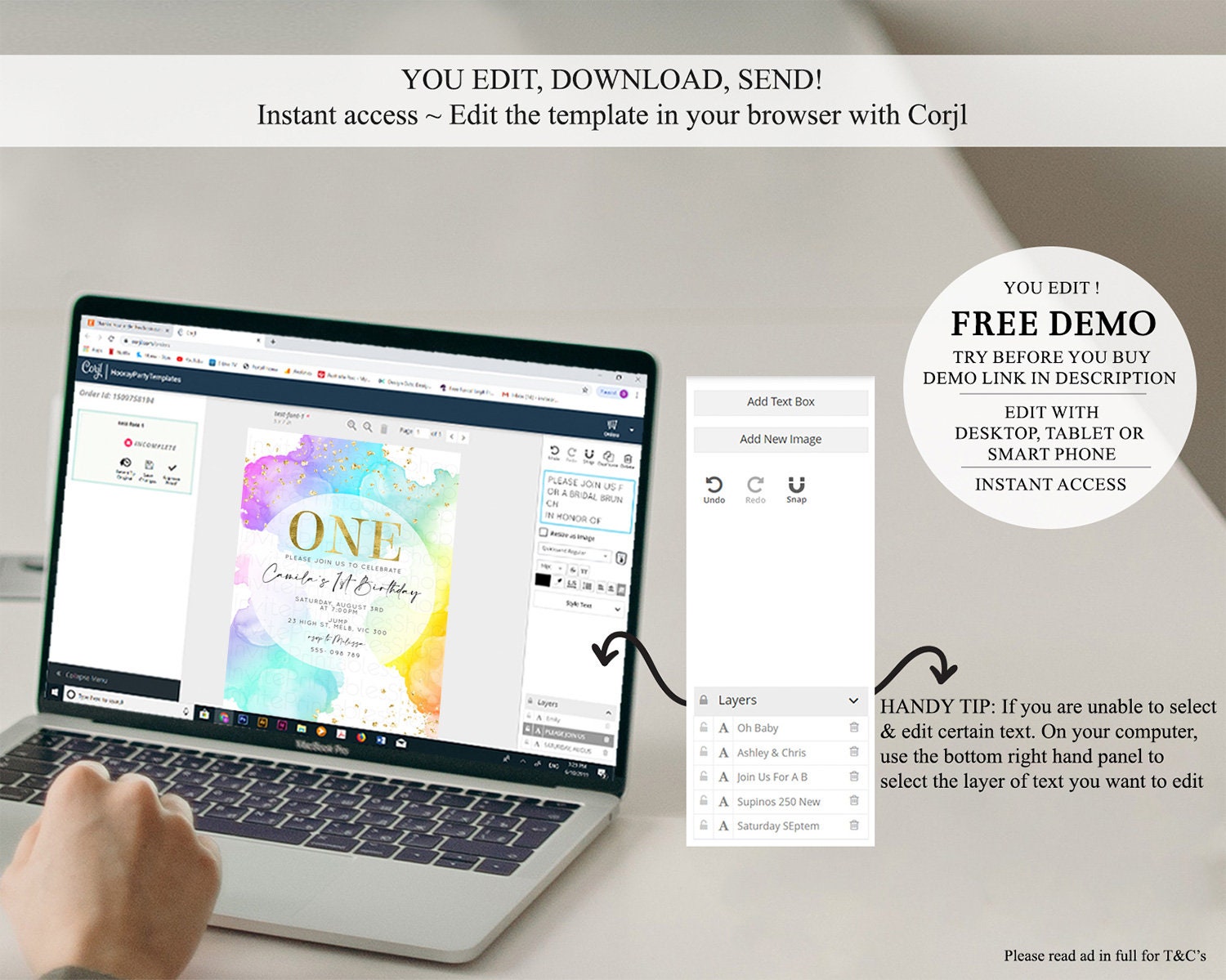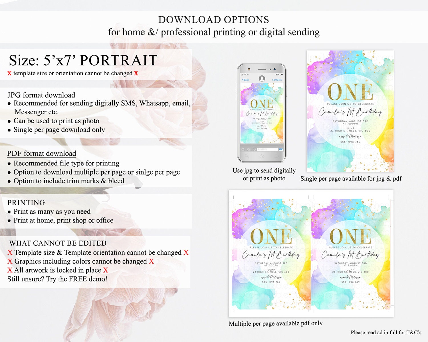 Rainbow Birthday Invitation Colorful Pastel Watercolor Invitation Gold Glitter Sprinkles Ombre Pastel 1st 2nd 3rd Birthday D10213
