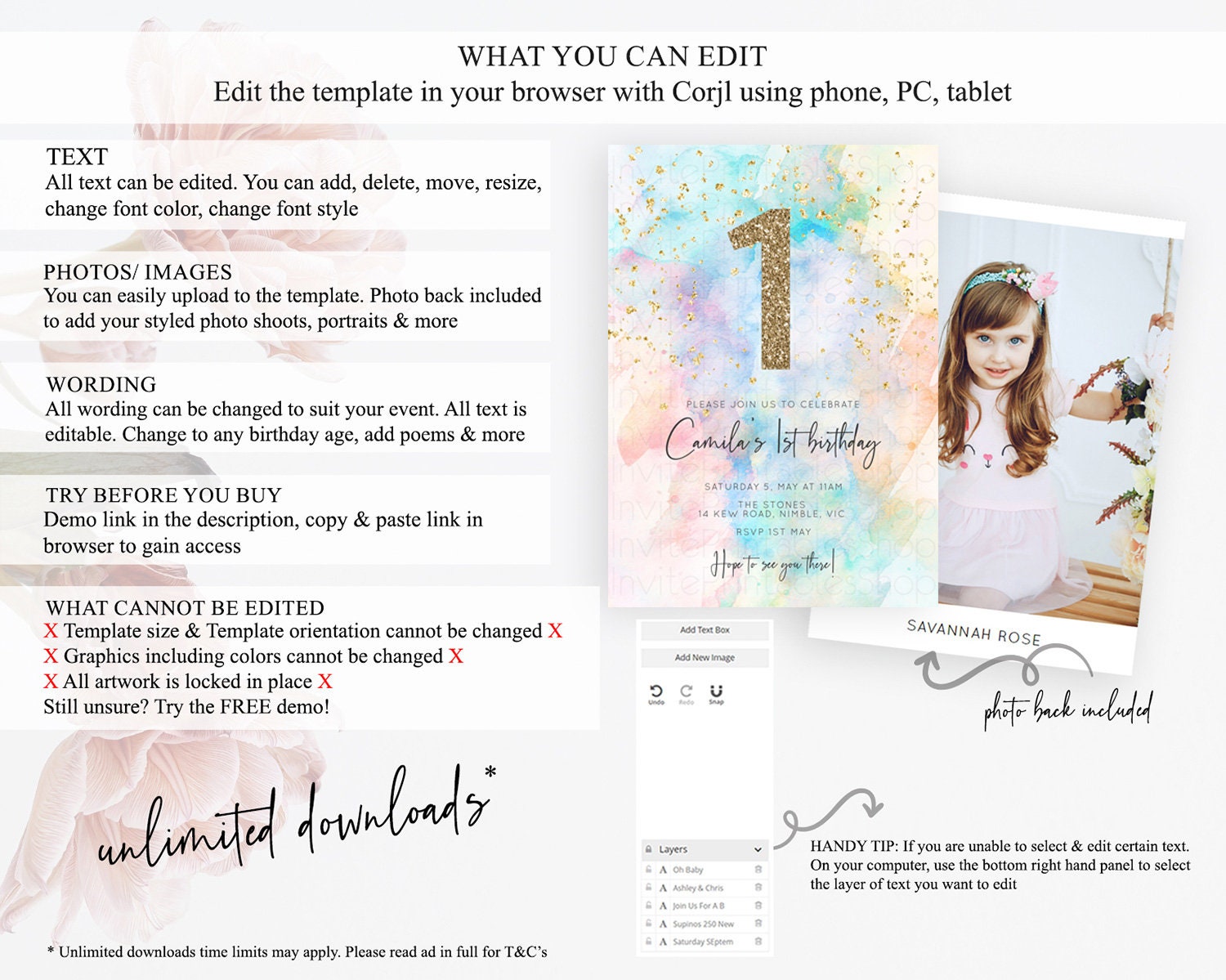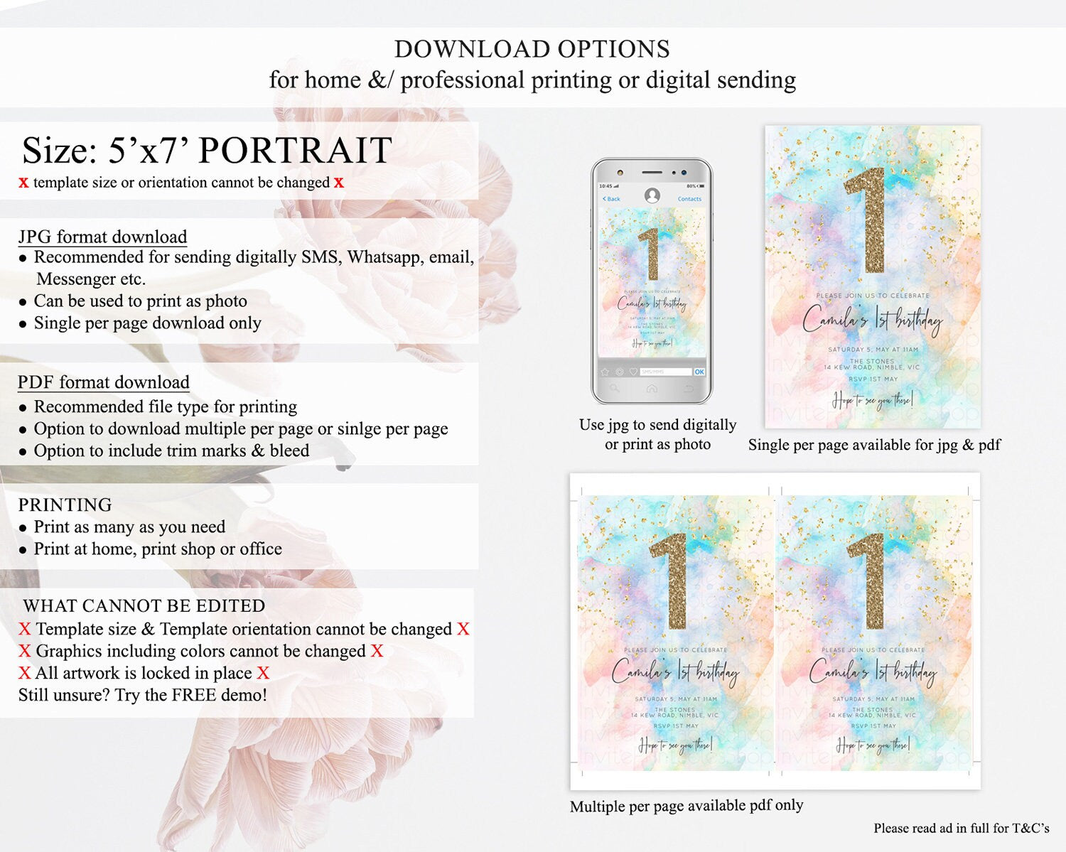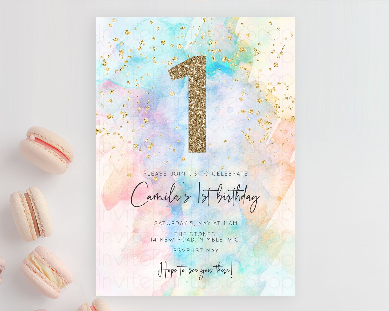 Rainbow Birthday Invitation Colorful Pastel Watercolor Invitation Gold Glitter Sprinkles Ombre Pastel 1st 2nd 3rd Birthday D10260