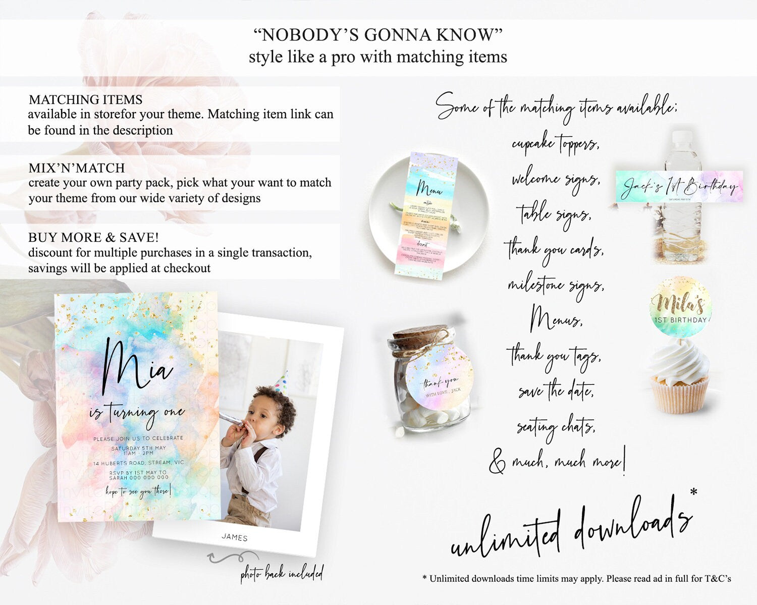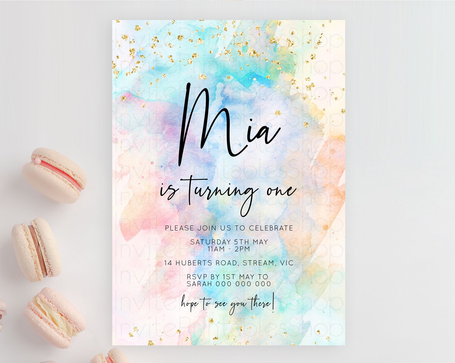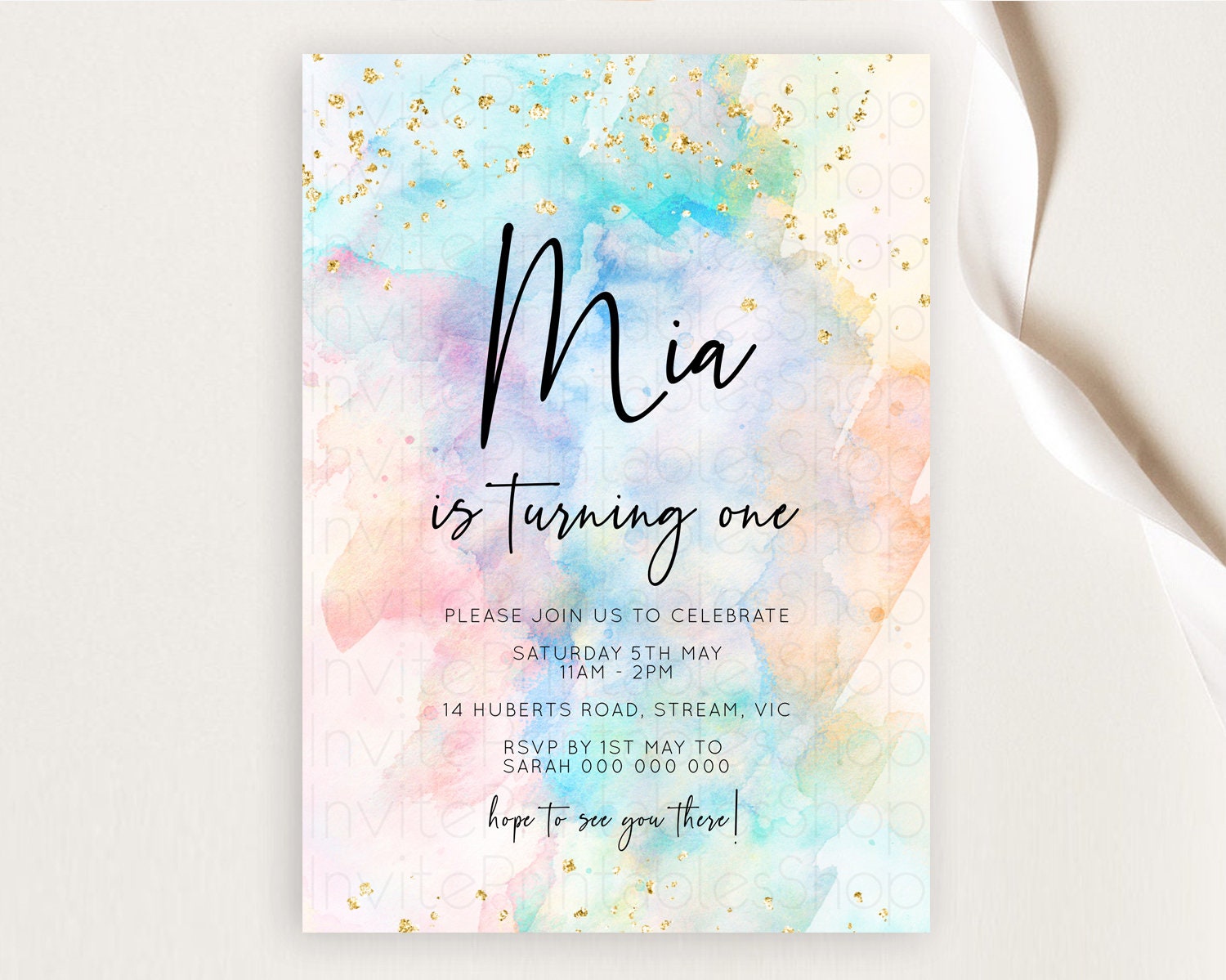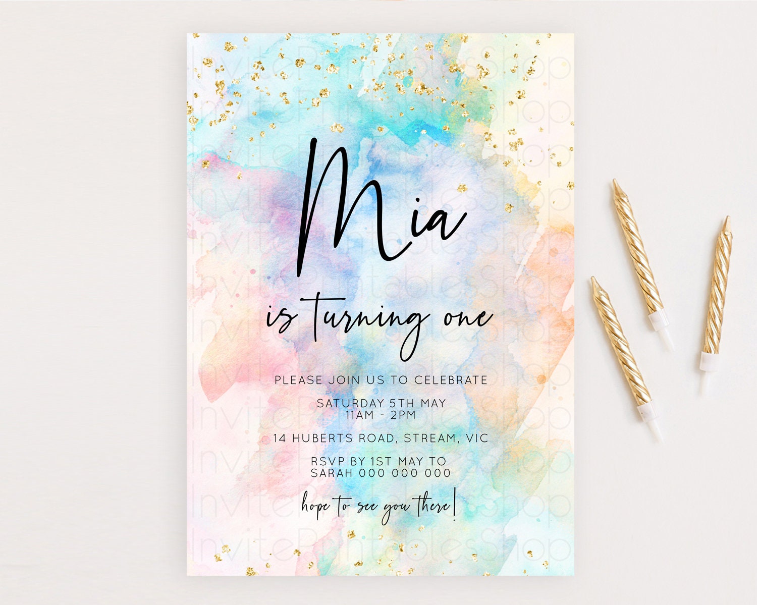 Rainbow Birthday Invitation Colorful Pastel Watercolor Invitation Gold Glitter Sprinkles Ombre Pastel 1st 2nd 3rd Birthday D10260