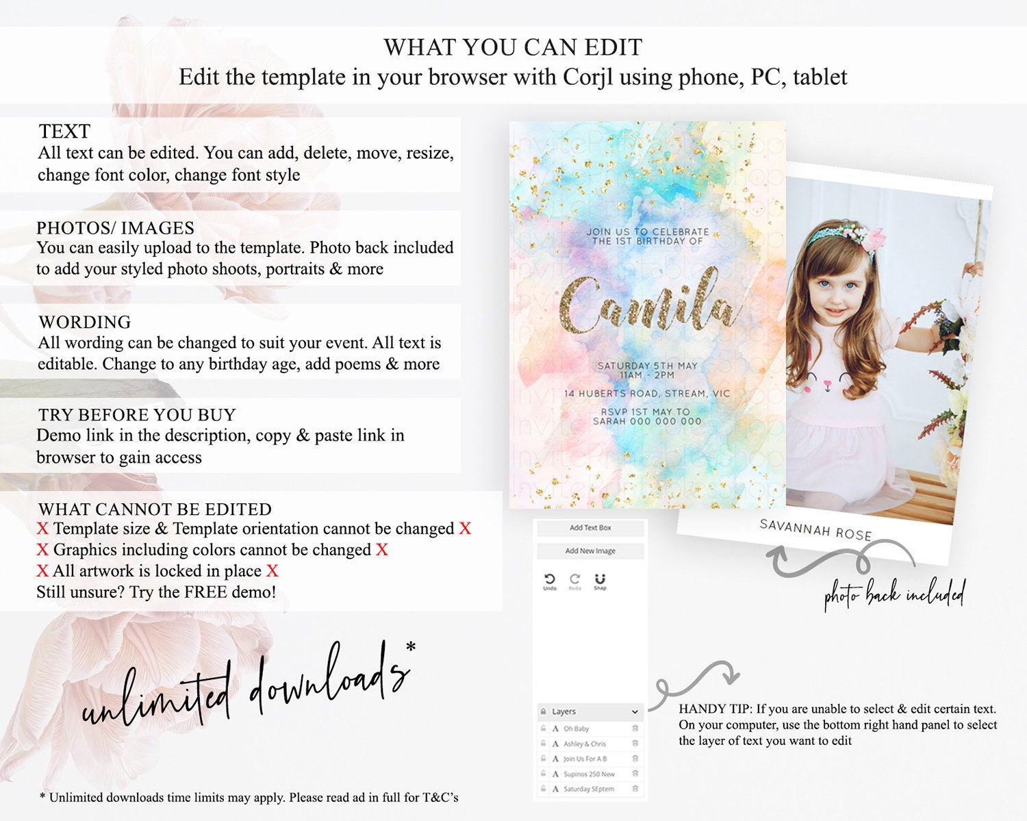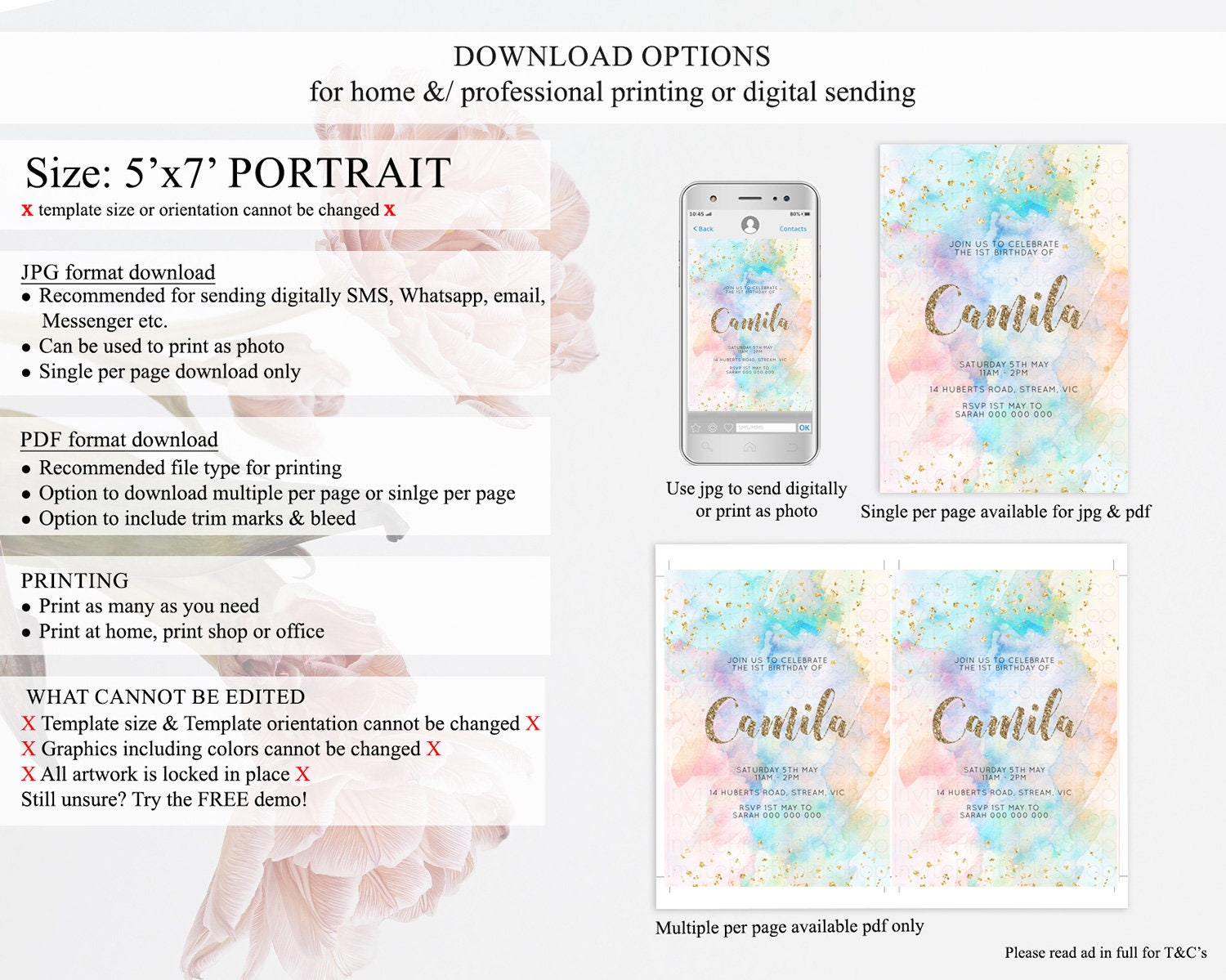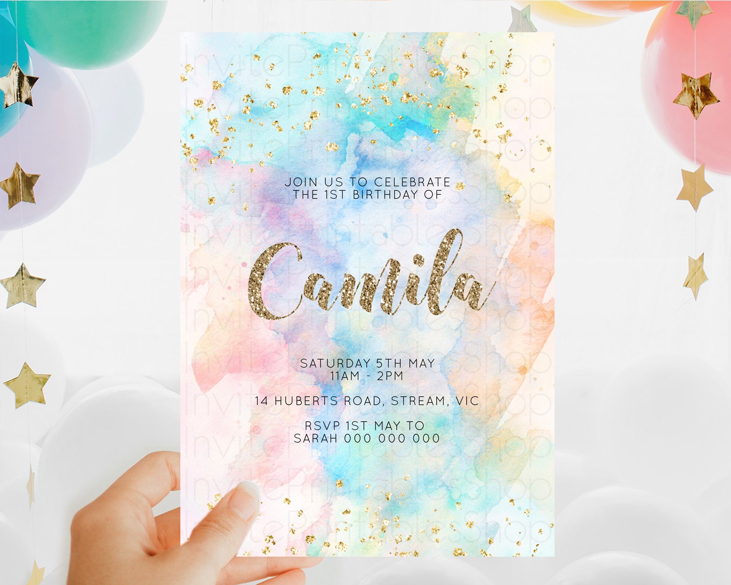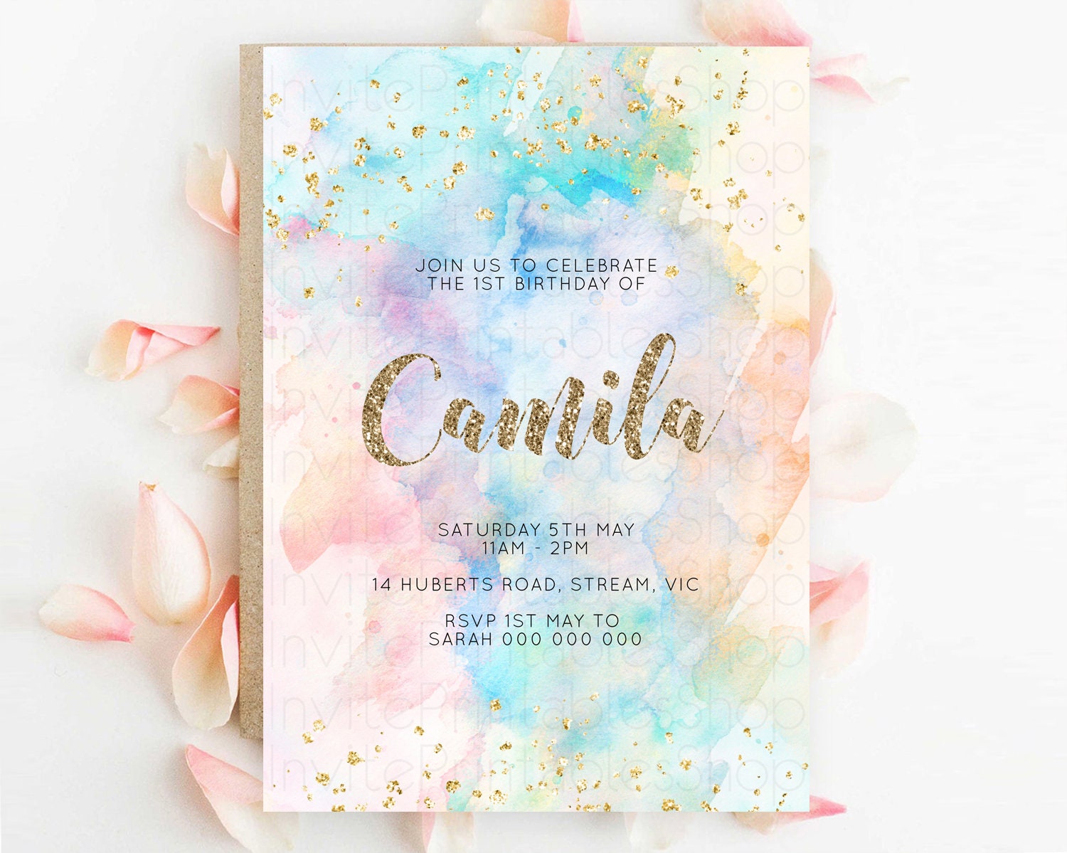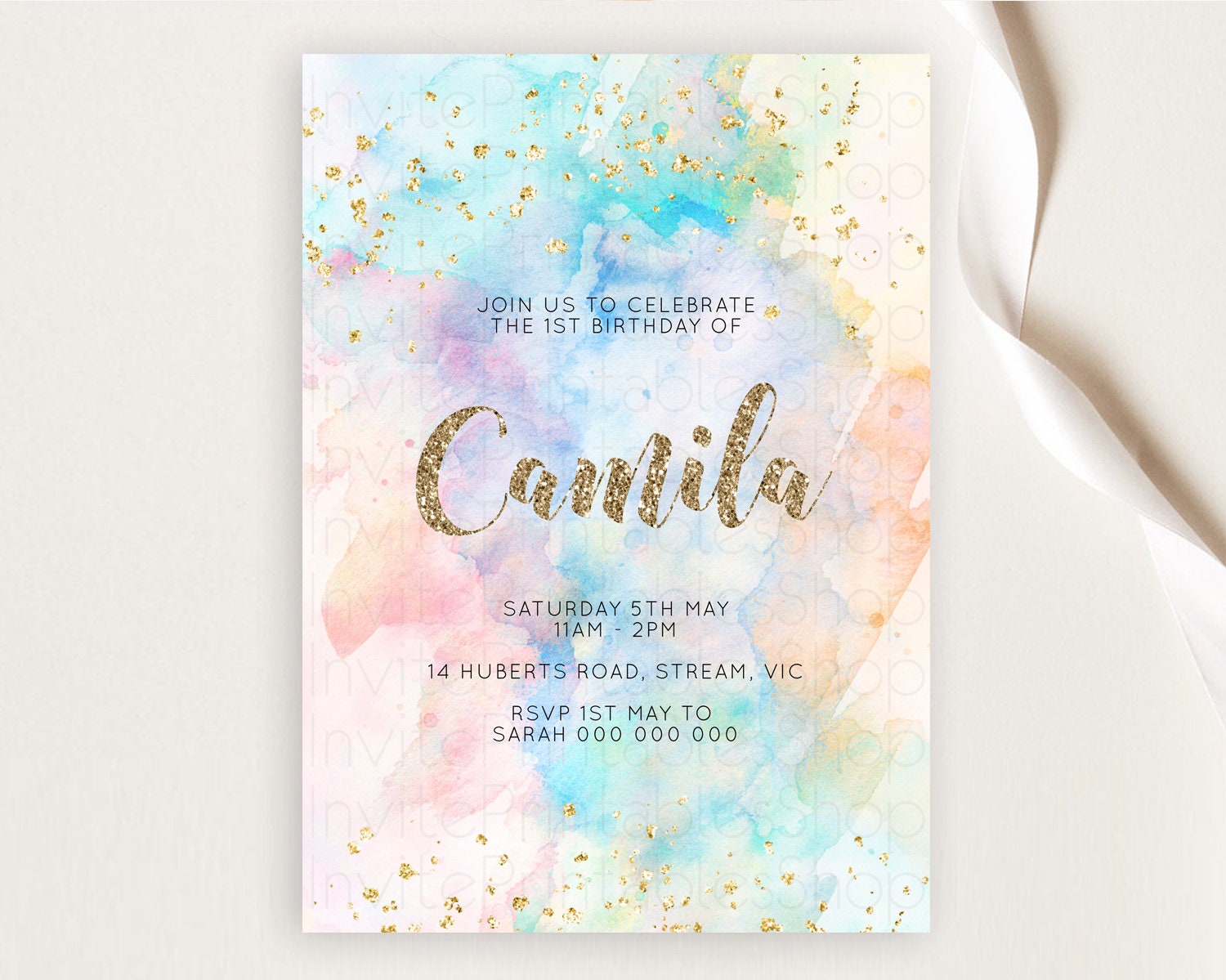 Rainbow Birthday Invitation Colorful Pastel Watercolor Invitation Gold Glitter Sprinkles Ombre Pastel 1st 2nd 3rd Birthday D10261