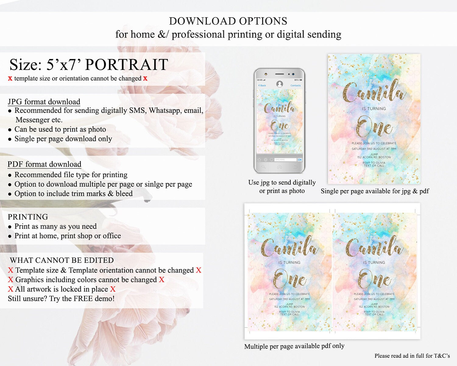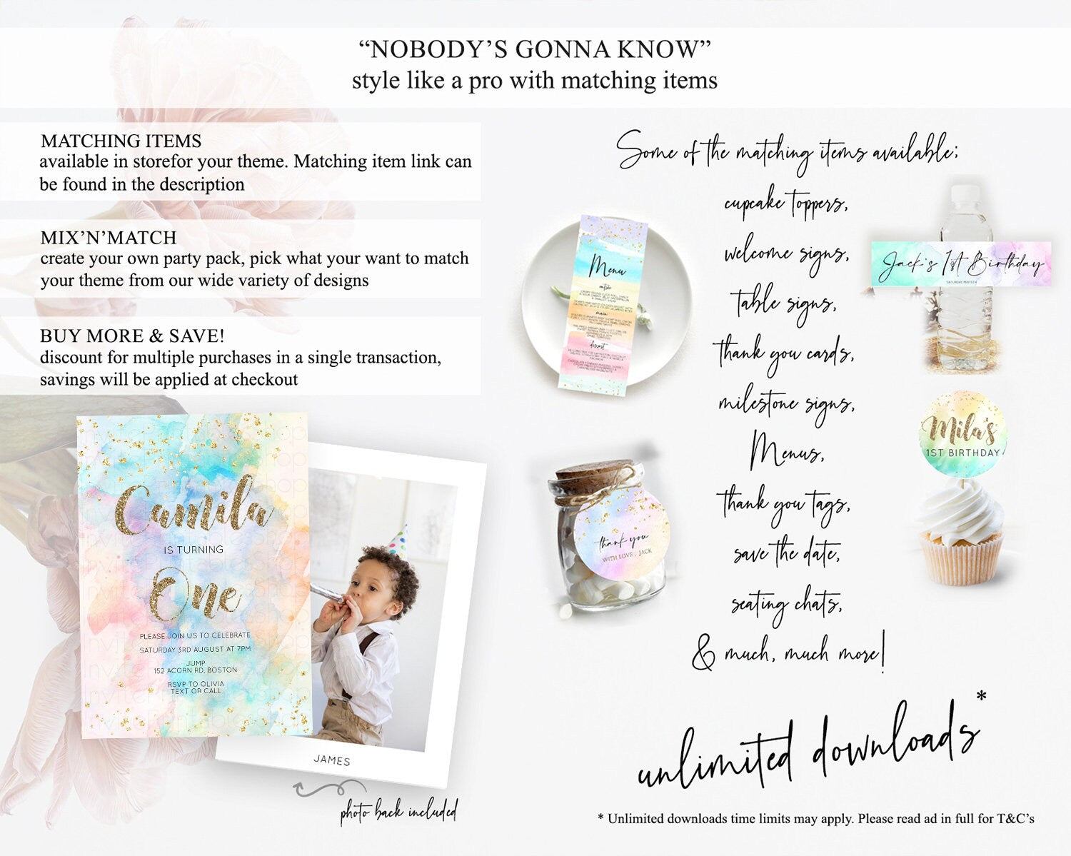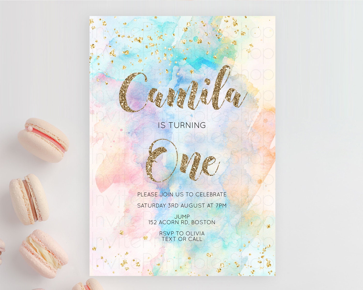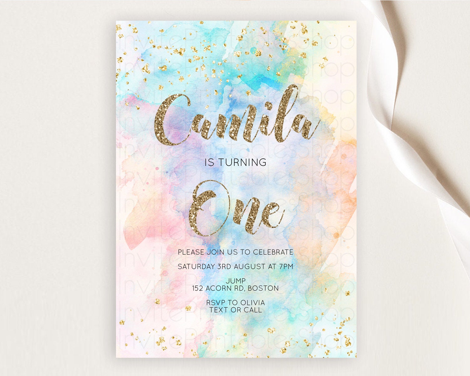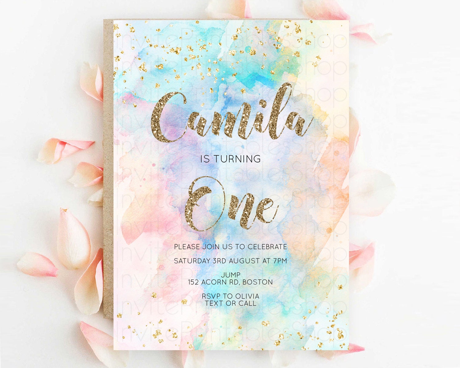 Rainbow Birthday Invitation Colorful Pastel Watercolor Invitation Gold Glitter Sprinkles Ombre Pastel 1st 2nd 3rd Birthday D10261
