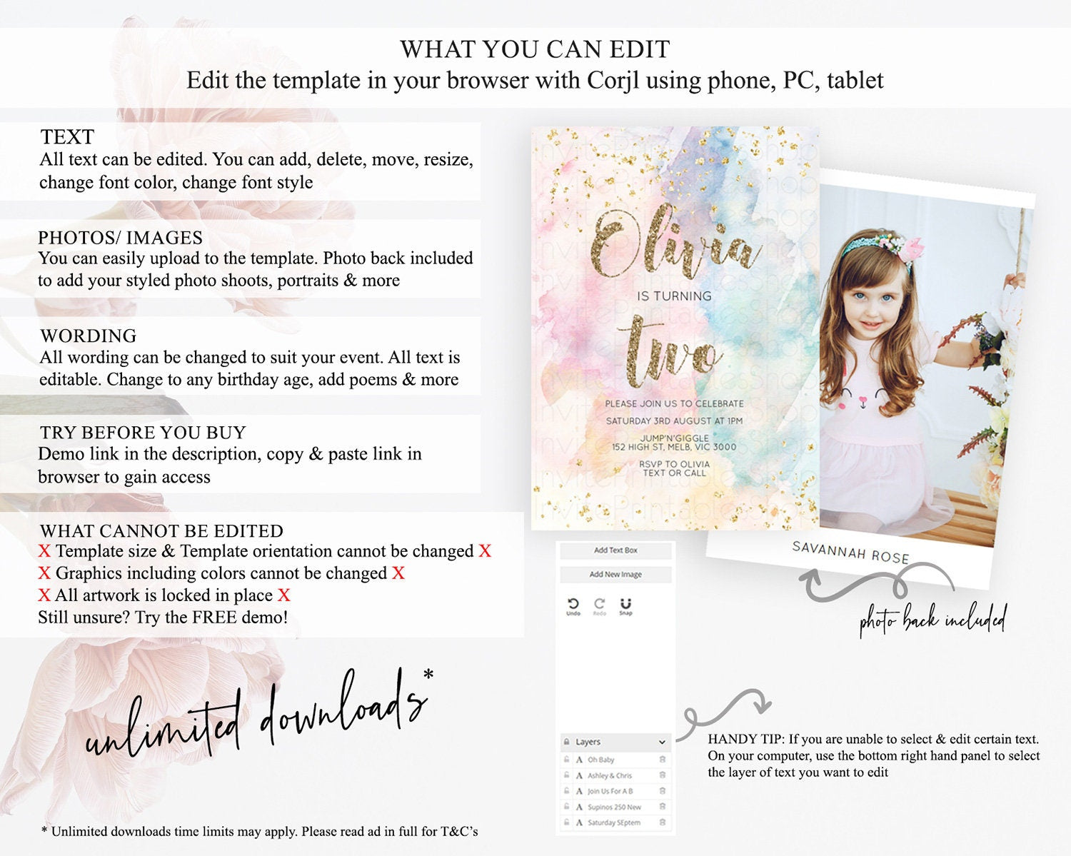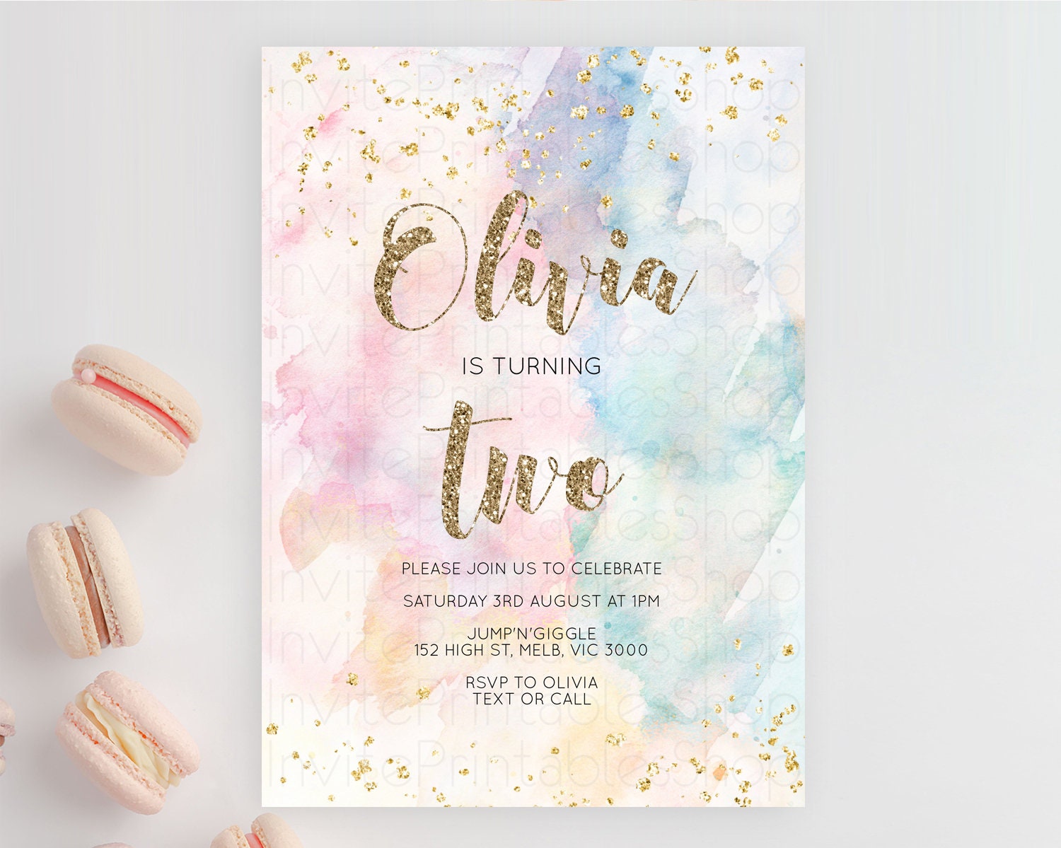 Rainbow Birthday Invitation Colorful Pastel Watercolor Invitation Gold Glitter Sprinkles Ombre Pastel 1st 2nd 3rd Birthday D10264