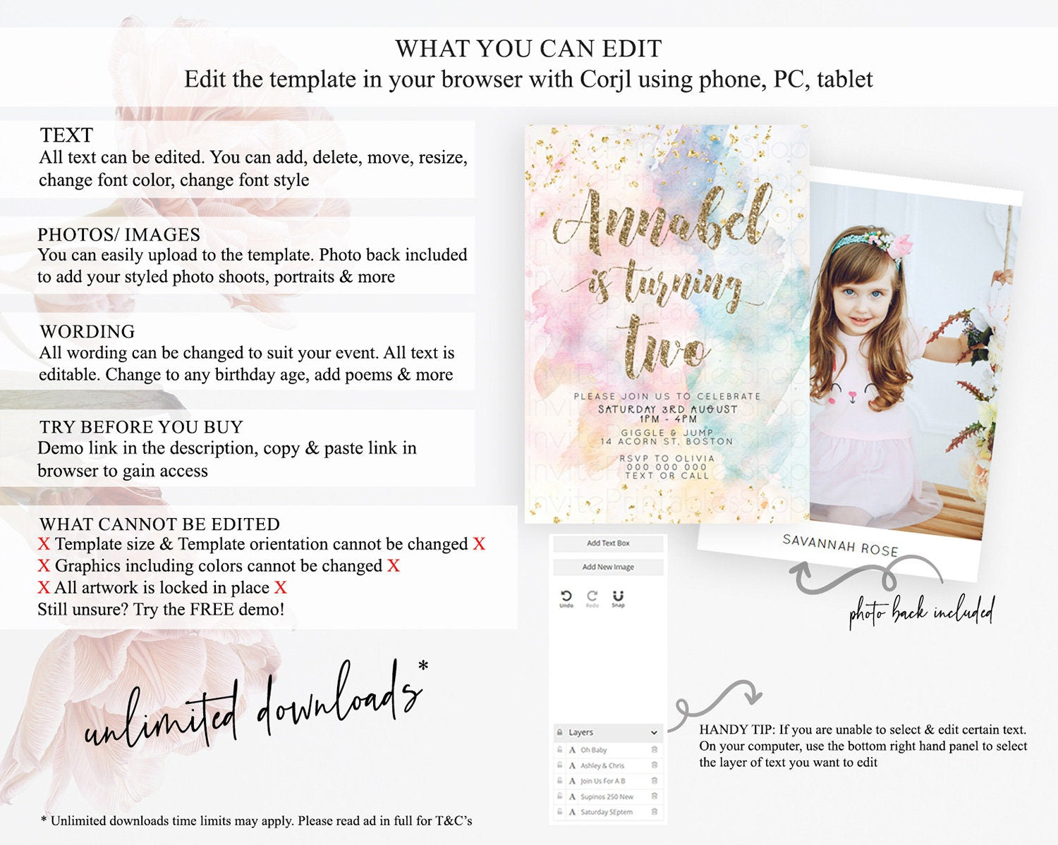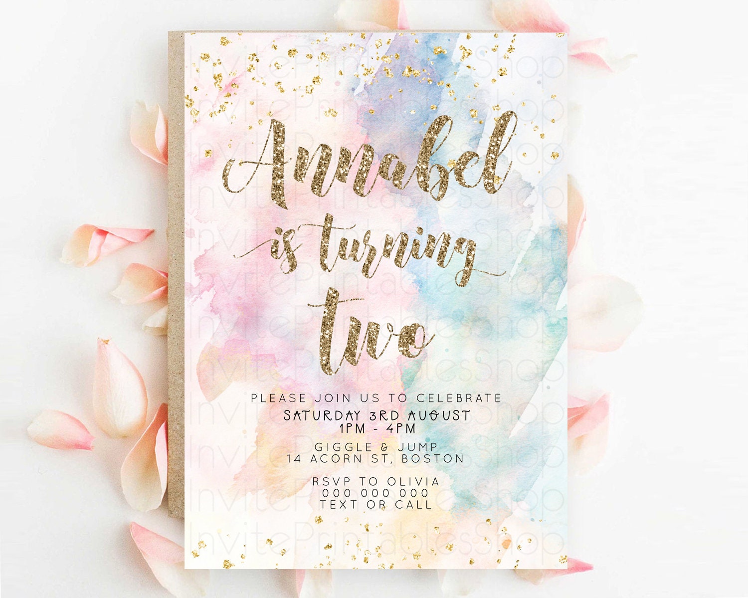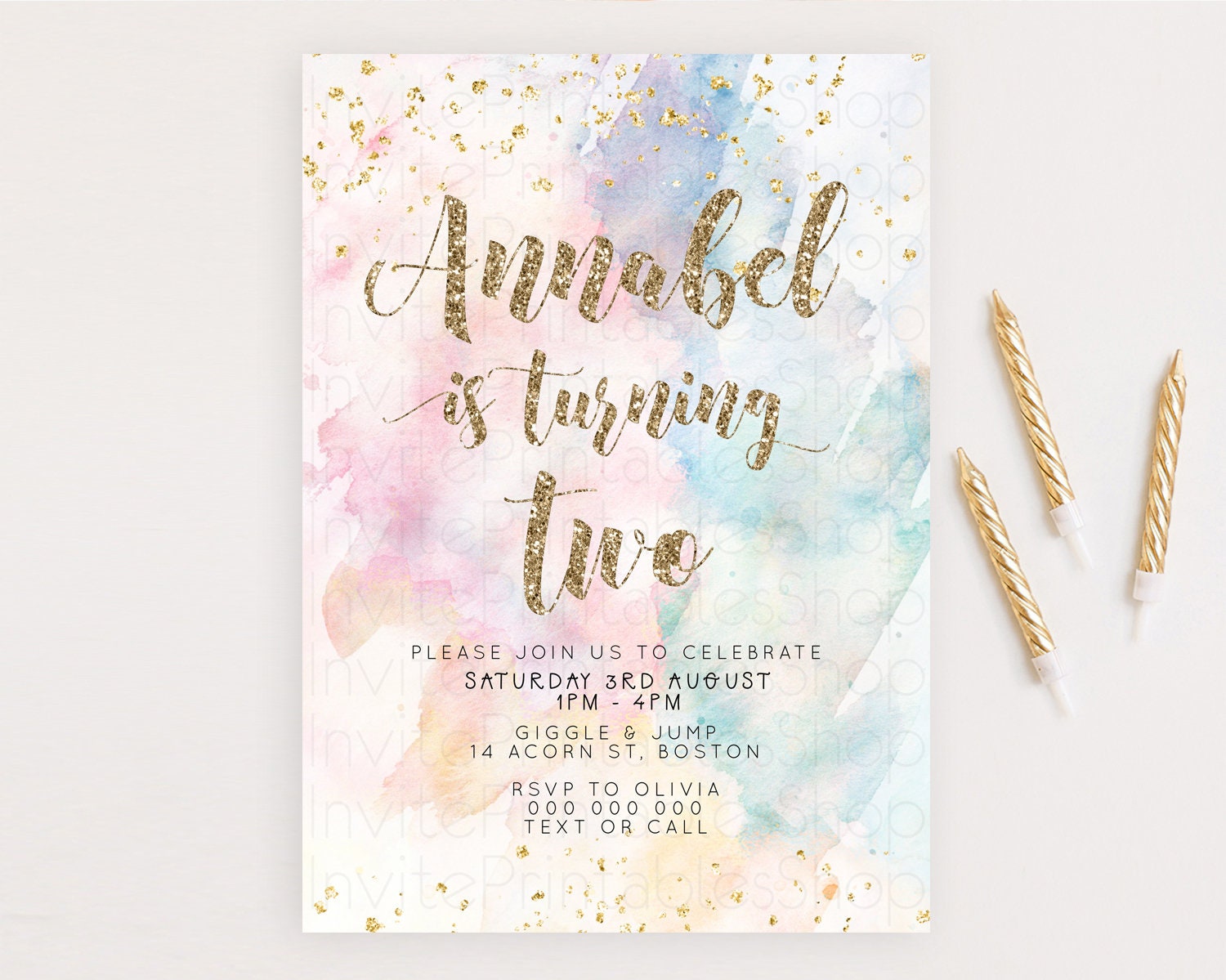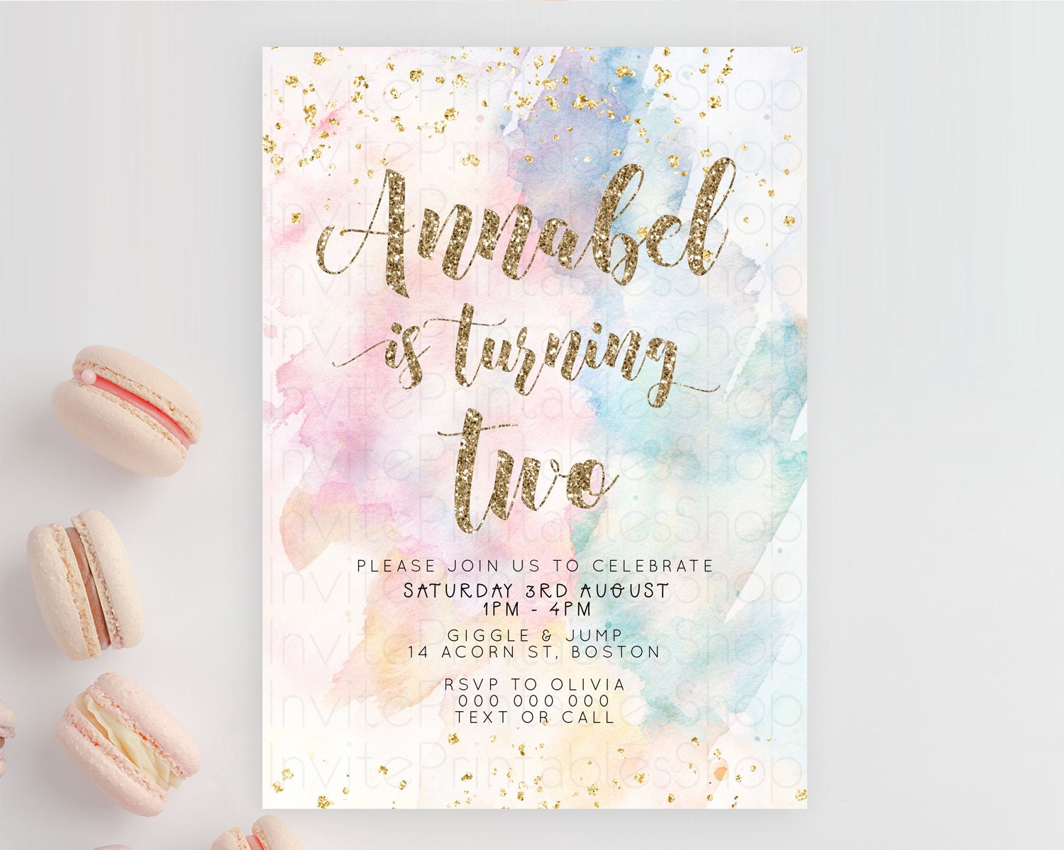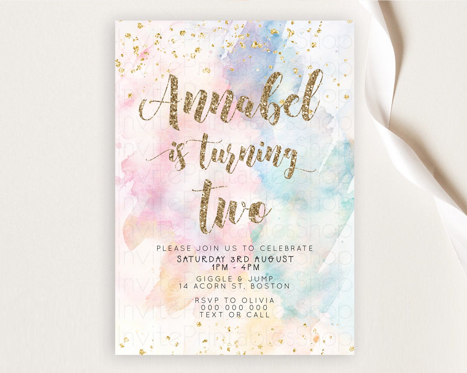 Rainbow Birthday Invitation Colorful Pastel Watercolor Invitation Gold Glitter Sprinkles Ombre Pastel 1st 2nd 3rd Birthday D10264