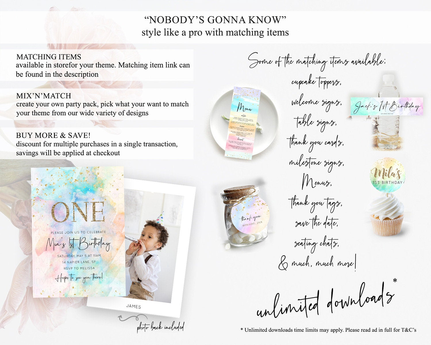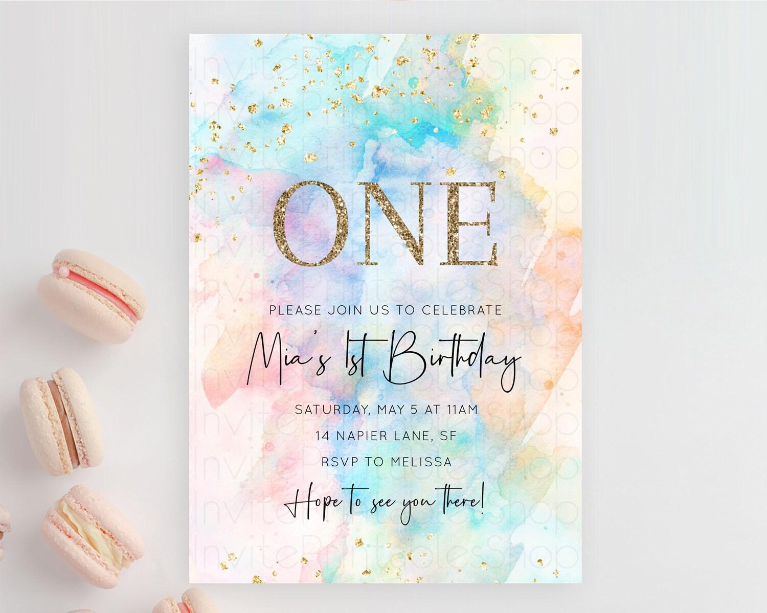 Rainbow Birthday Invitation Colorful Pastel Watercolor Invitation Gold Glitter Sprinkles Ombre Pastel 1st 2nd 3rd Birthday D10266