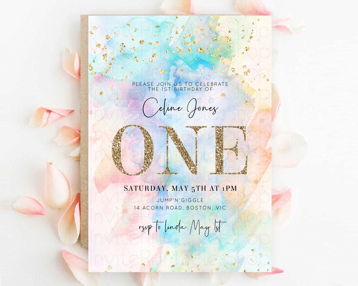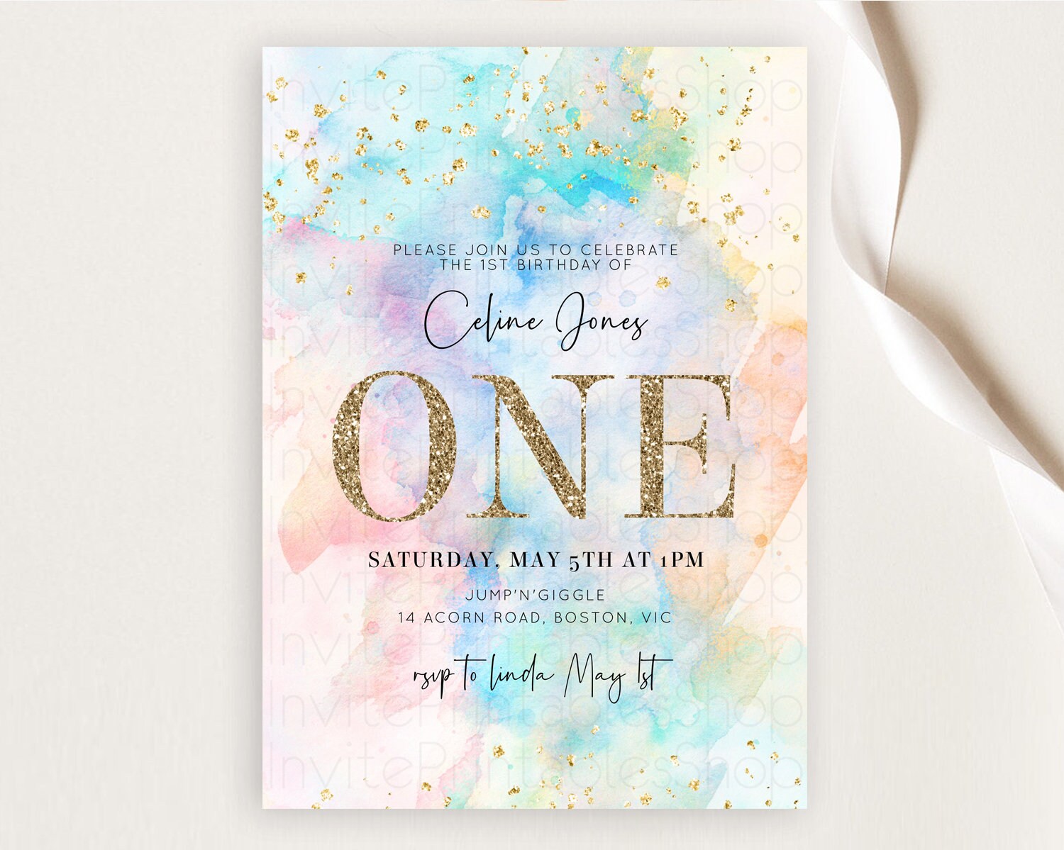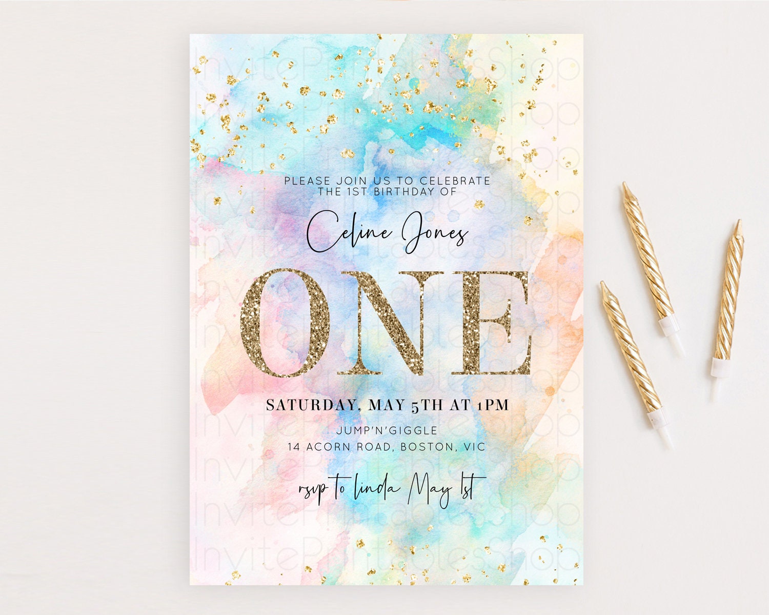 Rainbow Birthday Invitation Colorful Pastel Watercolor Invitation Gold Glitter Sprinkles Ombre Pastel 1st 2nd 3rd Birthday D10266