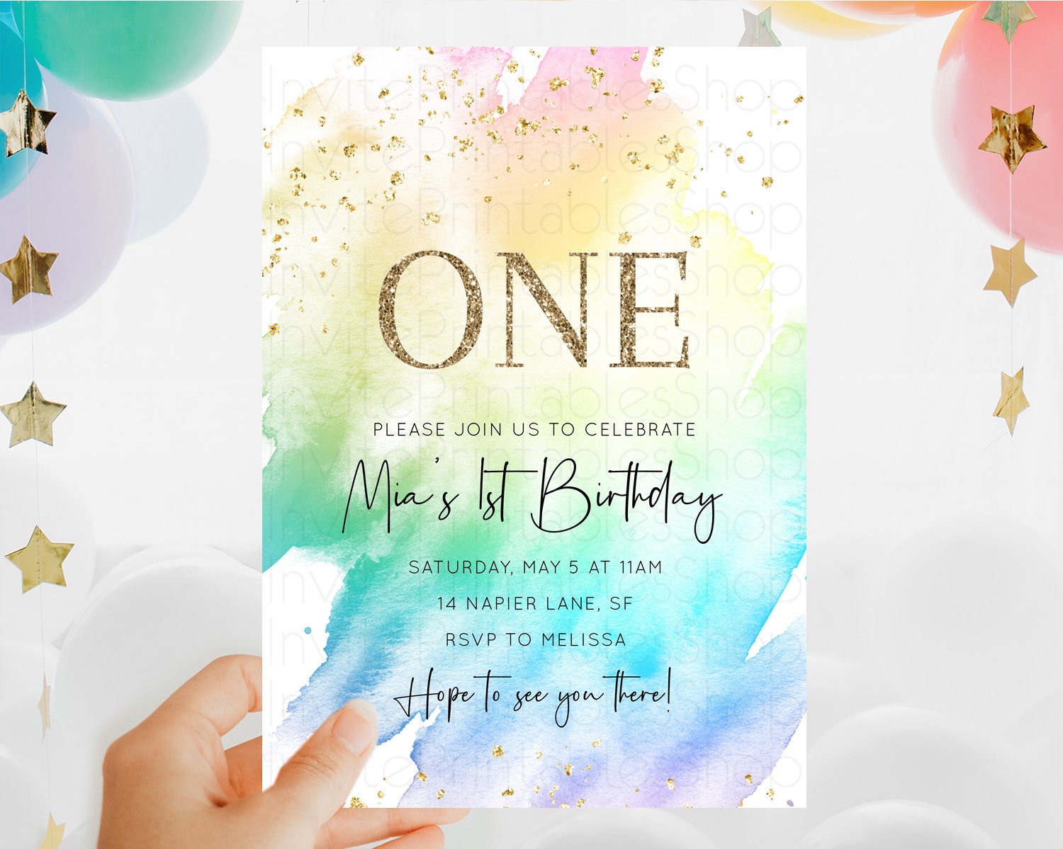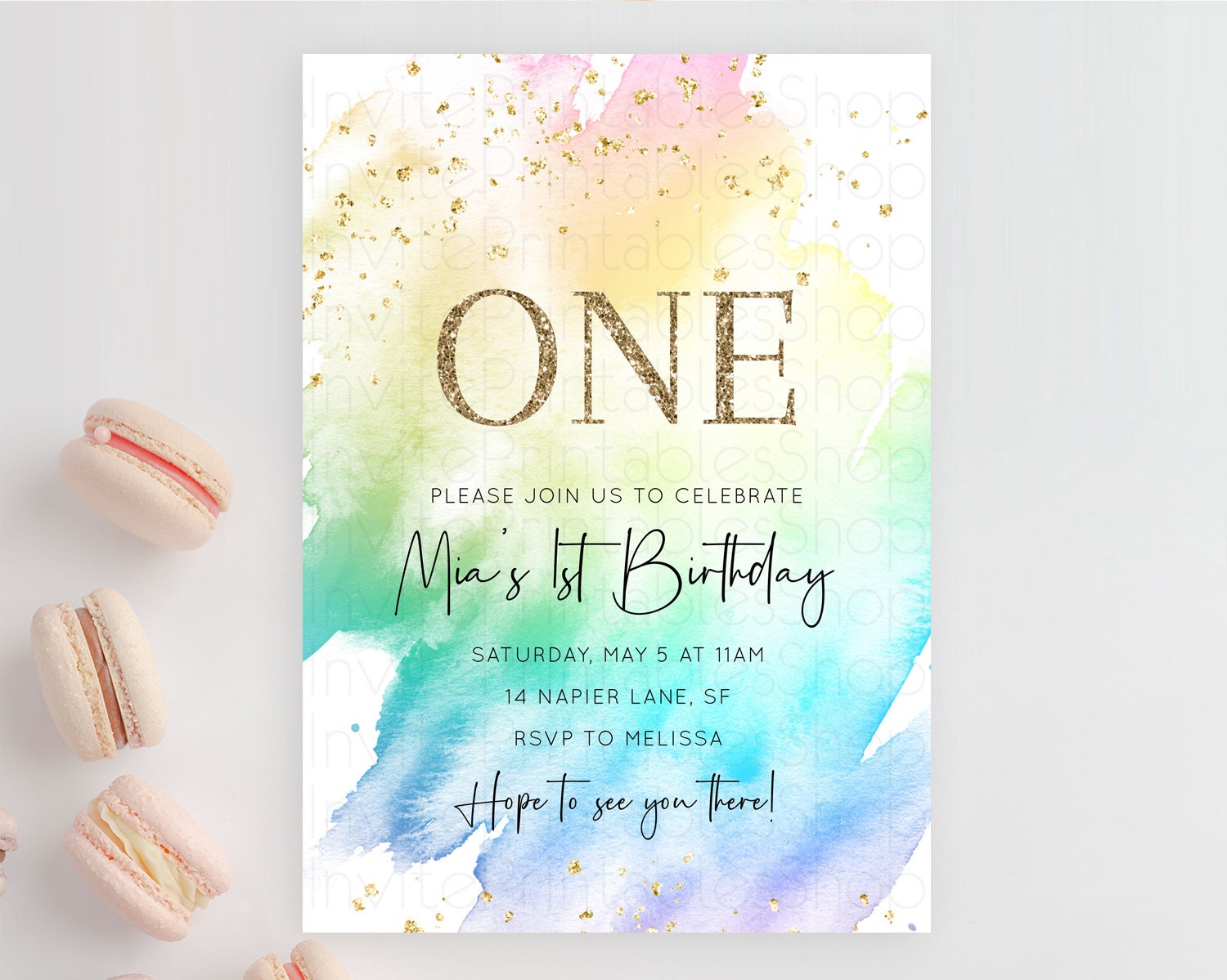 Rainbow Birthday Invitation Colorful Pastel Watercolor Invitation Gold Glitter Sprinkles Ombre Pastel 1st 2nd 3rd Birthday D10279