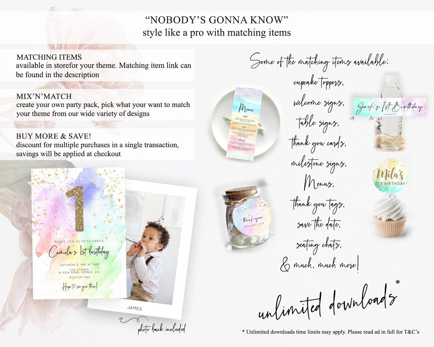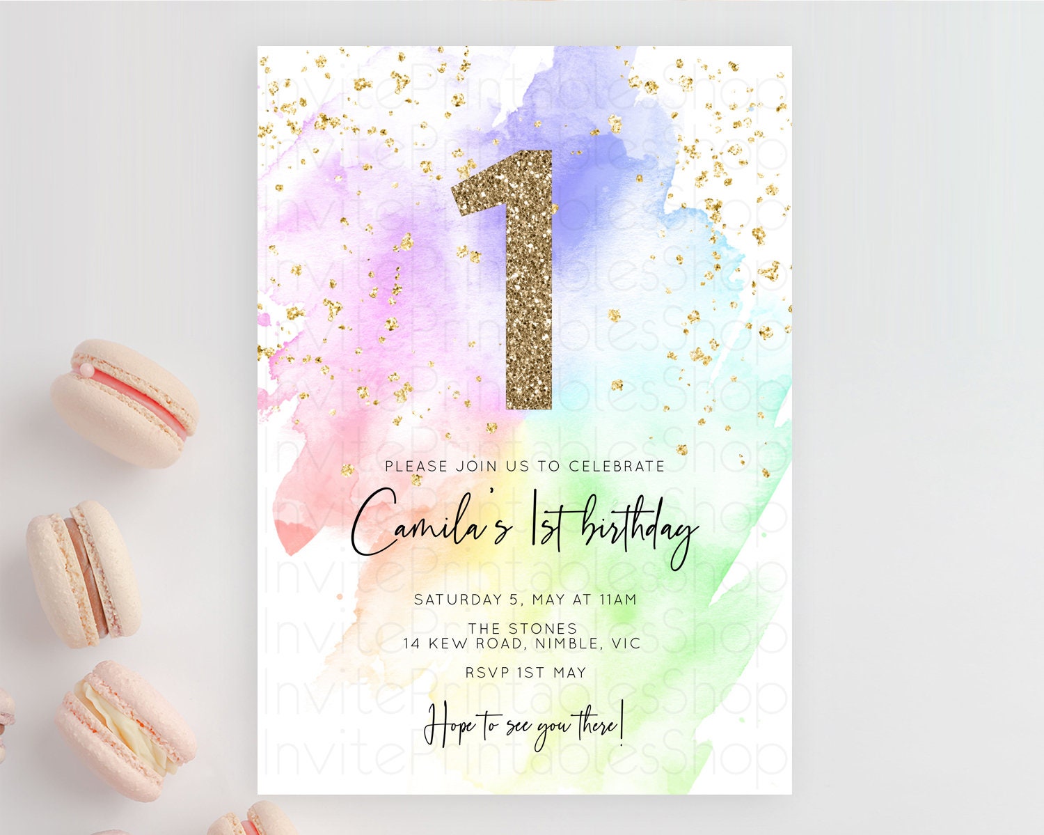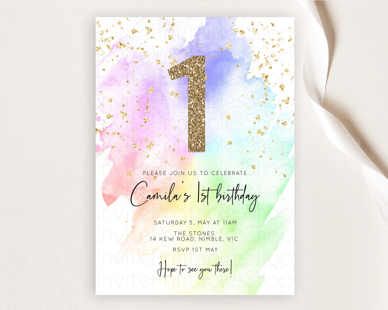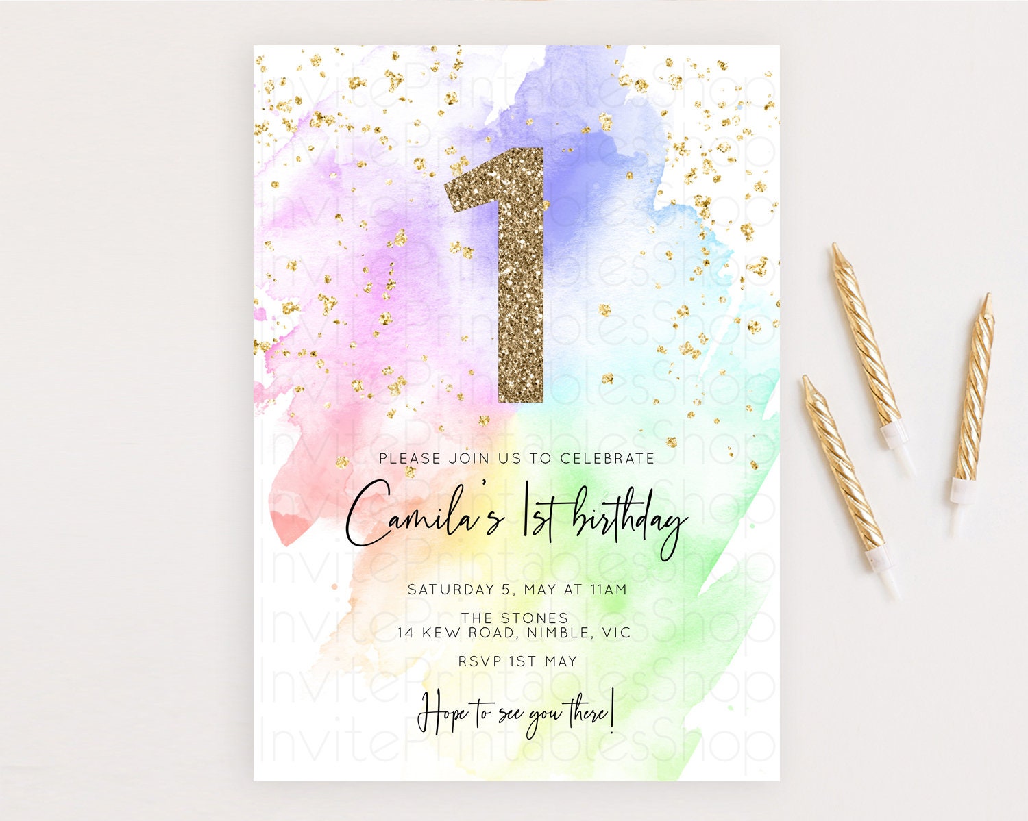Rainbow Birthday Invitation Colorful Pastel Watercolor Invitation Gold Glitter Sprinkles Ombre Pastel 1st 2nd 3rd Birthday D10316