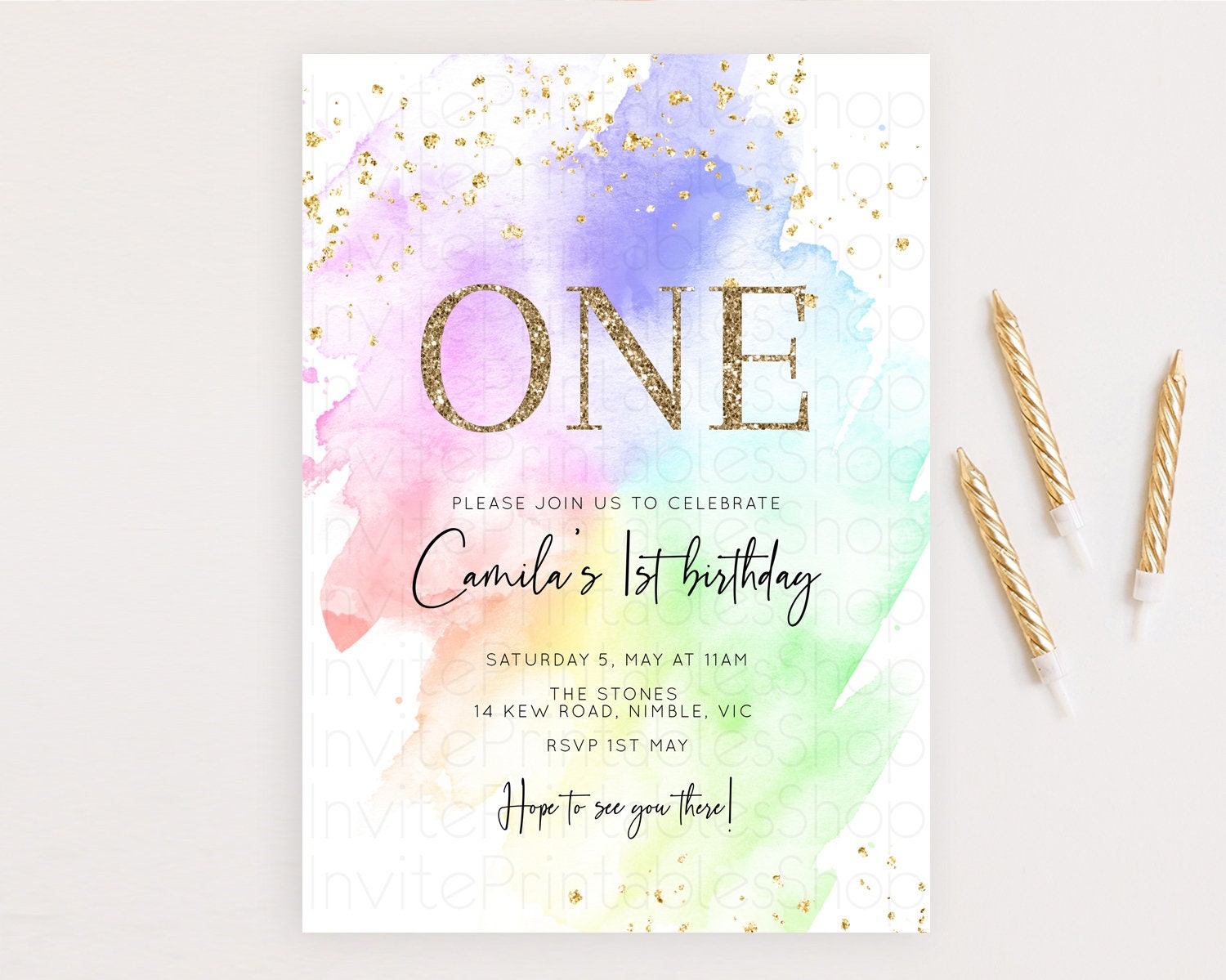 Rainbow Birthday Invitation Colorful Pastel Watercolor Invitation Gold Glitter Sprinkles Ombre Pastel 1st 2nd 3rd Birthday D10316