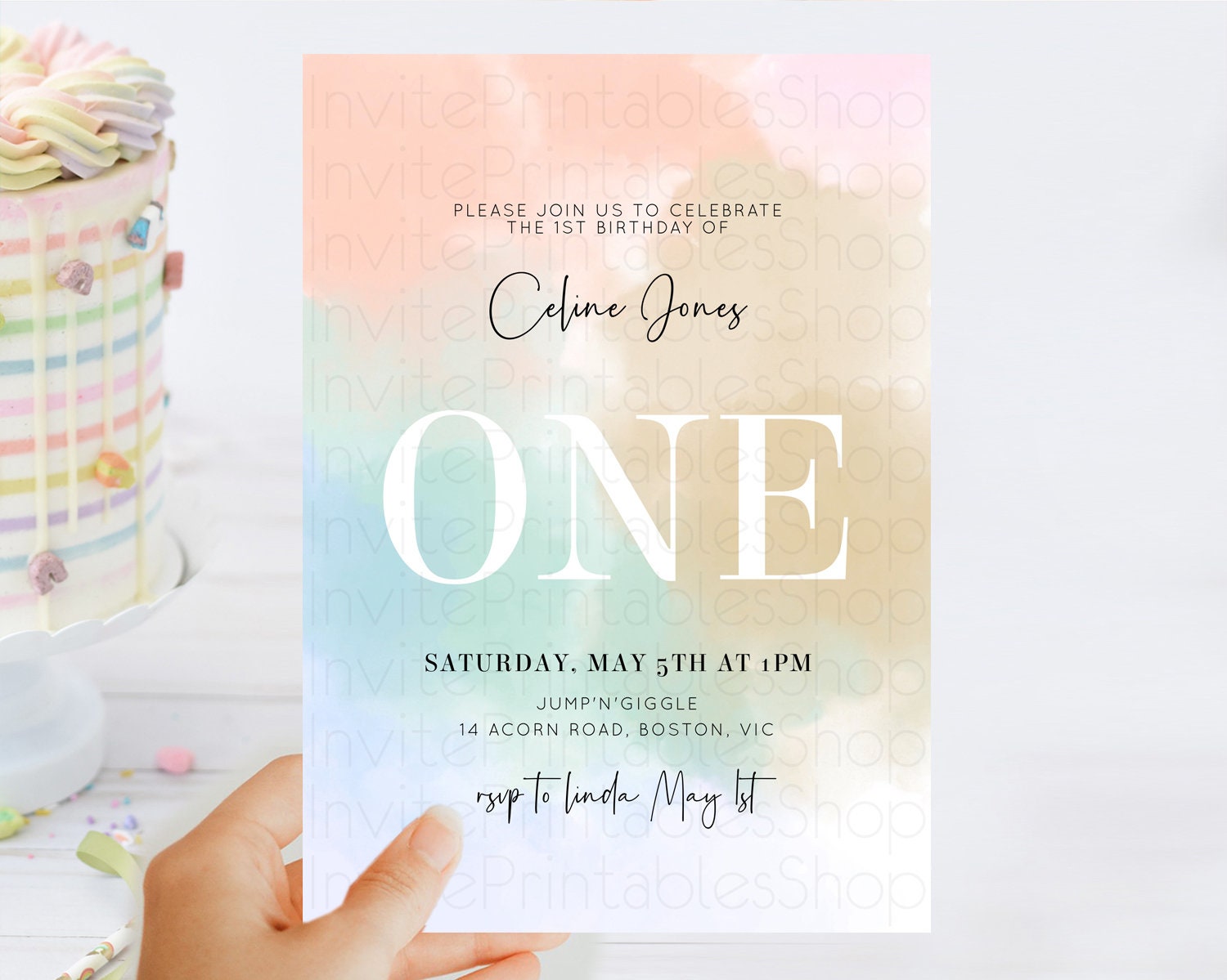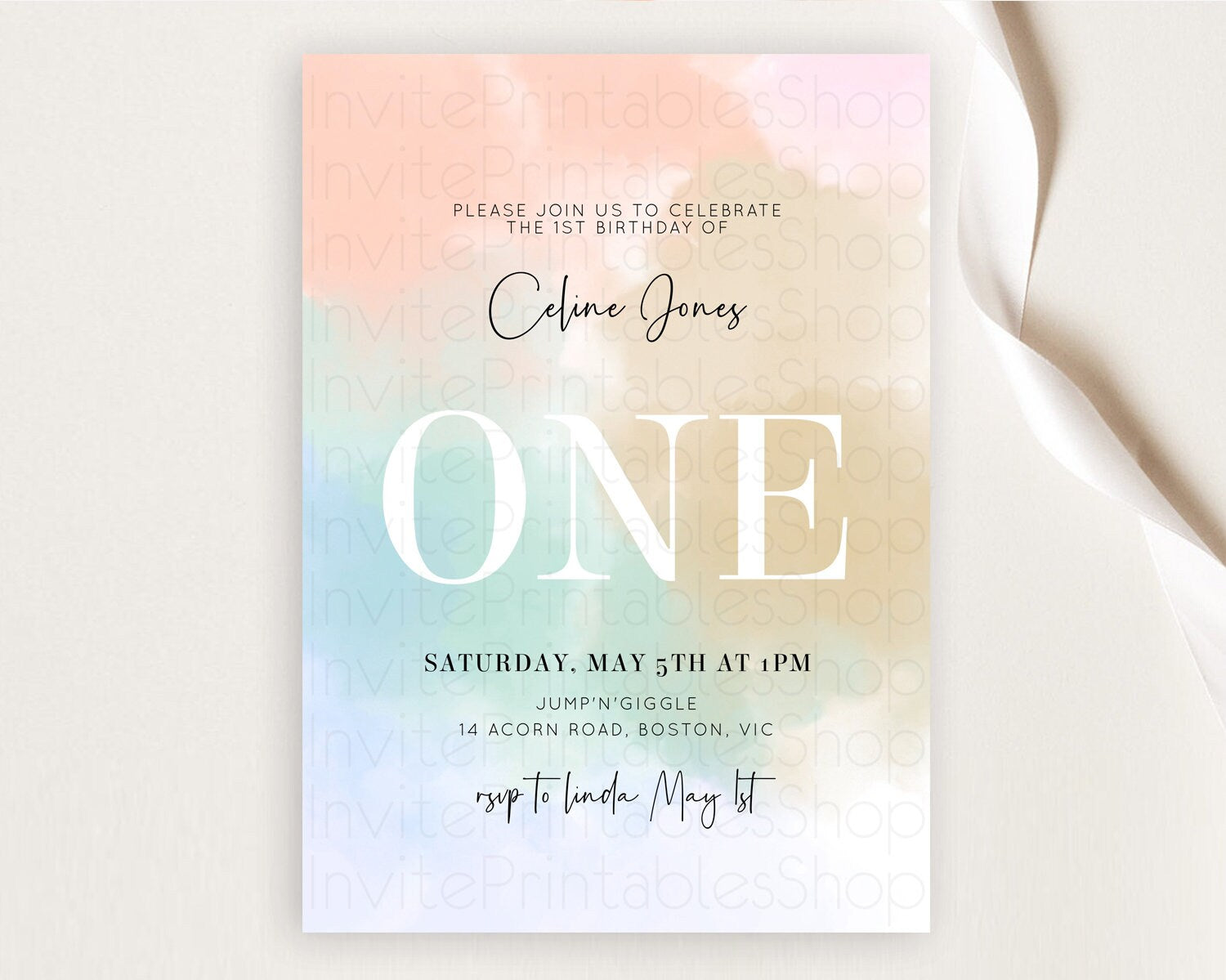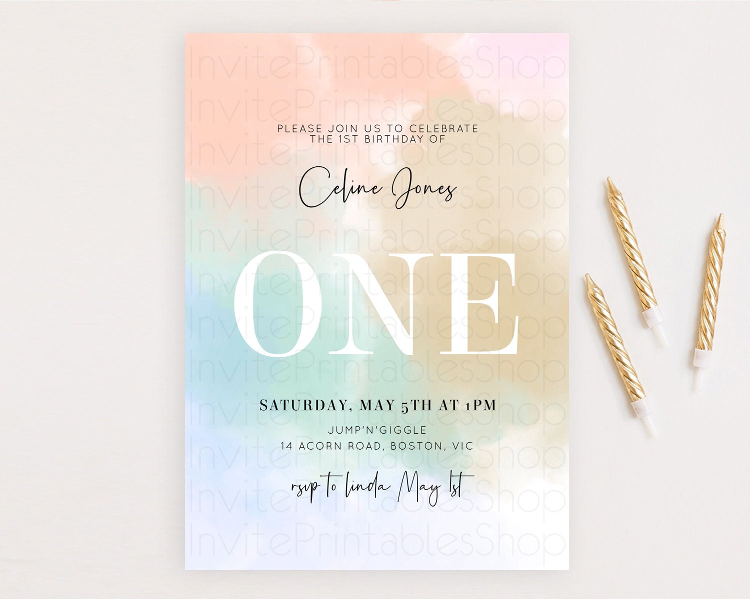 Rainbow Birthday Invitation Colorful Pastel Watercolor Invitation Gold Glitter Sprinkles Ombre Pastel 1st 2nd 3rd Birthday D10370