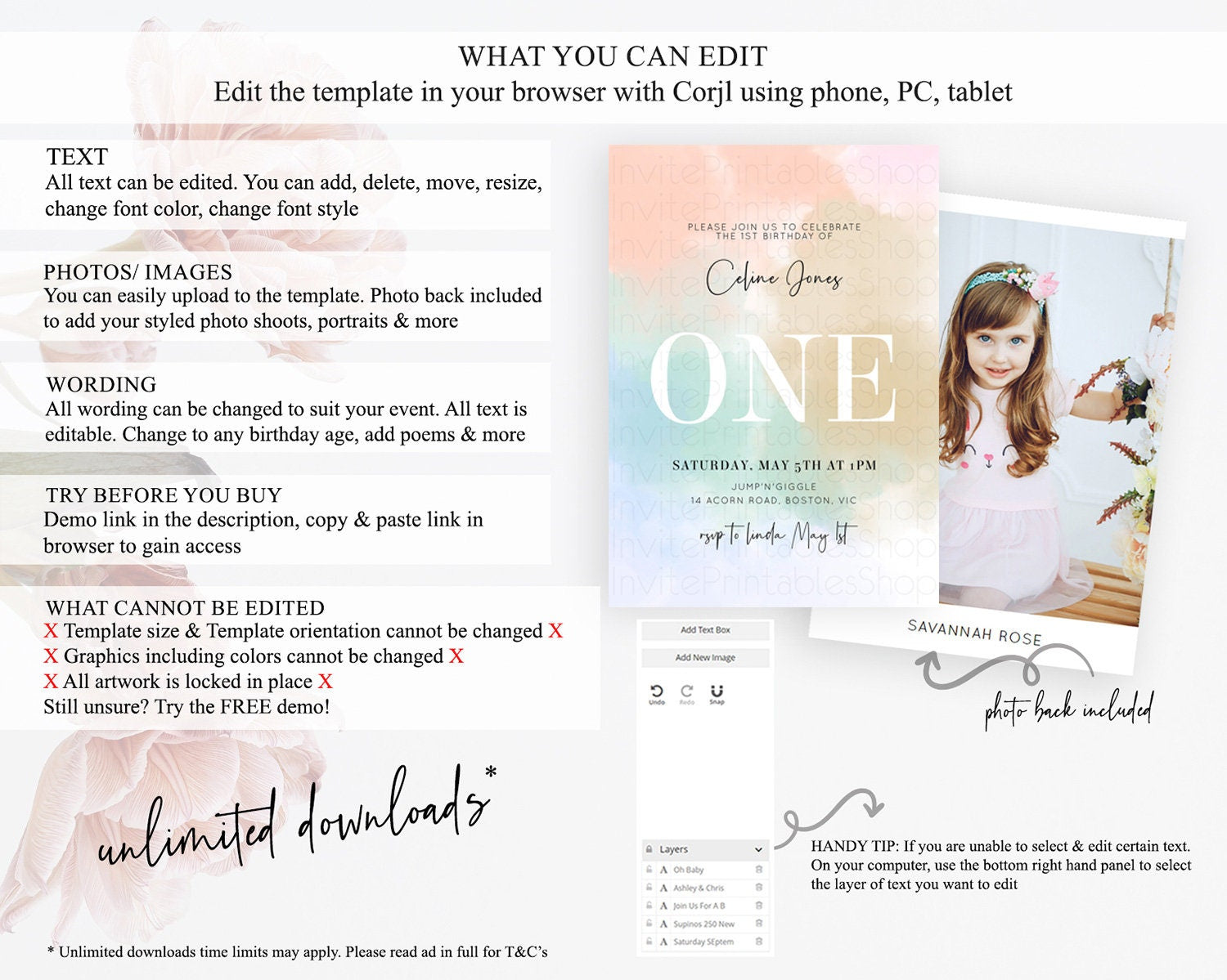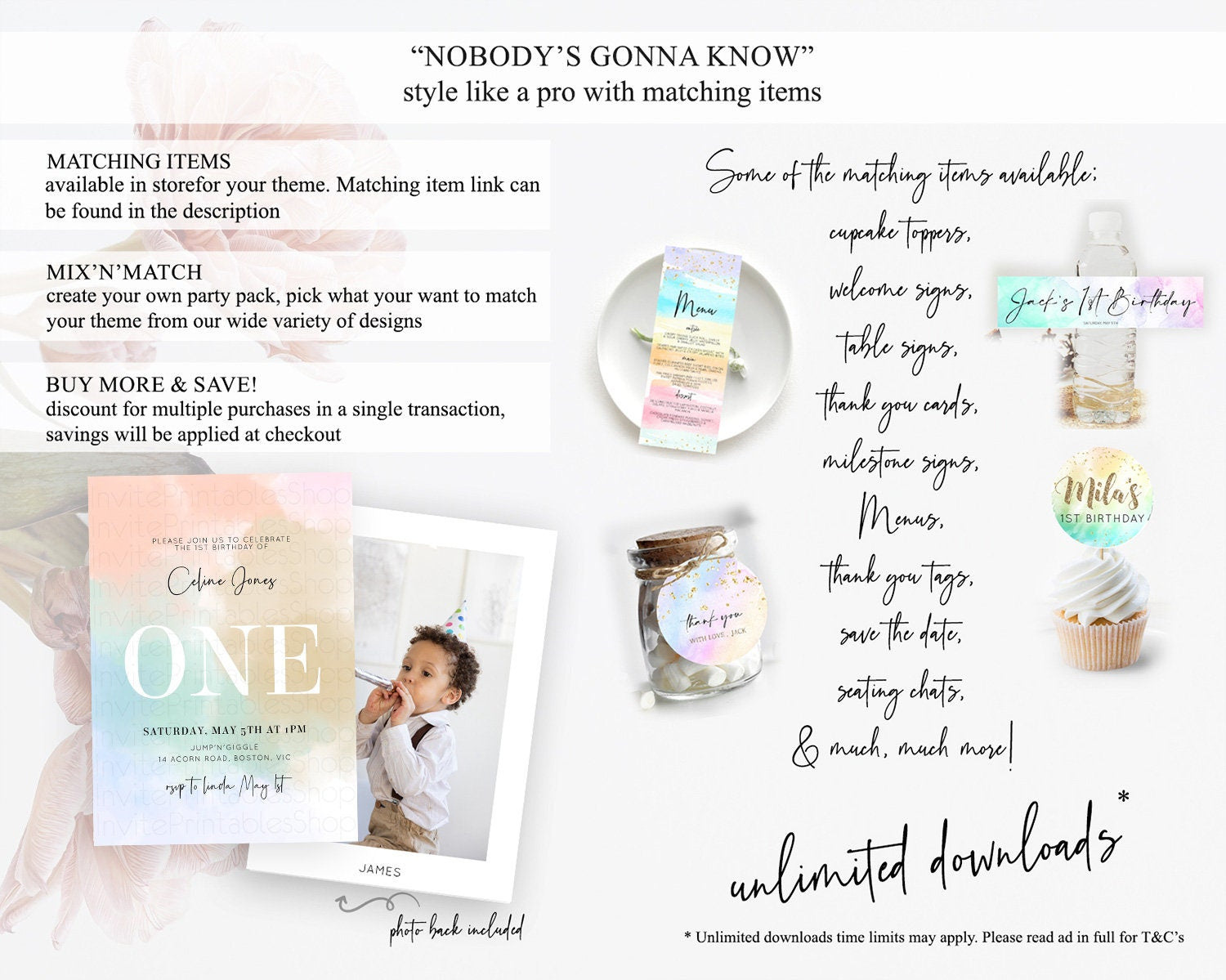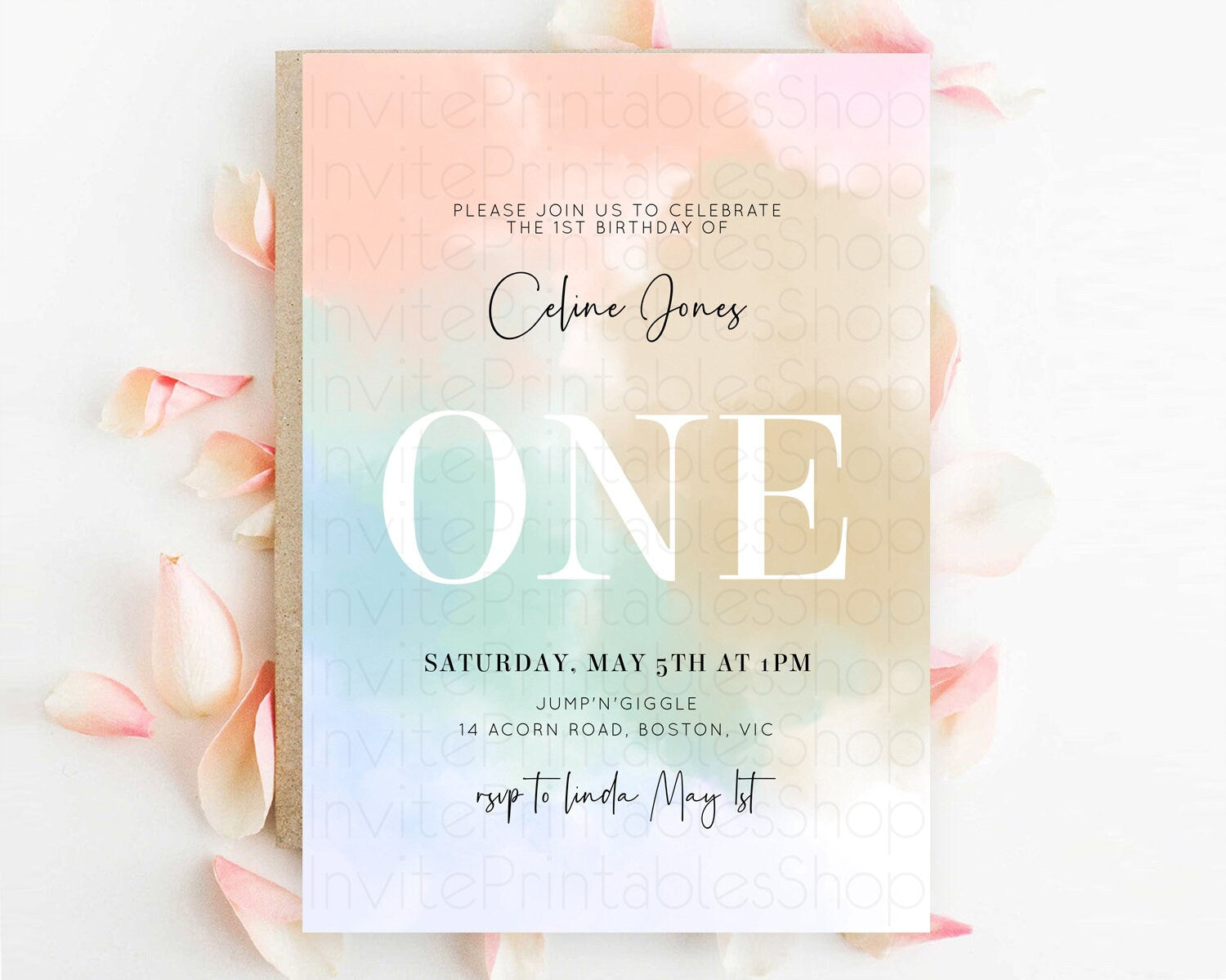 Rainbow Birthday Invitation Colorful Pastel Watercolor Invitation Gold Glitter Sprinkles Ombre Pastel 1st 2nd 3rd Birthday D10370