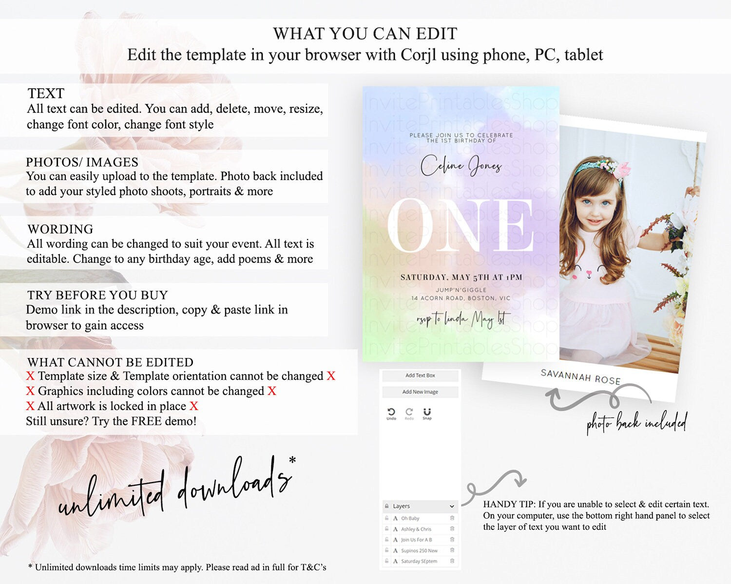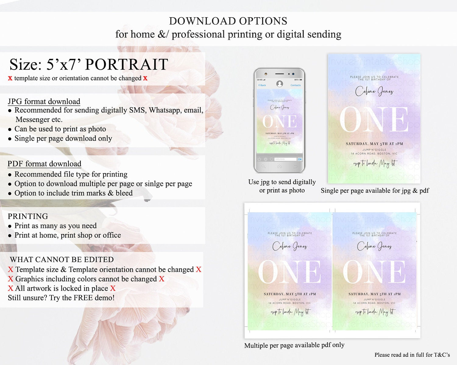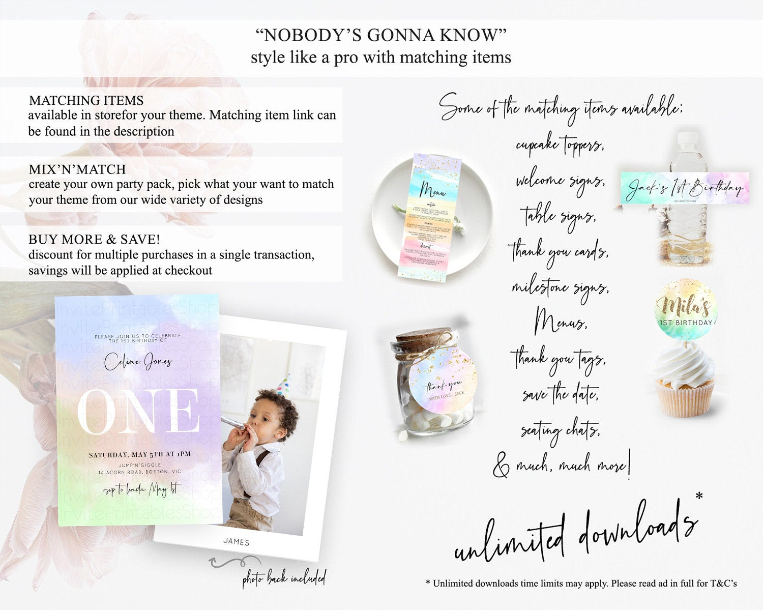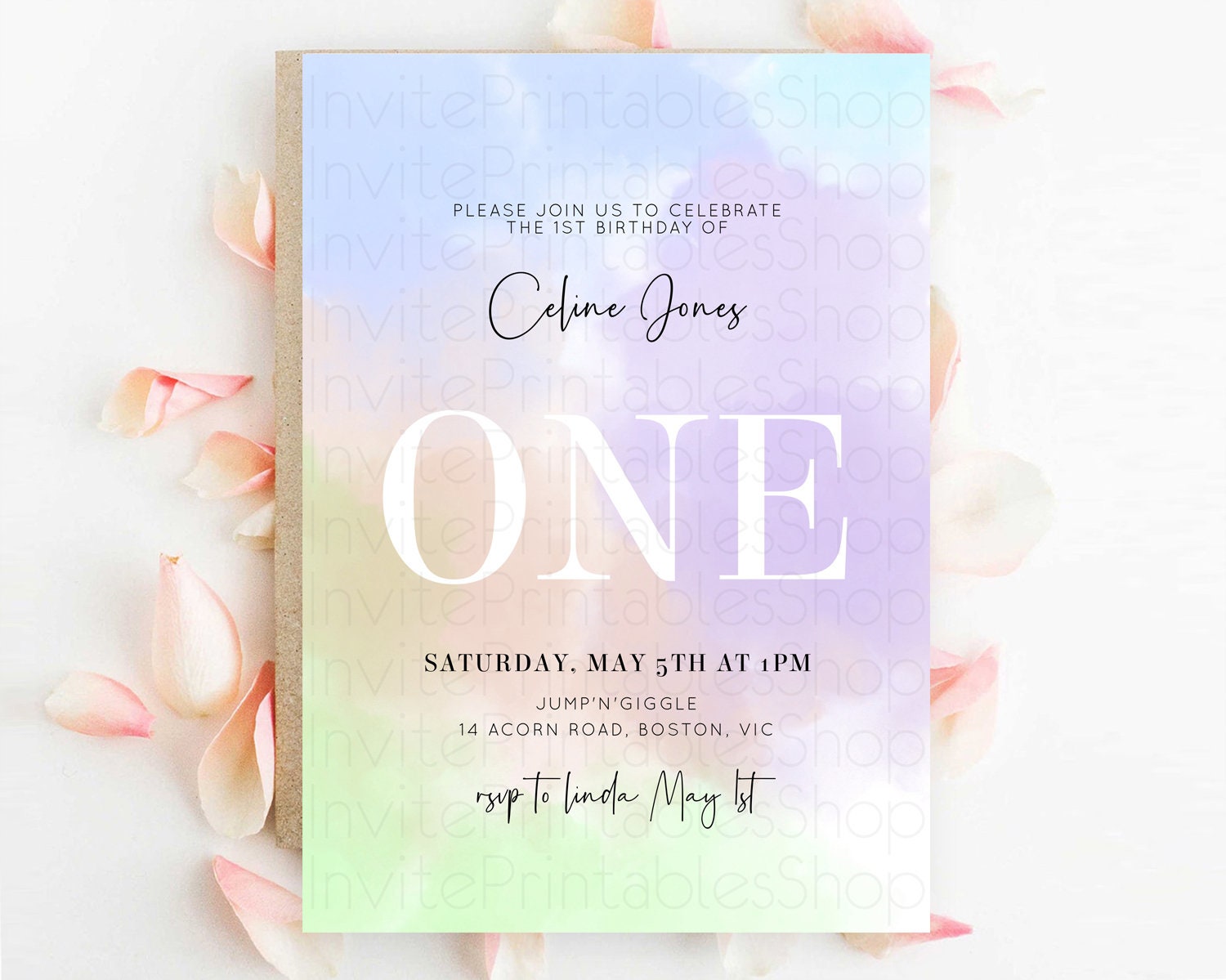 Rainbow Birthday Invitation Colorful Pastel Watercolor Invitation Gold Glitter Sprinkles Ombre Pastel 1st 2nd 3rd Birthday D10371