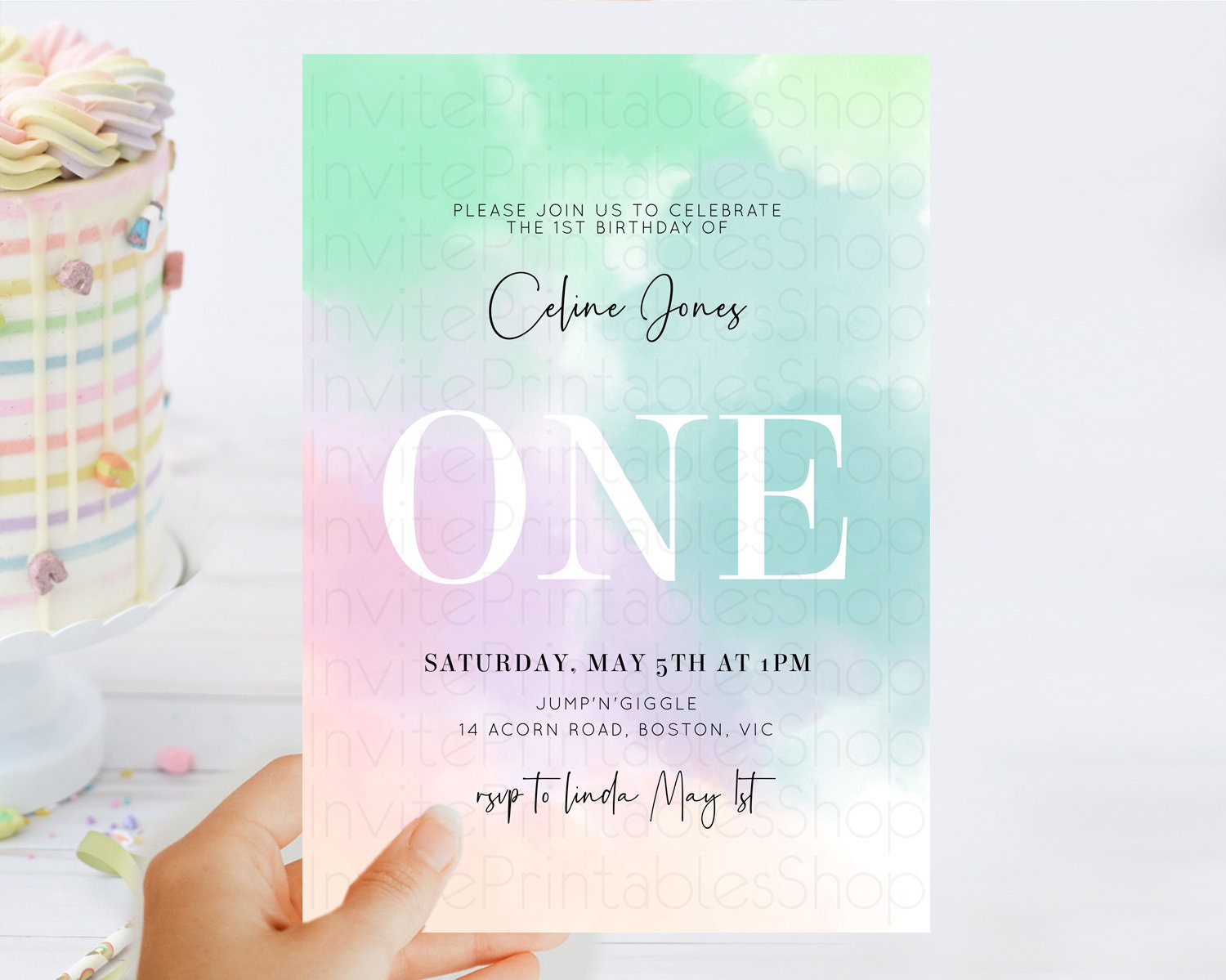 Rainbow Birthday Invitation Colorful Pastel Watercolor Invitation Gold Glitter Sprinkles Ombre Pastel 1st 2nd 3rd Birthday D10375