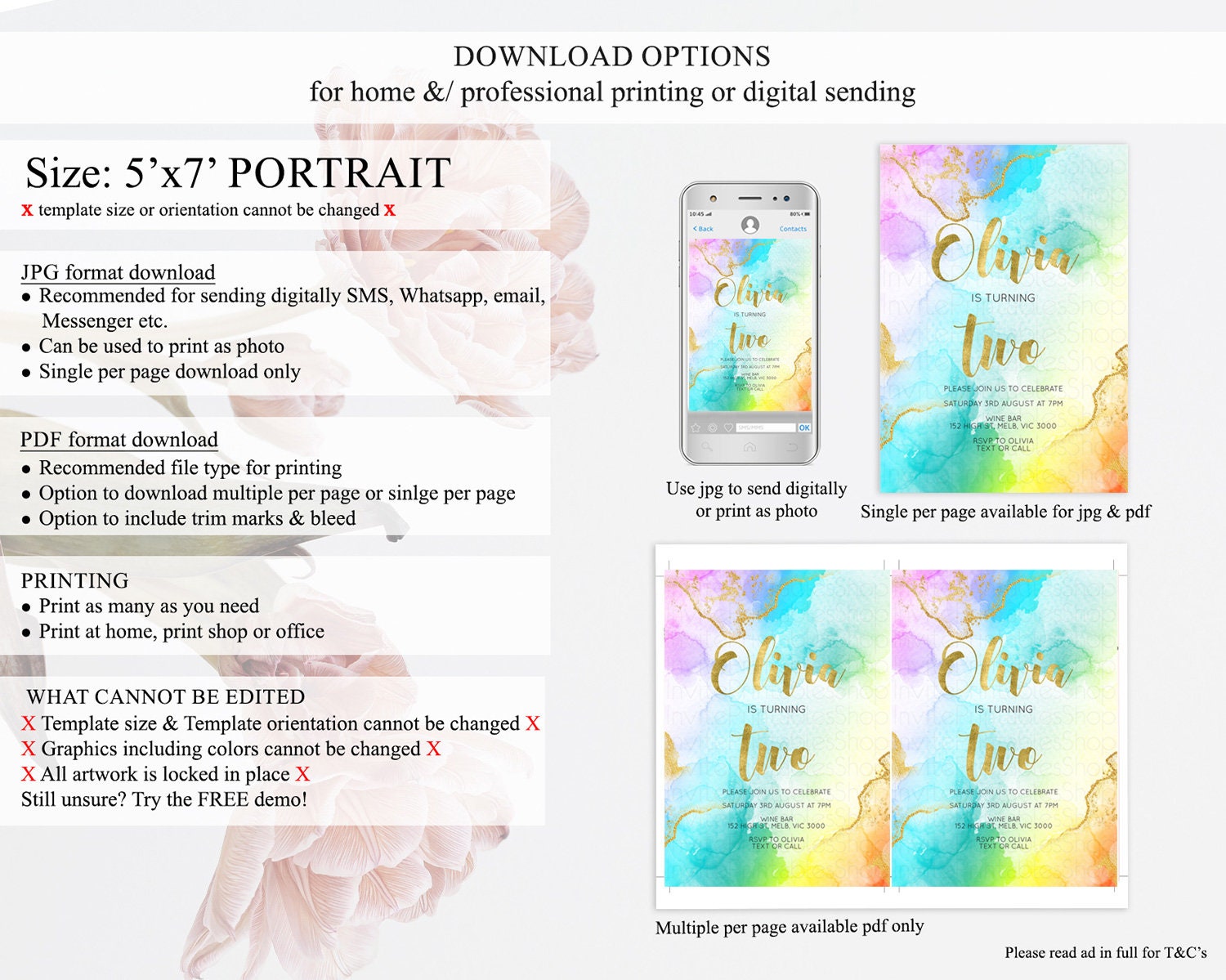 Rainbow Birthday Invitation Colorful Pastel Watercolor Invitation Gold Glitter Sprinkles Ombre Pastel 1st 2nd 3rd Birthday D10392