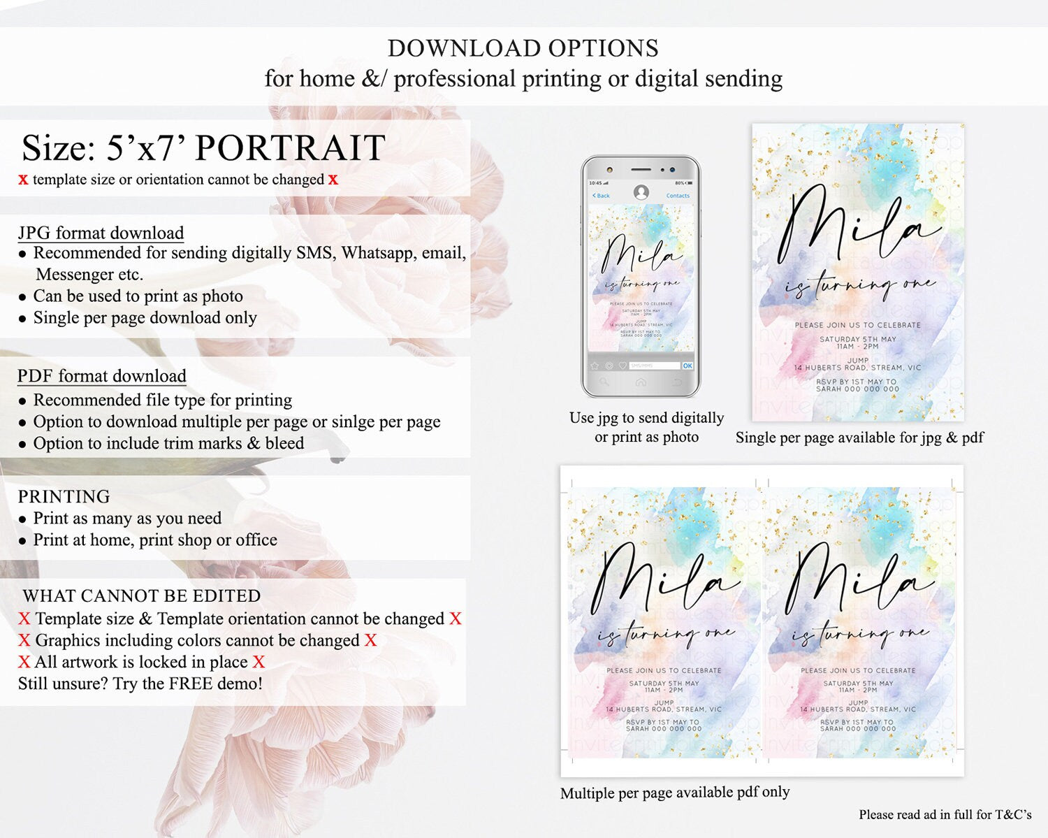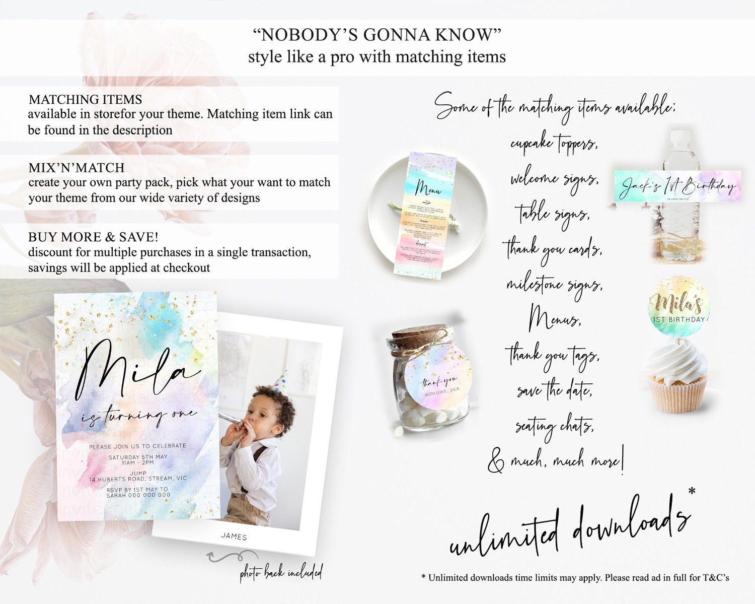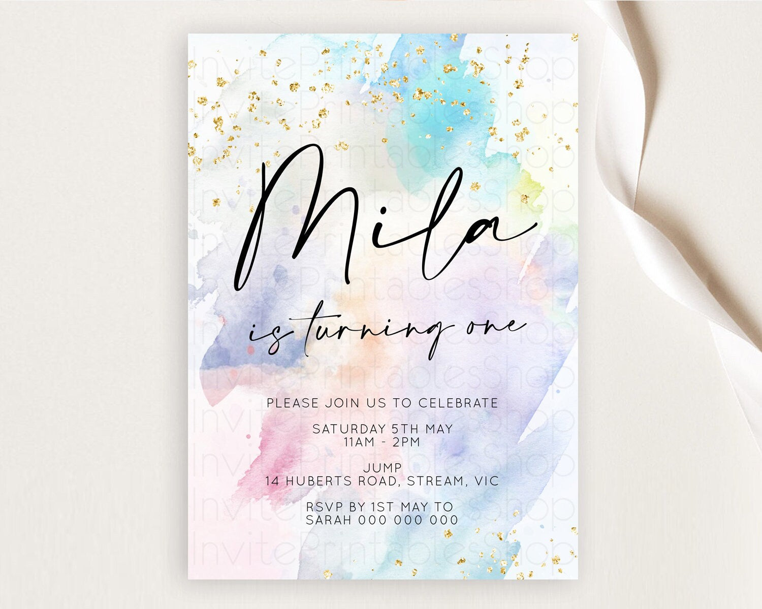 Rainbow Birthday Invitation Colorful Pastel Watercolor Invitation Gold Glitter Sprinkles Ombre Pastel 1st 2nd 3rd Birthday D10420