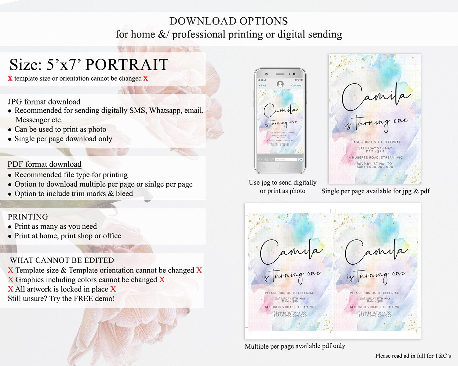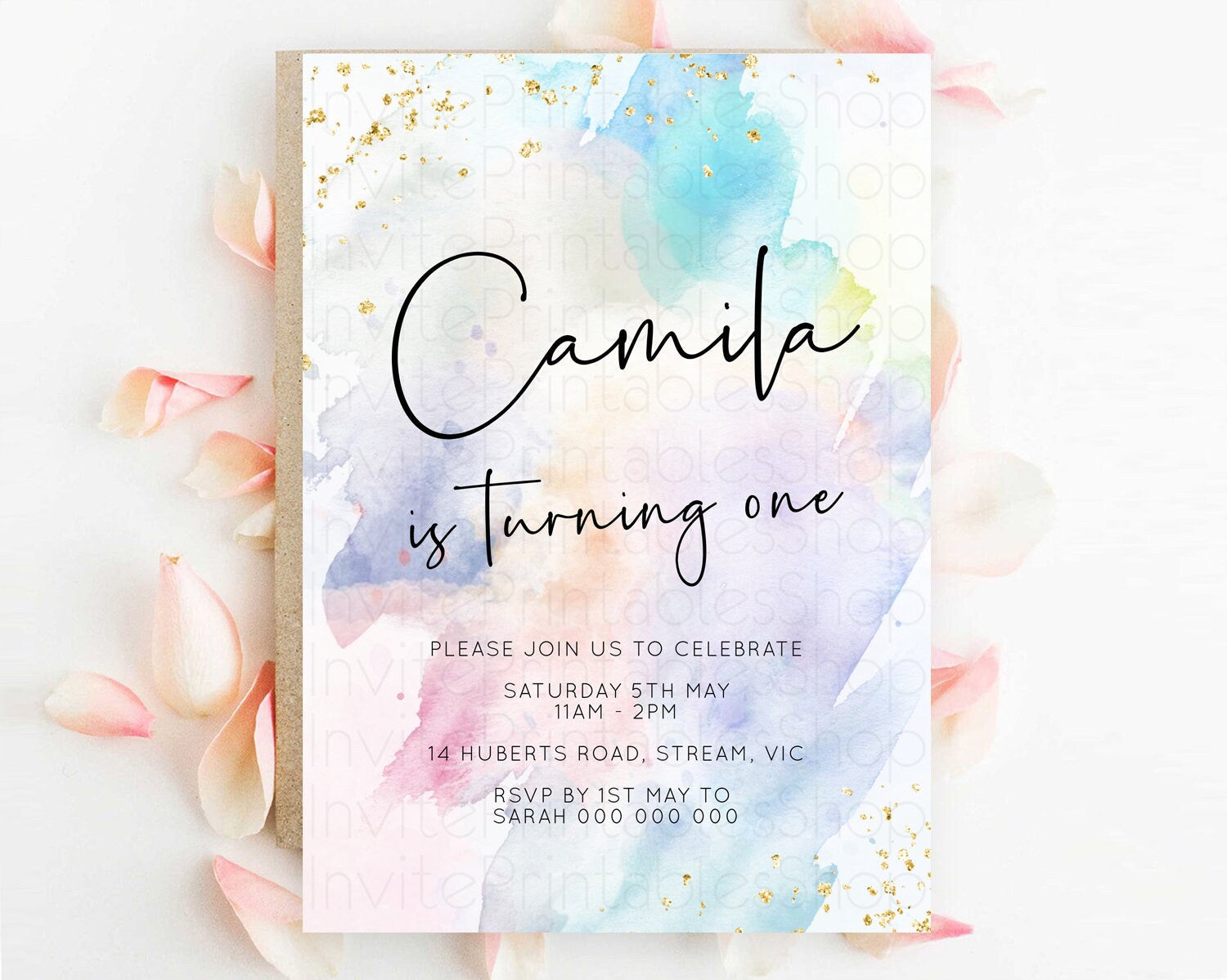 Rainbow Birthday Invitation Colorful Pastel Watercolor Invitation Gold Glitter Sprinkles Ombre Pastel 1st 2nd 3rd Birthday D10422