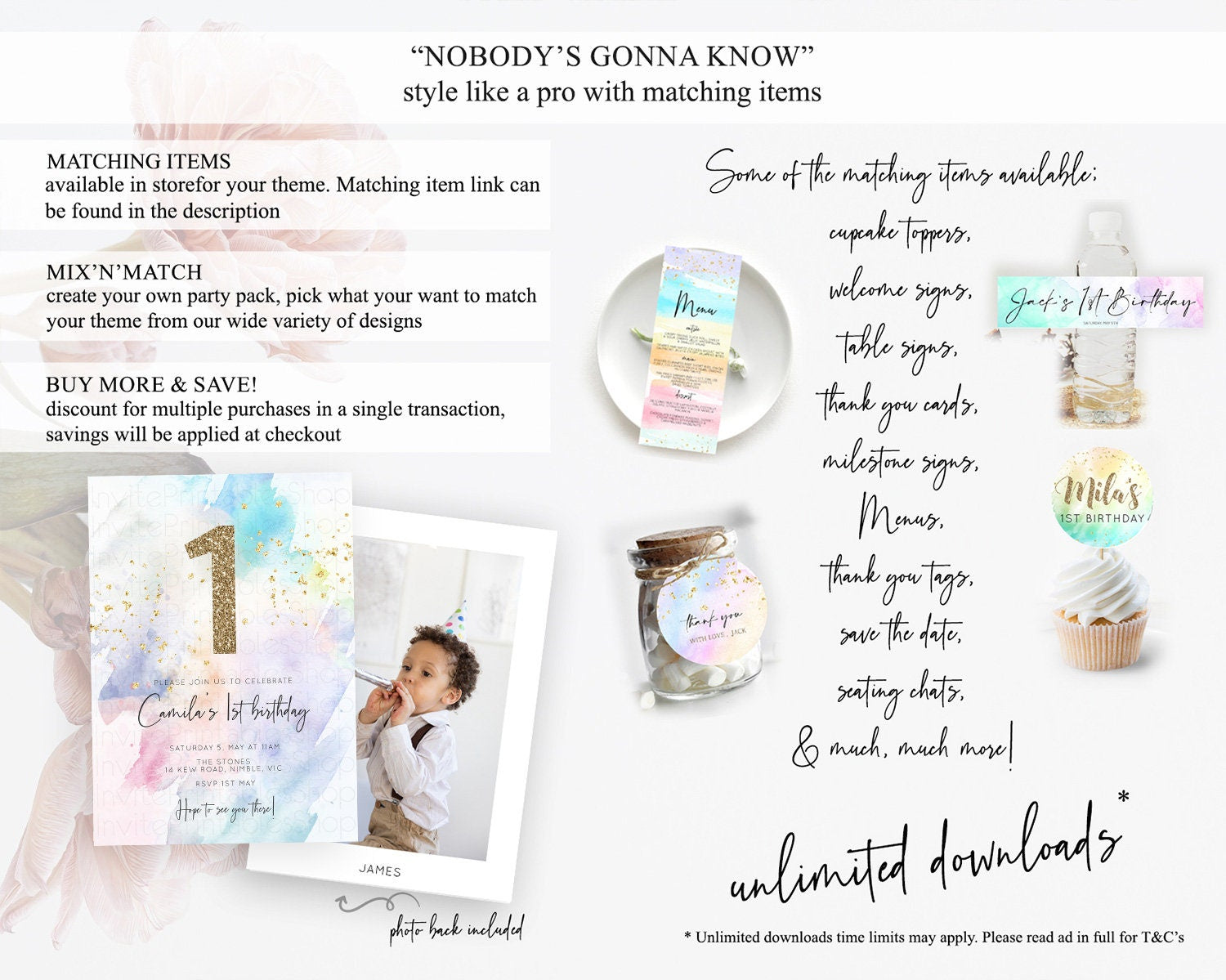 Rainbow Birthday Invitation Colorful Pastel Watercolor Invitation Gold Glitter Sprinkles Ombre Pastel 1st 2nd 3rd Birthday D10424