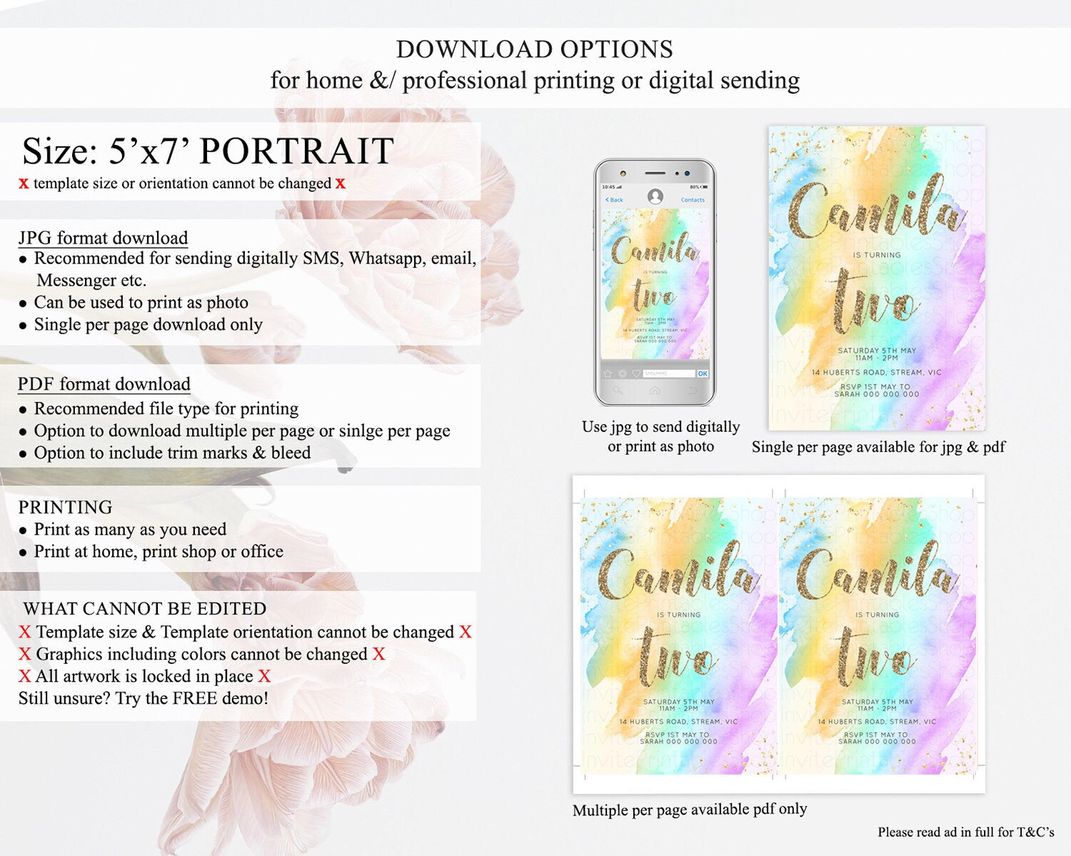 Rainbow Birthday Invitation Colorful Pastel Watercolor Invitation Gold Glitter Sprinkles Ombre Pastel 1st 2nd 3rd Birthday D10426