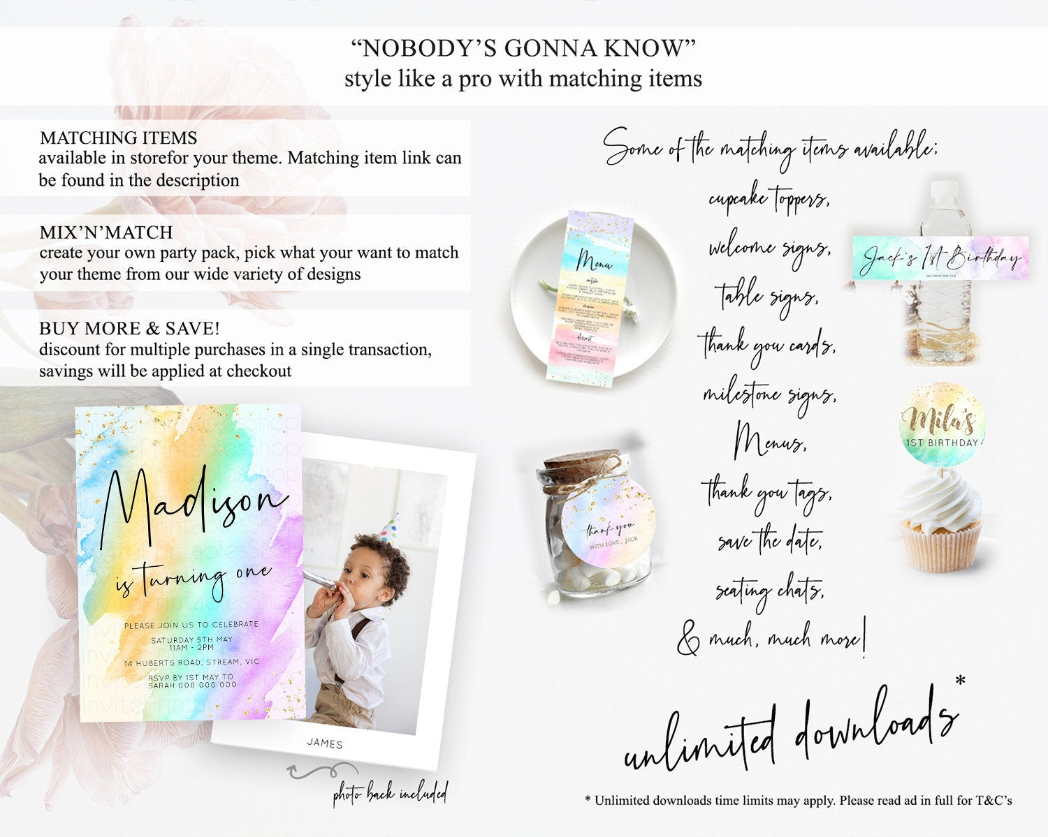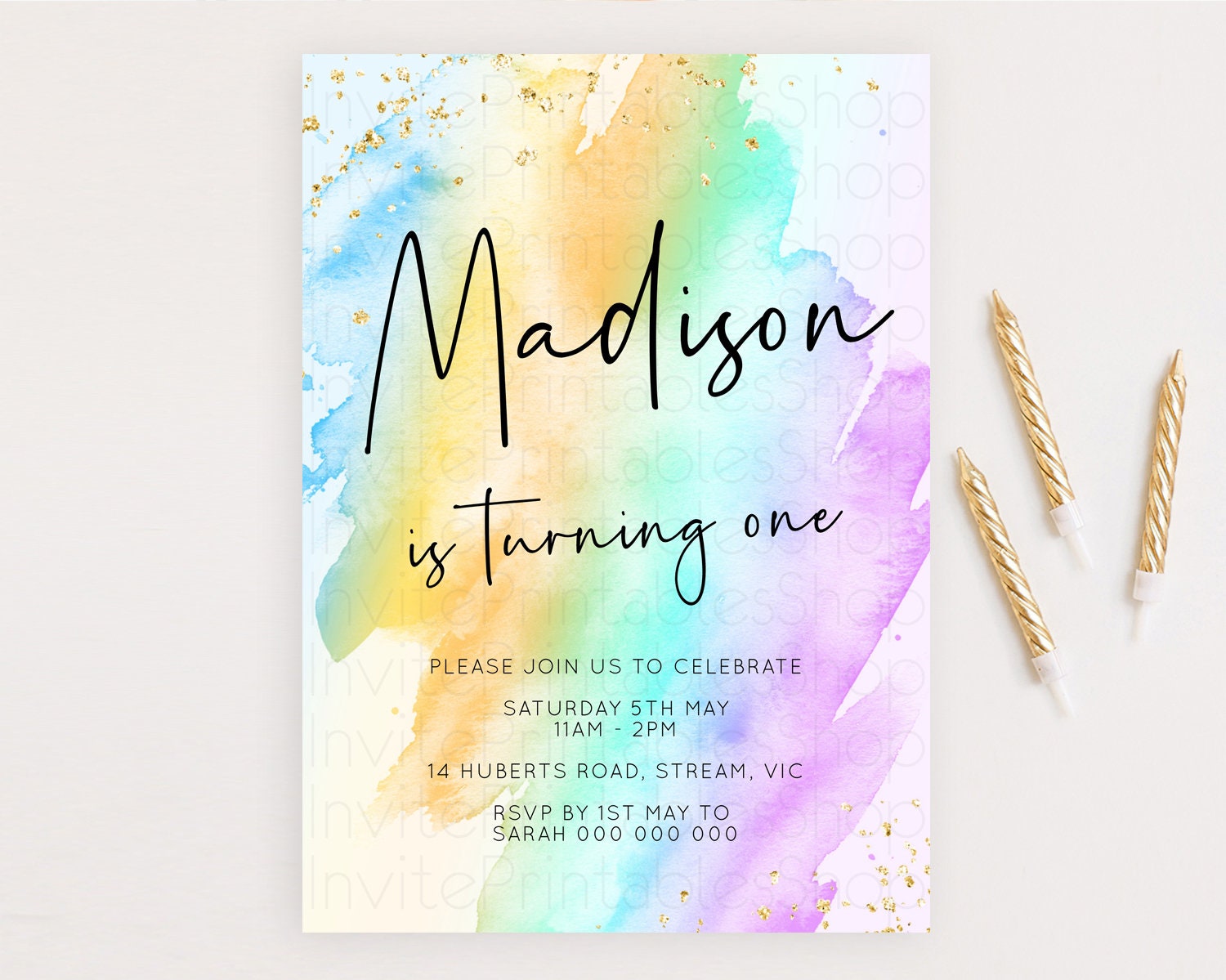 Rainbow Birthday Invitation Colorful Pastel Watercolor Invitation Gold Glitter Sprinkles Ombre Pastel 1st 2nd 3rd Birthday D10427