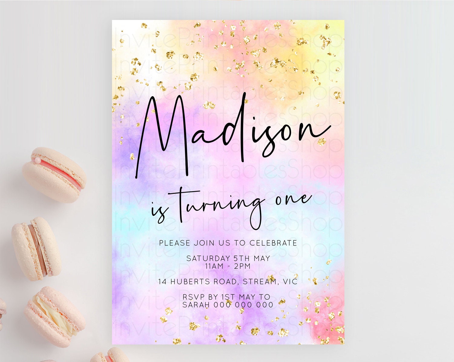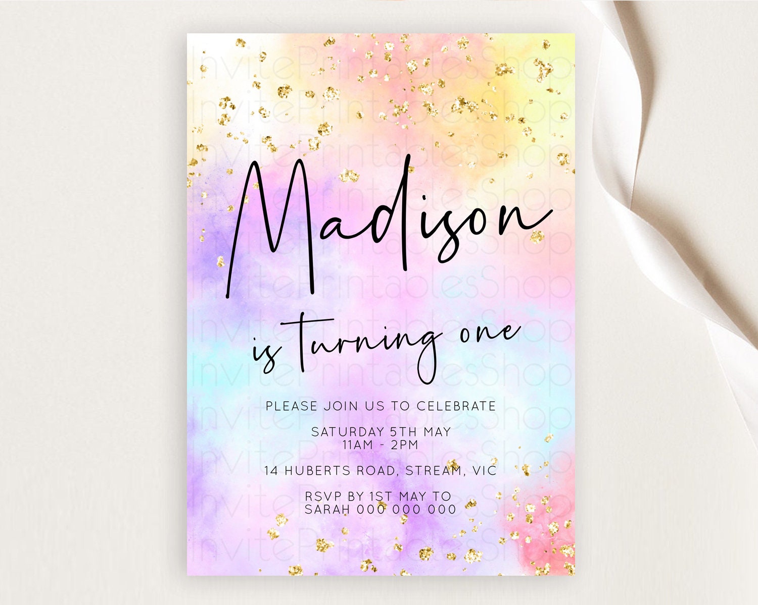 Rainbow Birthday Invitation Colorful Pastel Watercolor Invitation Gold Glitter Sprinkles Ombre Pastel 1st 2nd 3rd Birthday D10438