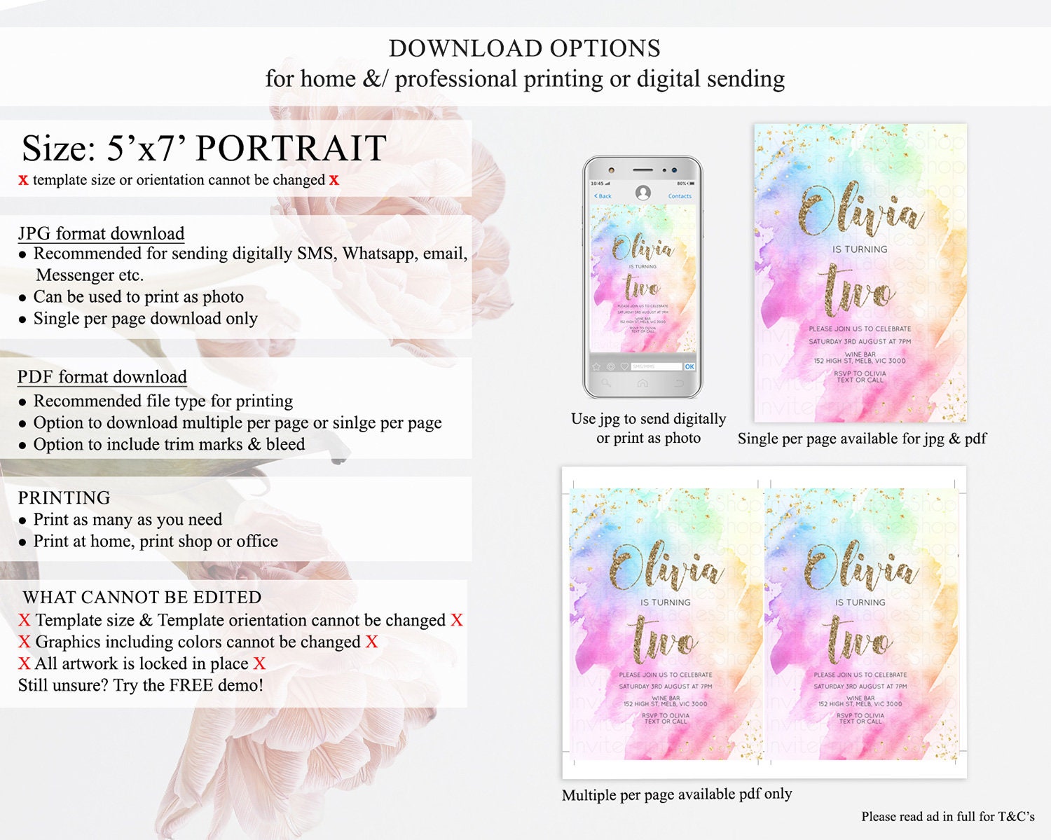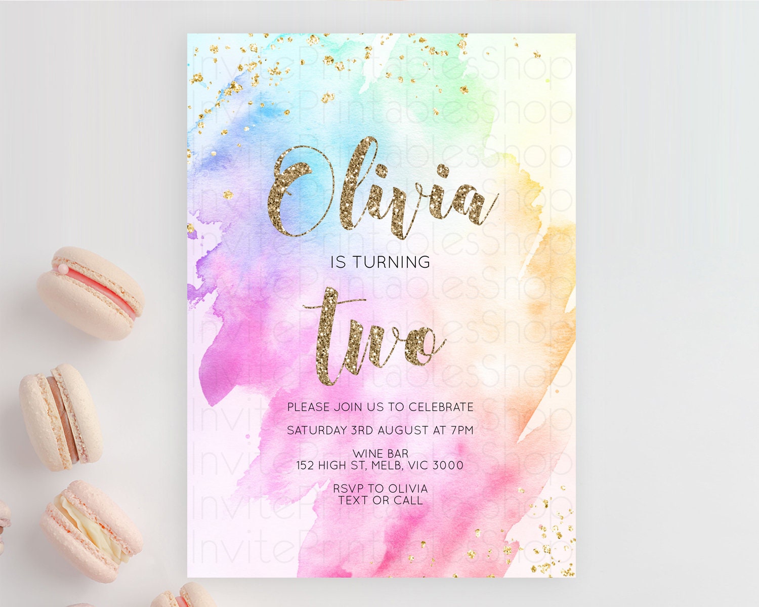 Rainbow Birthday Invitation Colorful Pastel Watercolor Invitation Gold Glitter Sprinkles Ombre Pastel 1st 2nd 3rd Birthday D10450