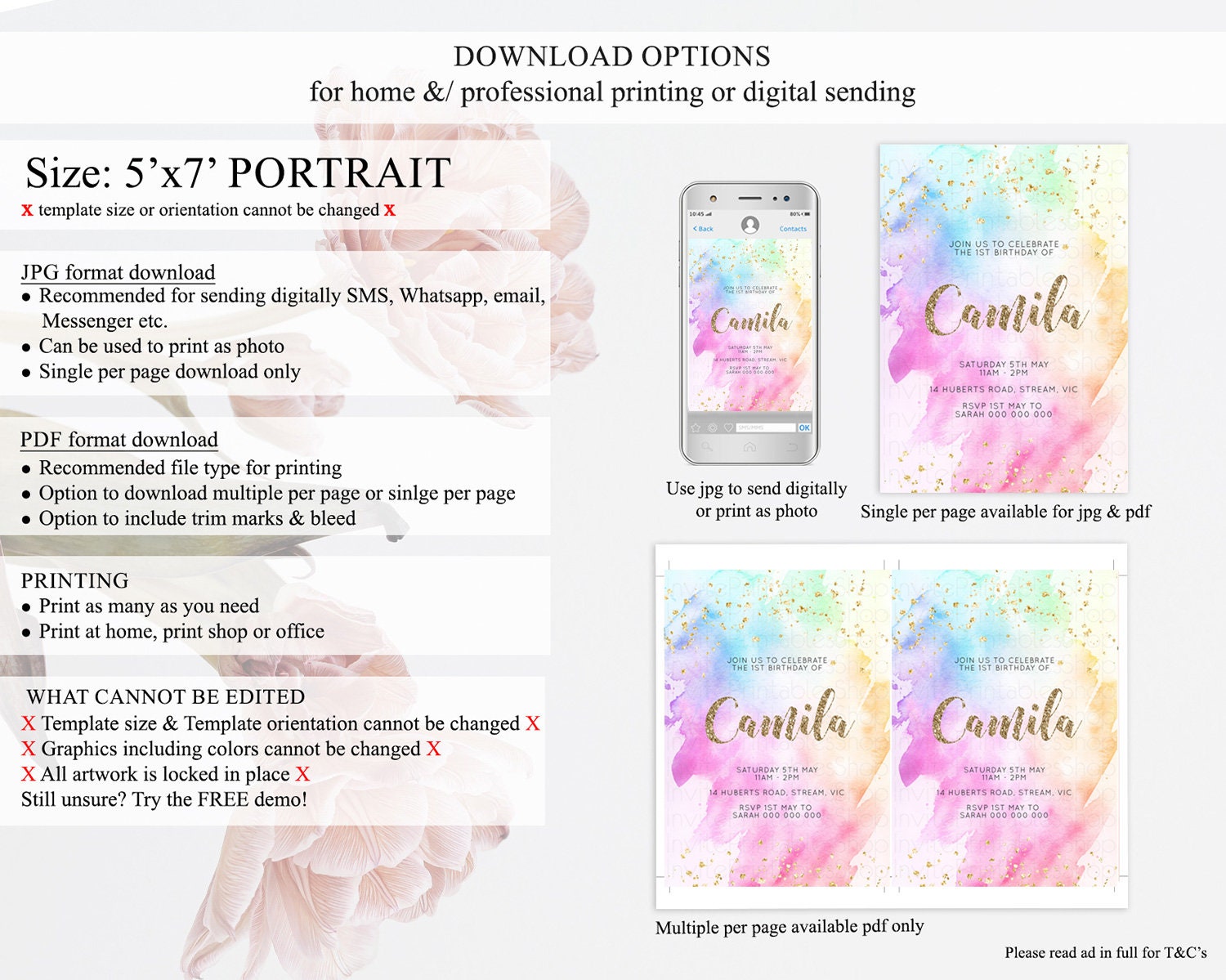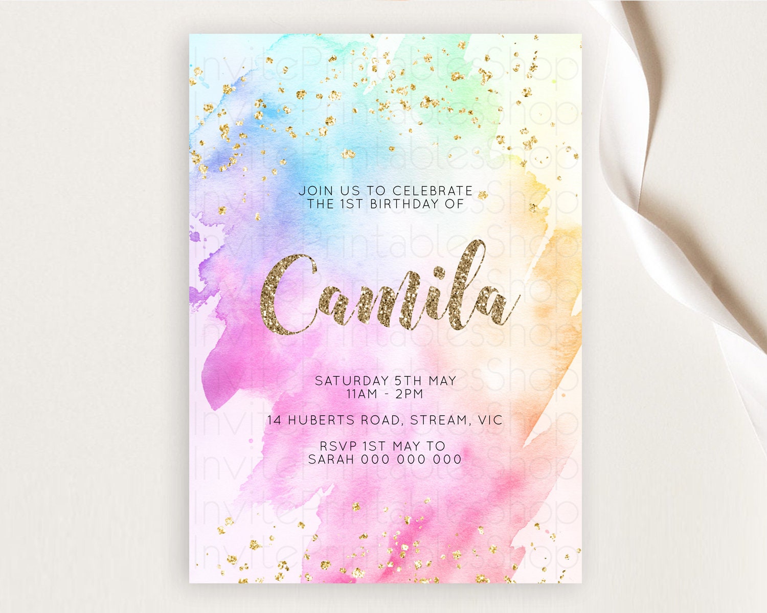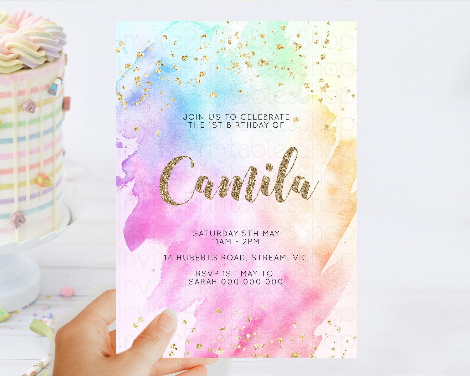 Rainbow Birthday Invitation Colorful Pastel Watercolor Invitation Gold Glitter Sprinkles Ombre Pastel 1st 2nd 3rd Birthday D10450