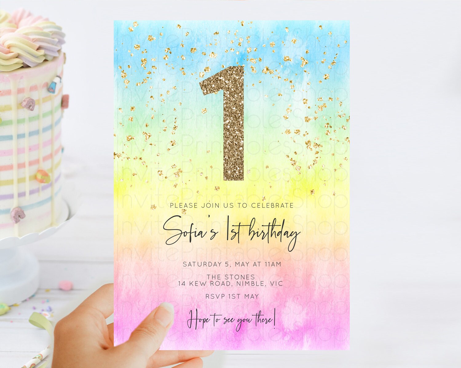 Rainbow Birthday Invitation Colorful Pastel Watercolor Invitation Gold Glitter Sprinkles Ombre Pastel 1st 2nd 3rd Birthday D10480