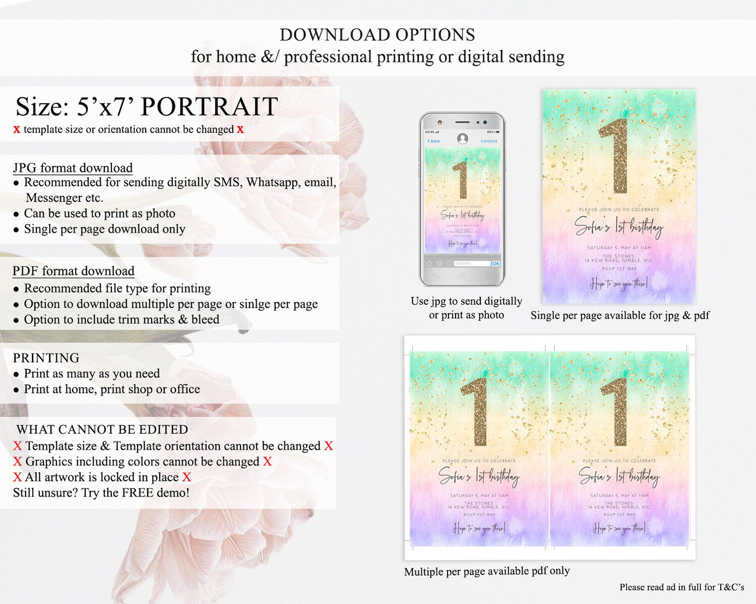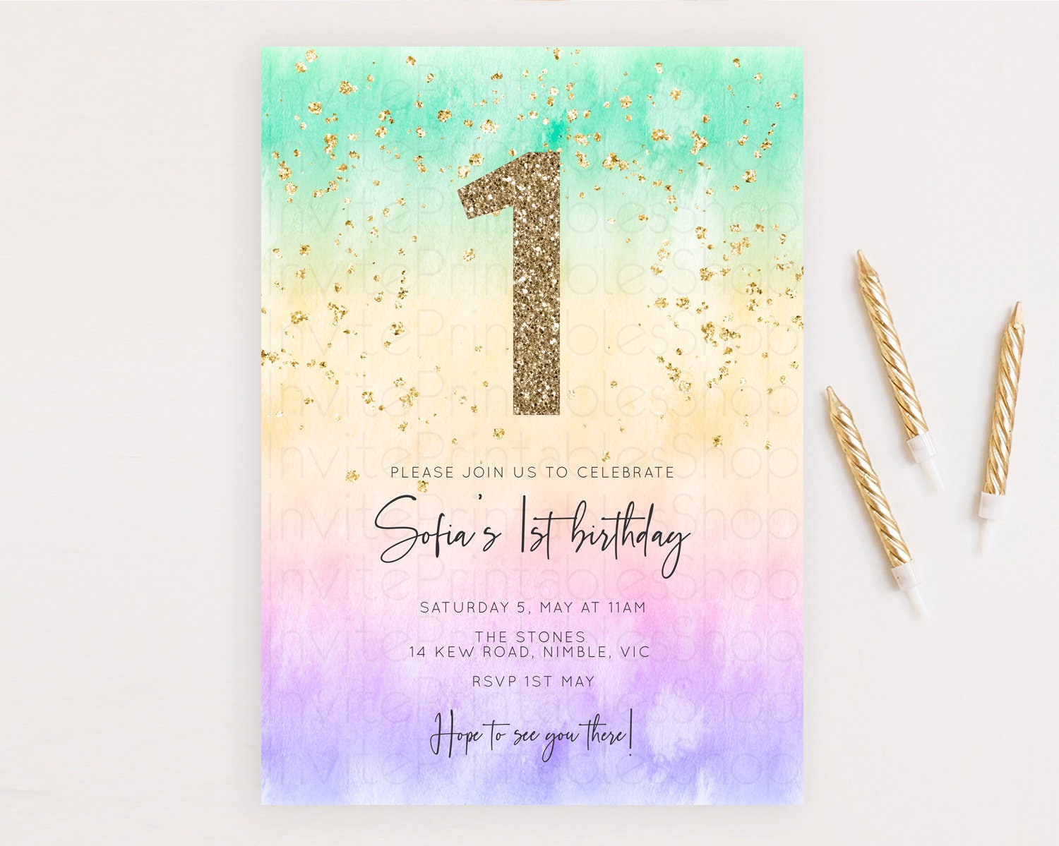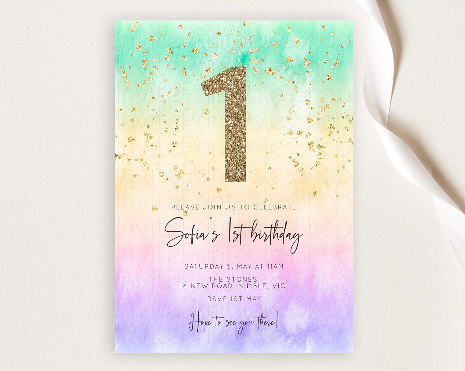 Rainbow Birthday Invitation Colorful Pastel Watercolor Invitation Gold Glitter Sprinkles Ombre Pastel 1st 2nd 3rd Birthday D10485