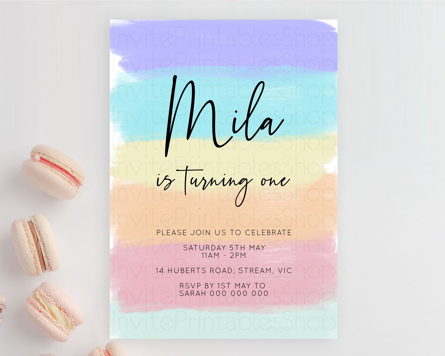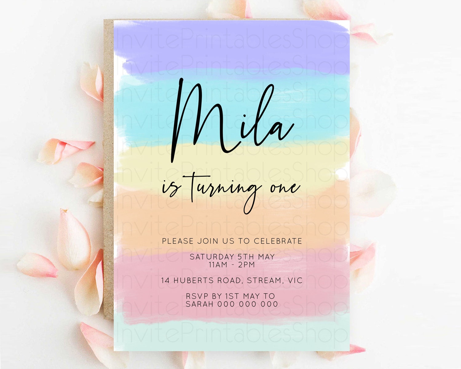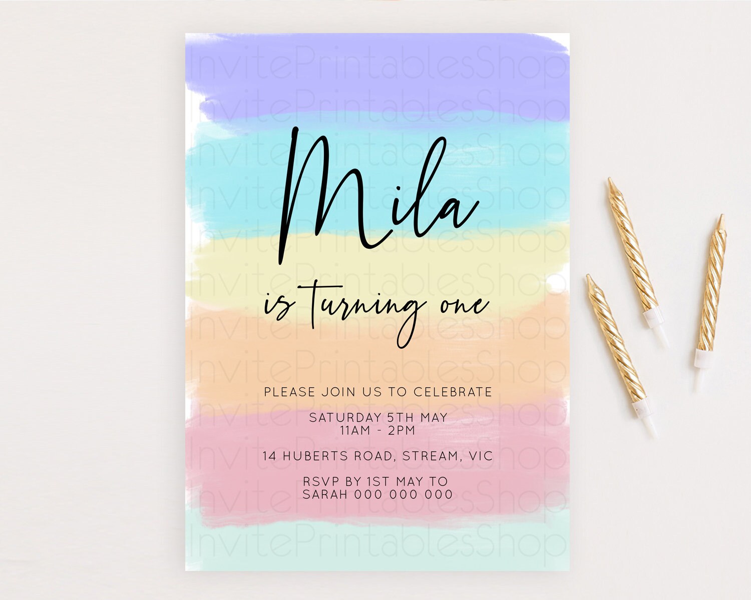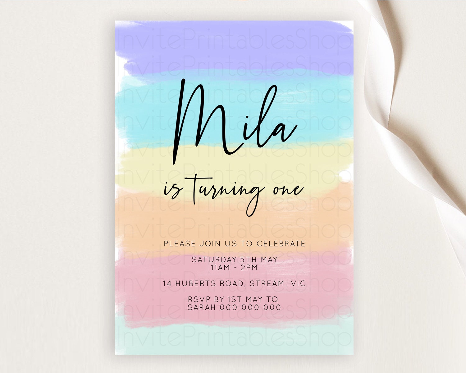 Rainbow Birthday Invitation Colorful Pastel Watercolor Invitation Gold Glitter Sprinkles Ombre Pastel 1st 2nd 3rd Birthday D10510