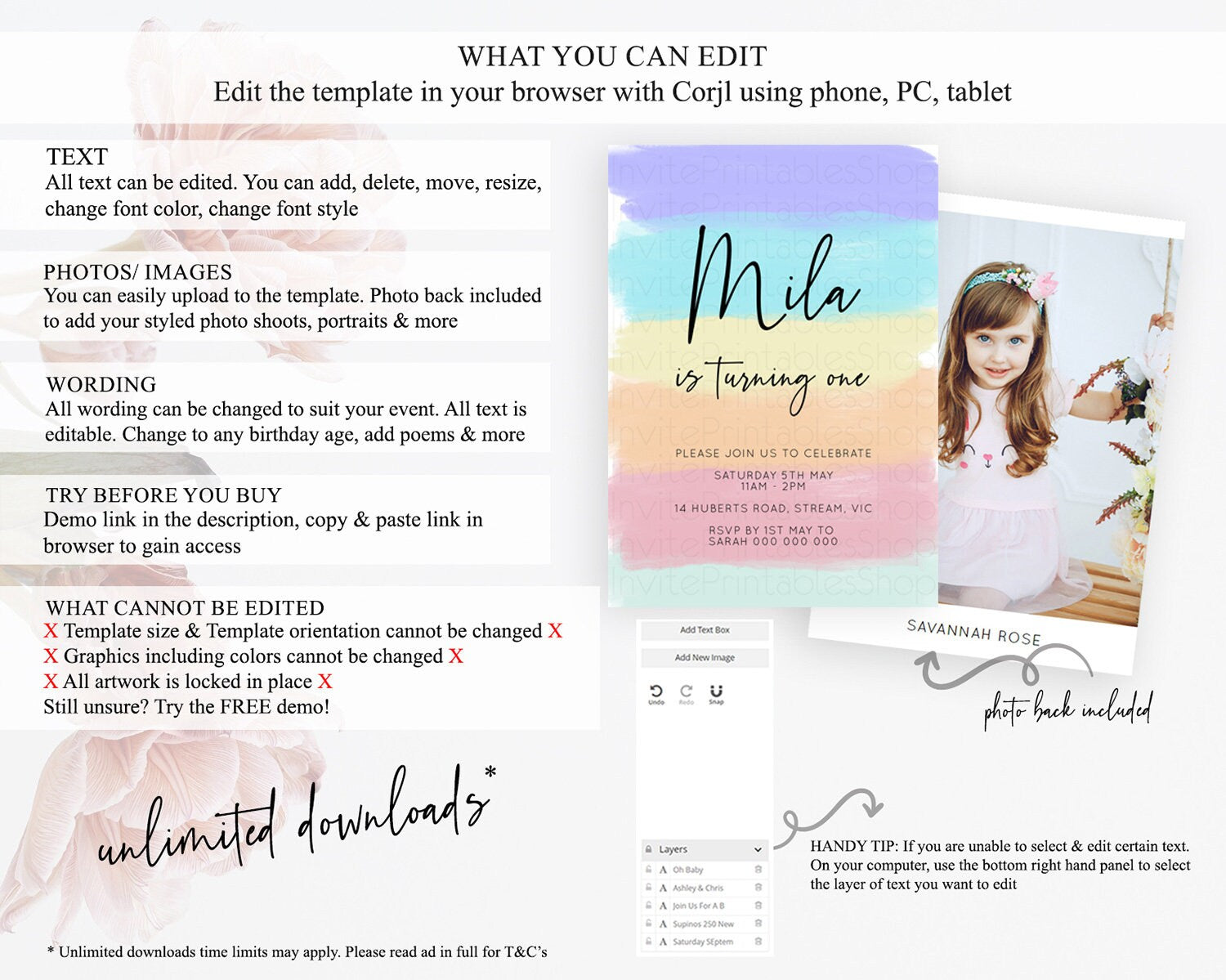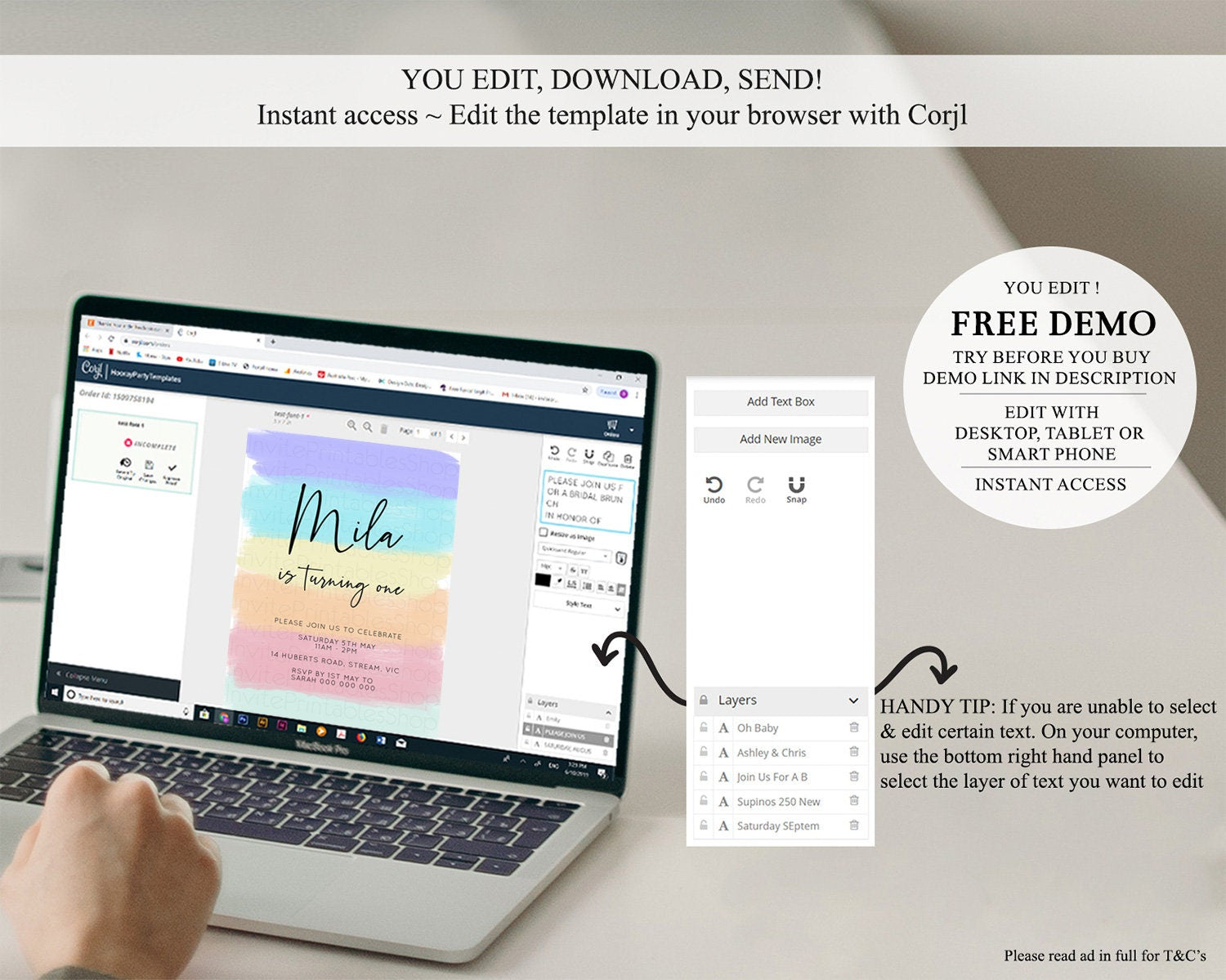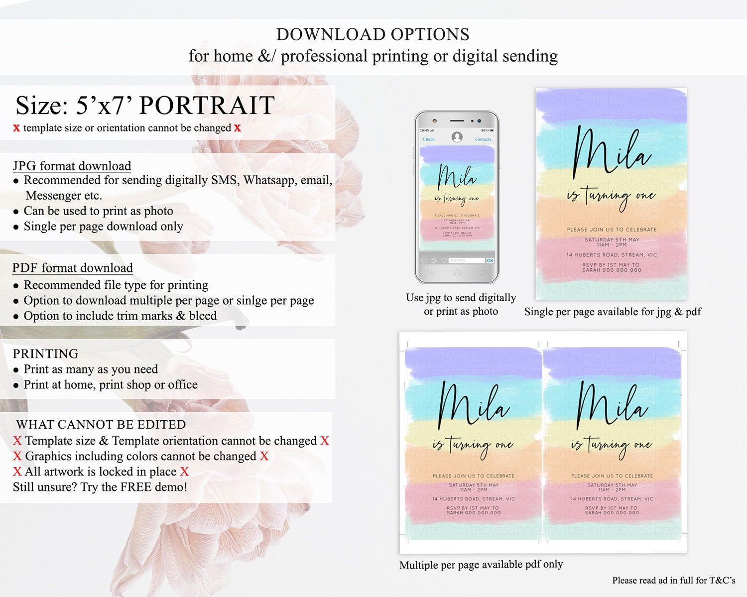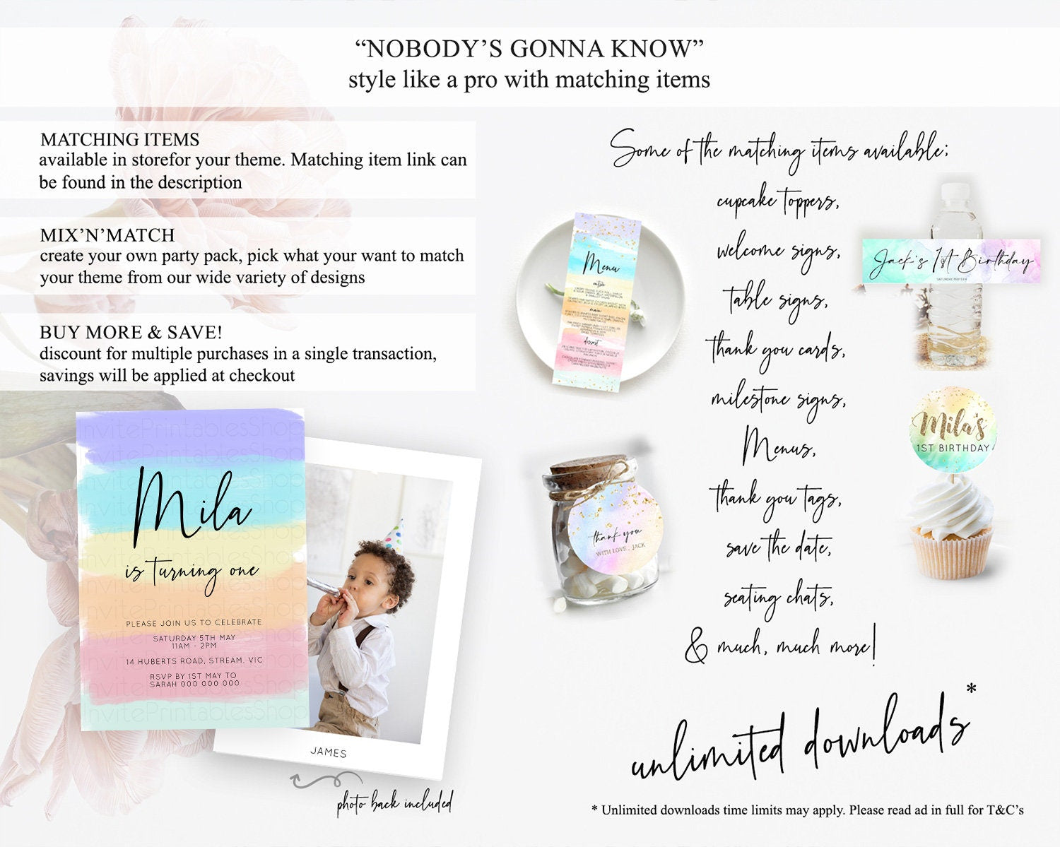 Rainbow Birthday Invitation Colorful Pastel Watercolor Invitation Gold Glitter Sprinkles Ombre Pastel 1st 2nd 3rd Birthday D10510