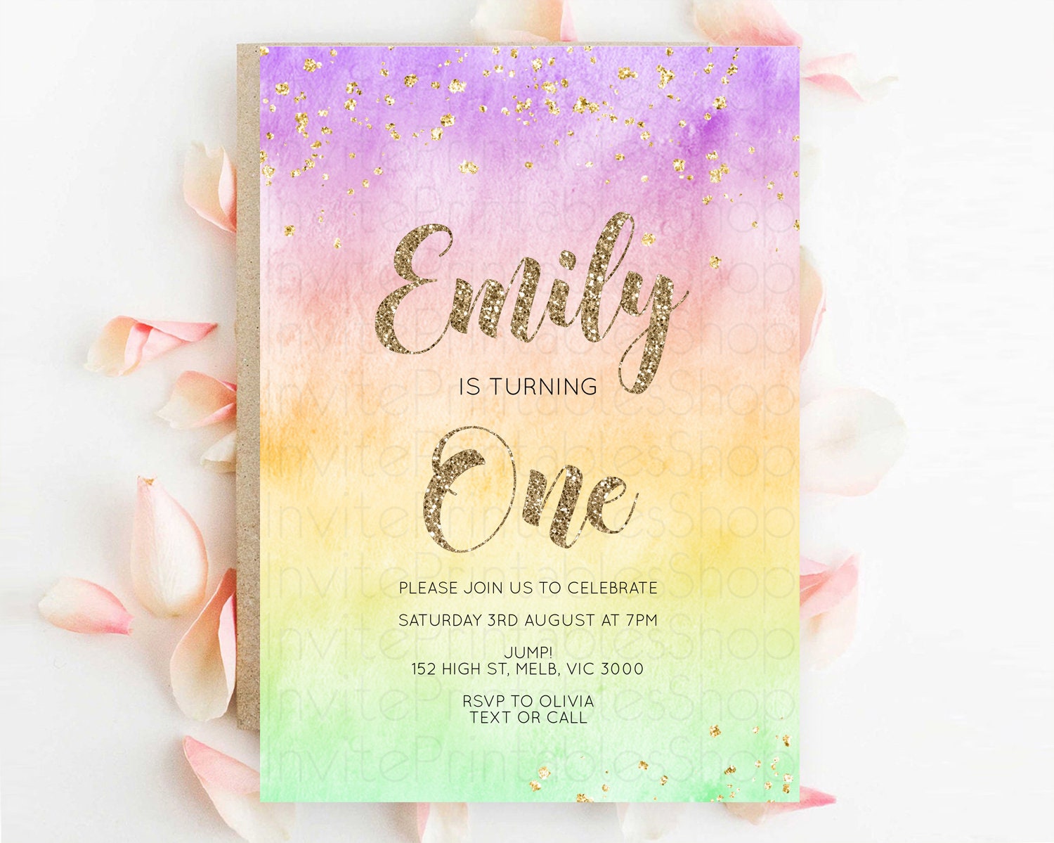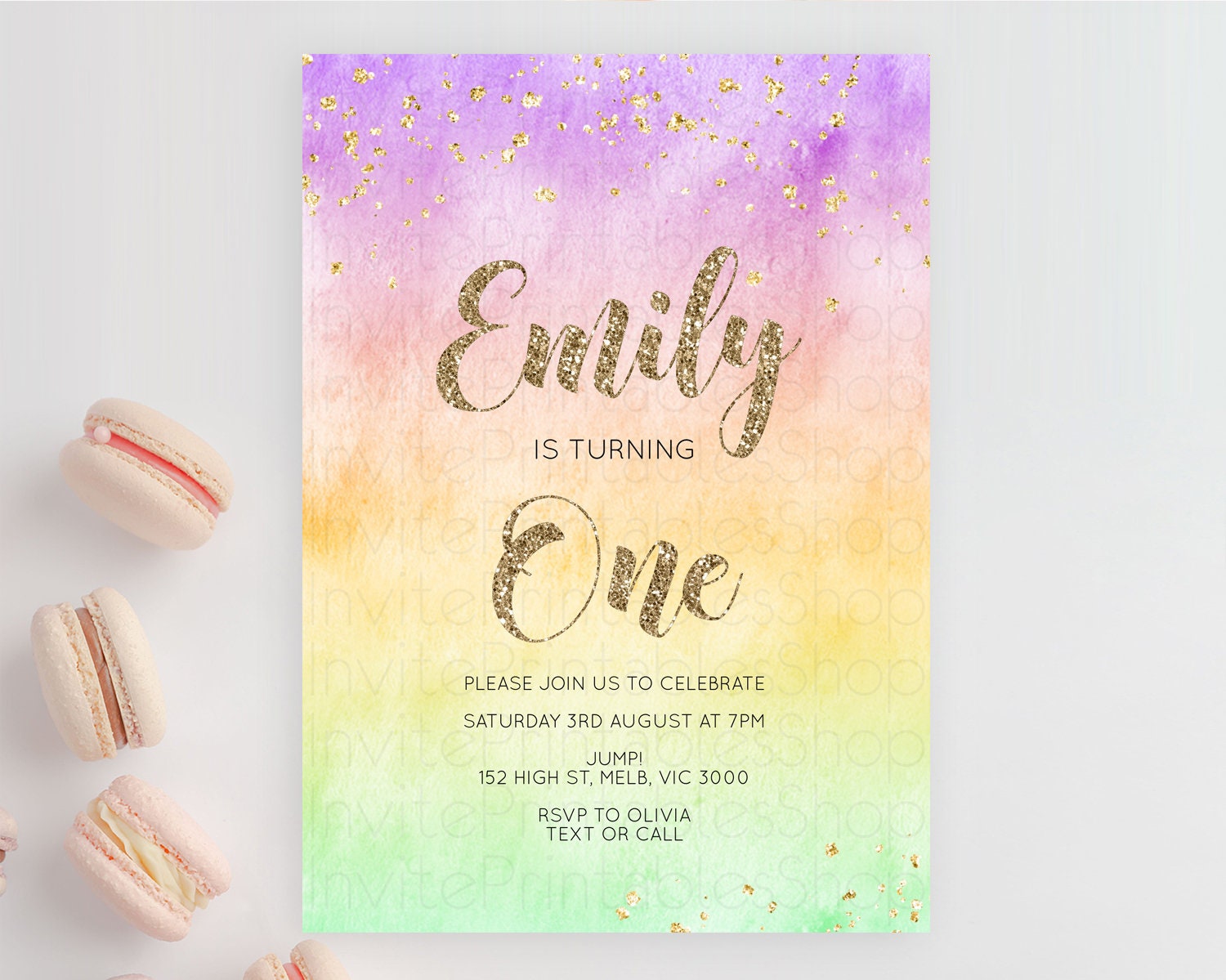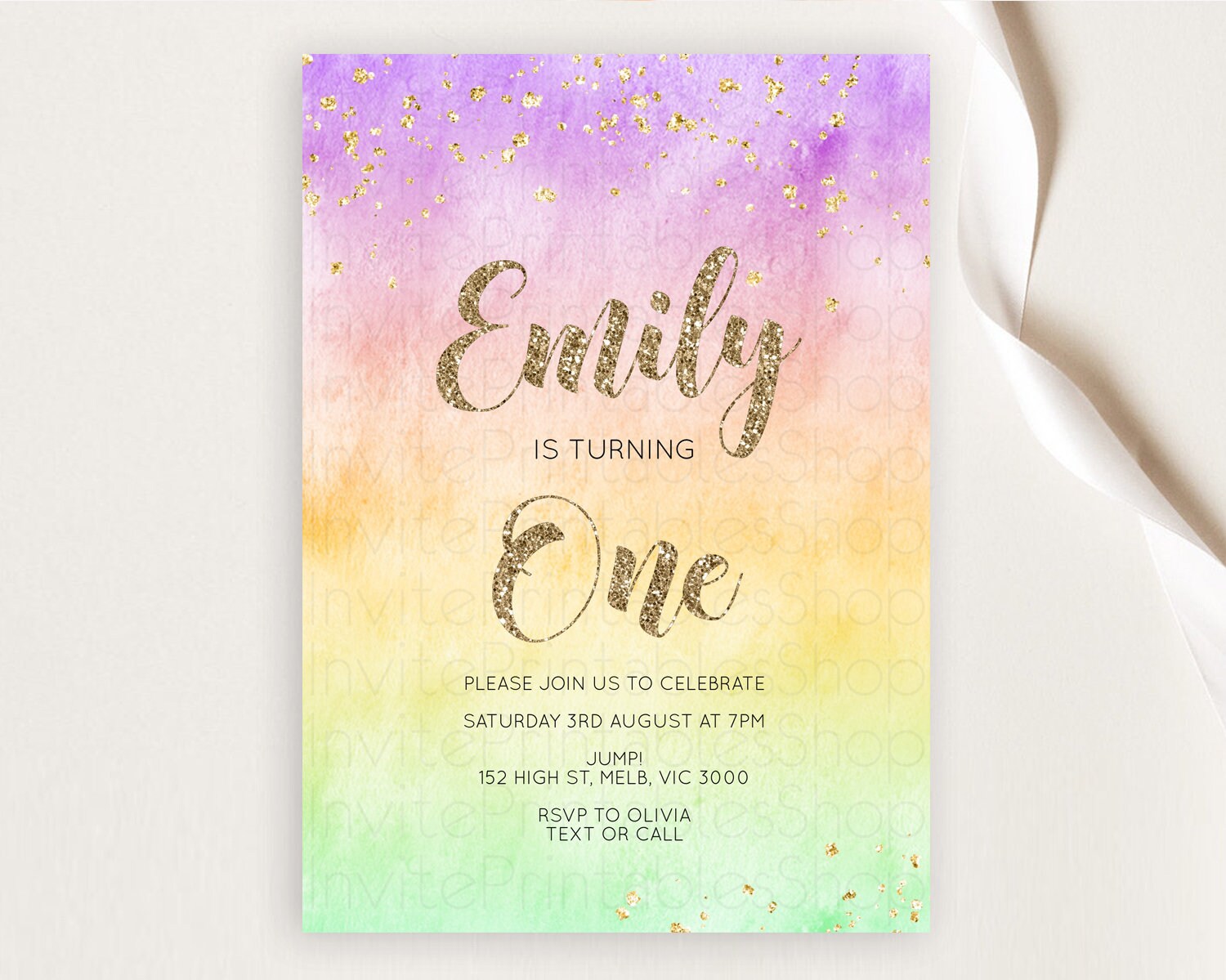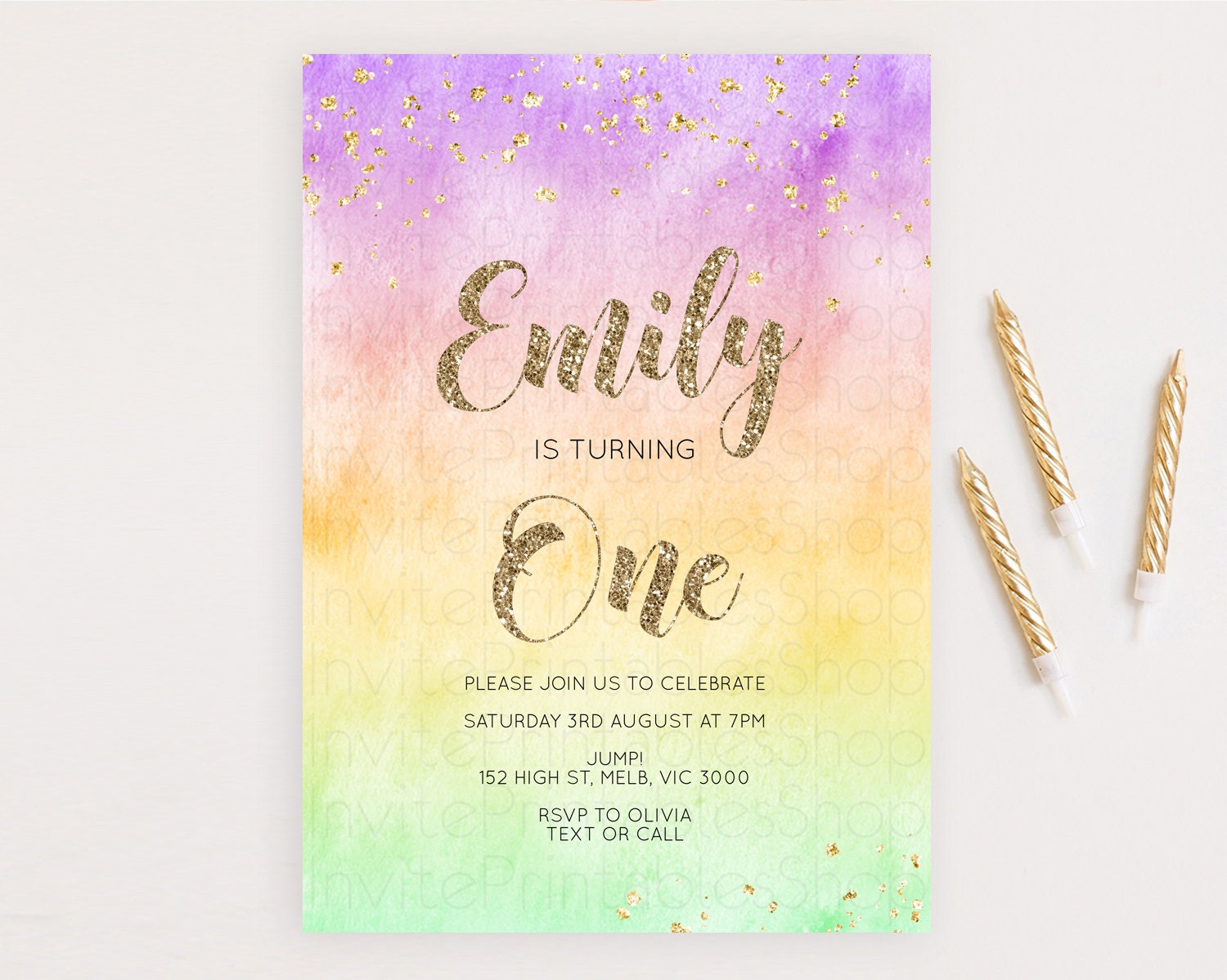 Rainbow Birthday Invitation Colorful Pastel Watercolor Invitation Gold Glitter Sprinkles Ombre Pastel 1st 2nd 3rd Birthday D10512