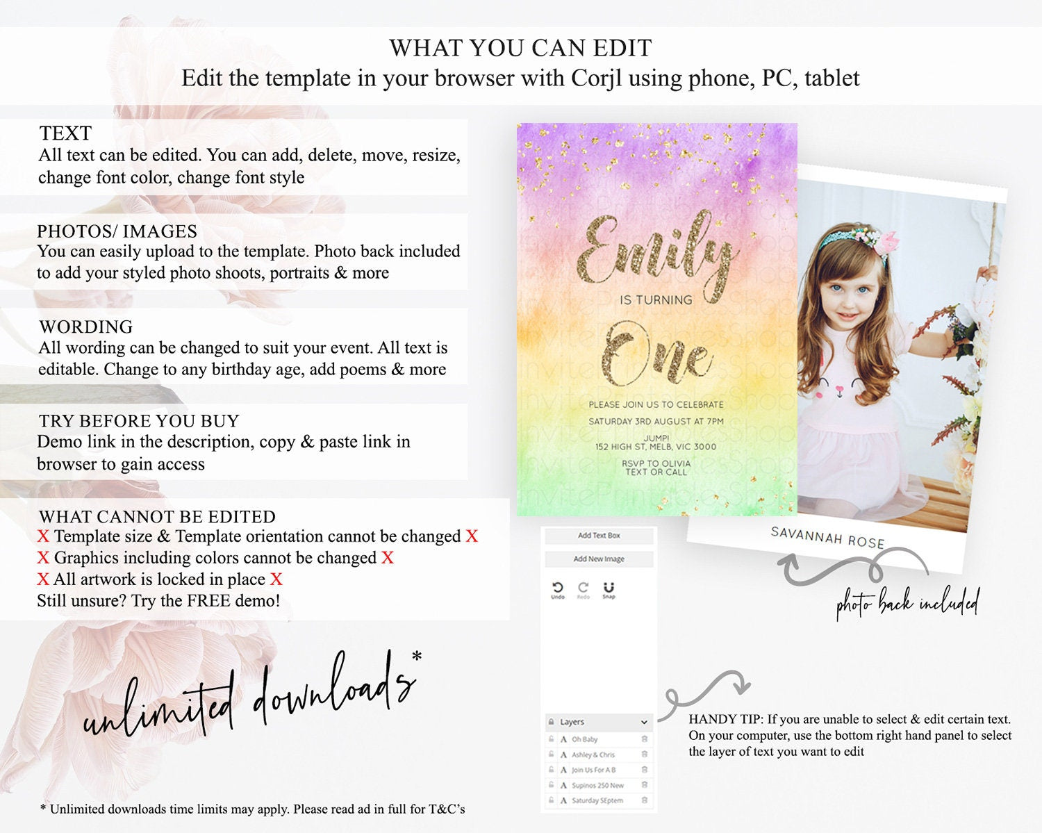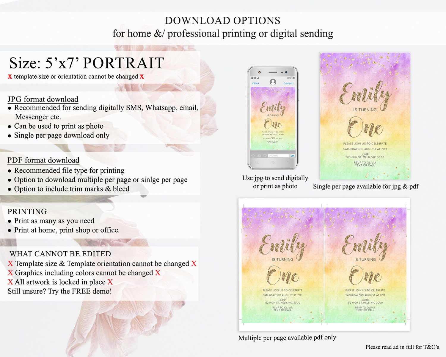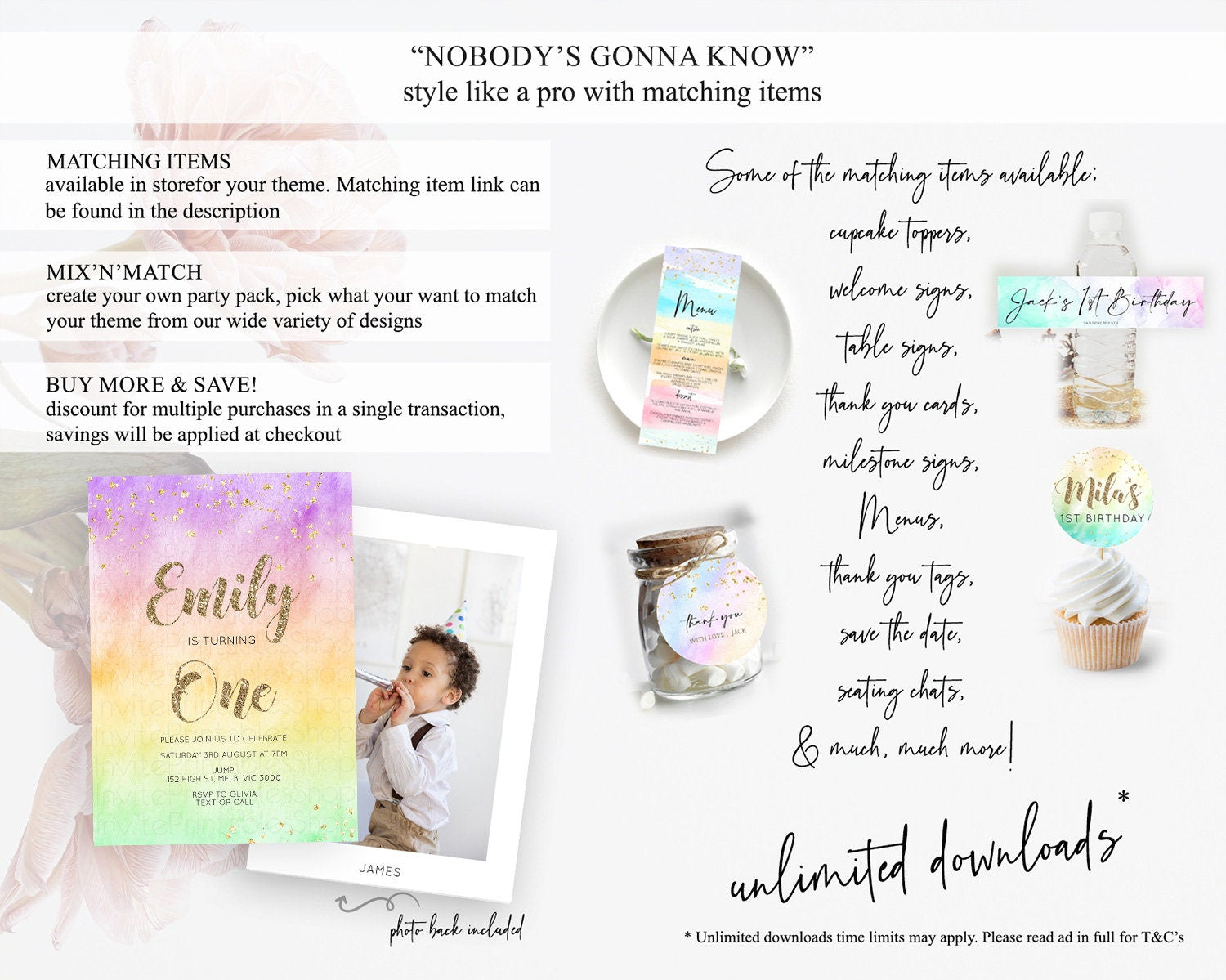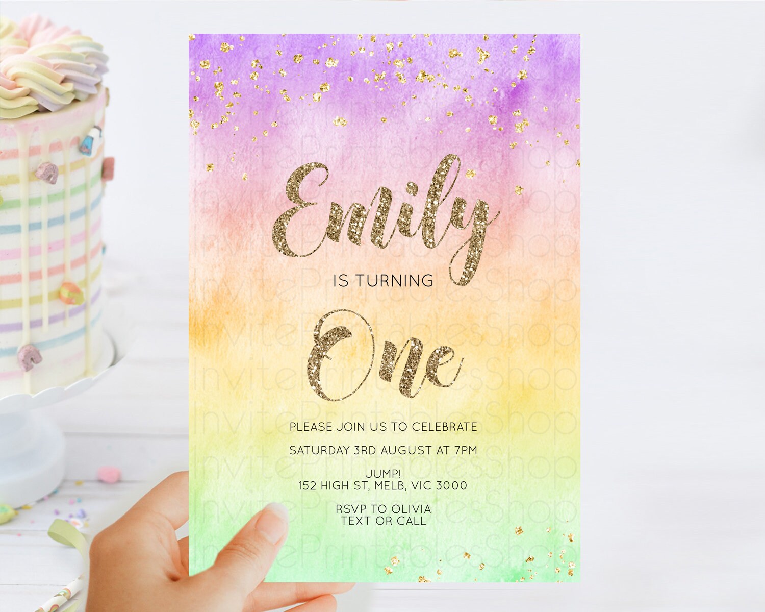 Rainbow Birthday Invitation Colorful Pastel Watercolor Invitation Gold Glitter Sprinkles Ombre Pastel 1st 2nd 3rd Birthday D10512