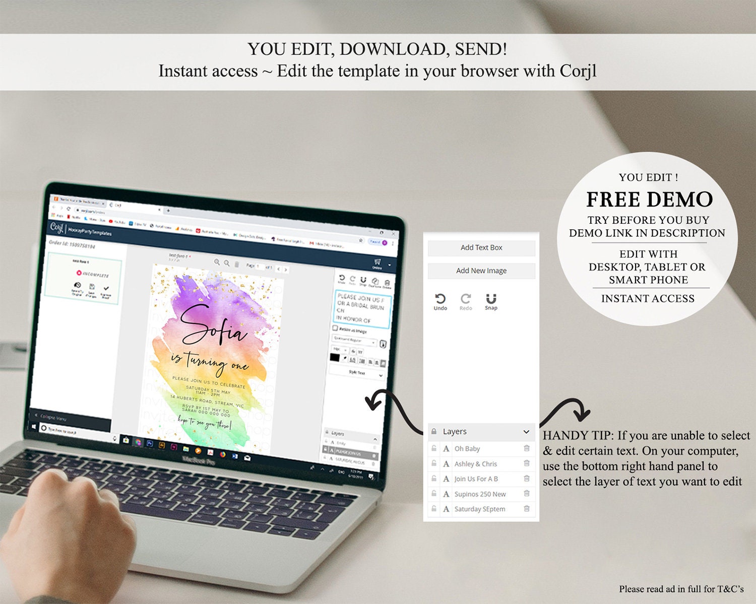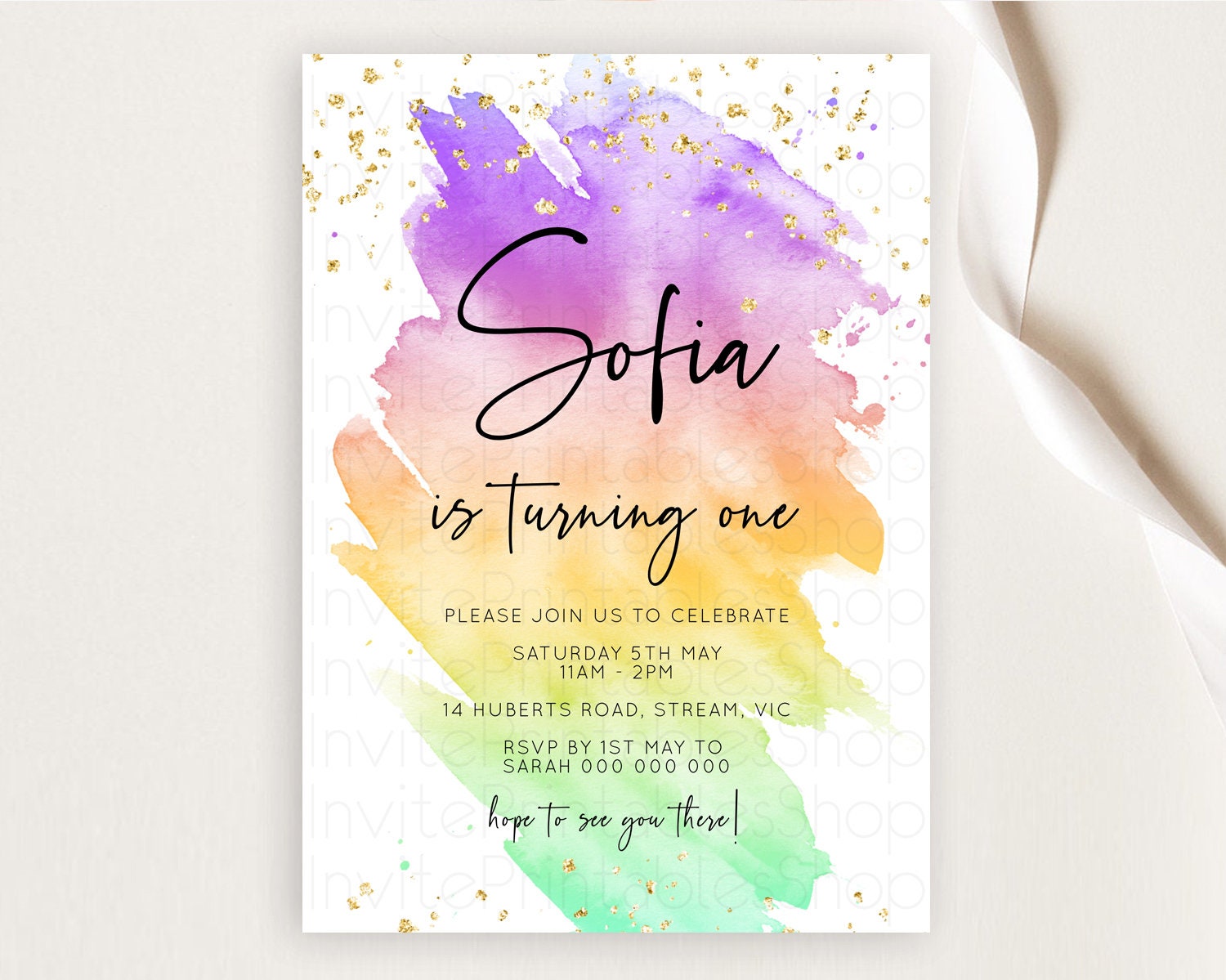 Rainbow Birthday Invitation Colorful Pastel Watercolor Invitation Gold Glitter Sprinkles Ombre Pastel 1st 2nd 3rd Birthday D10518