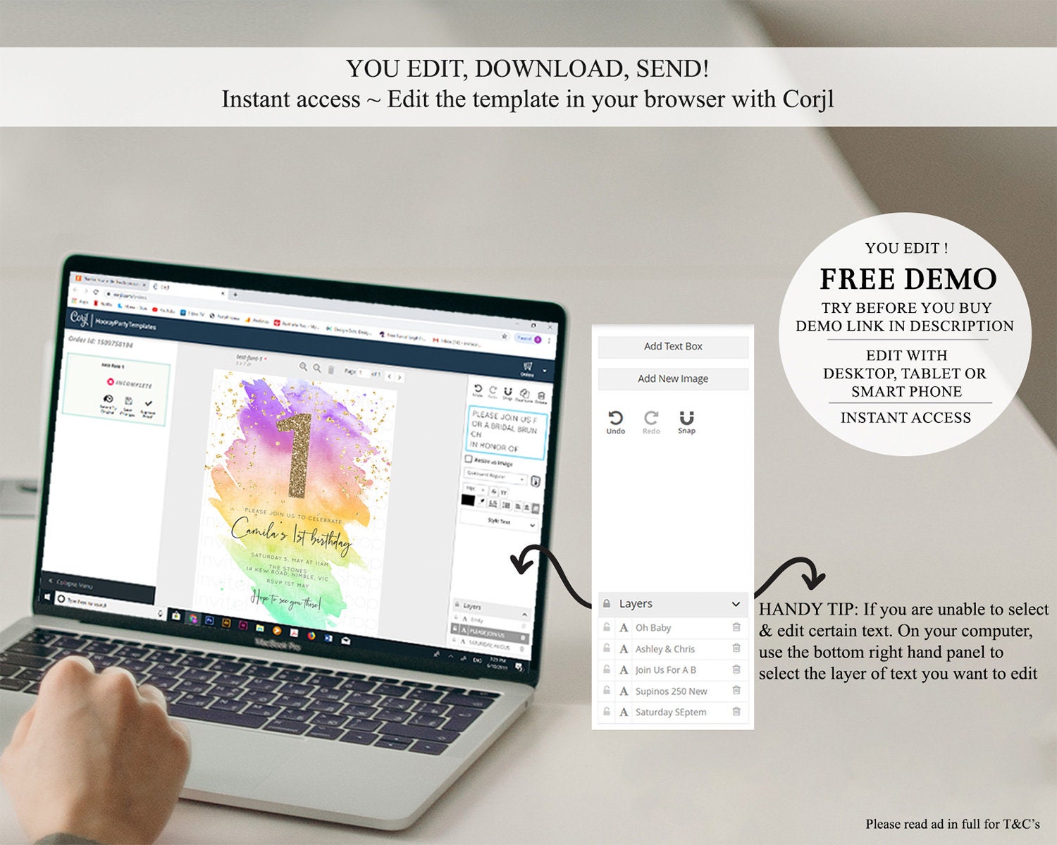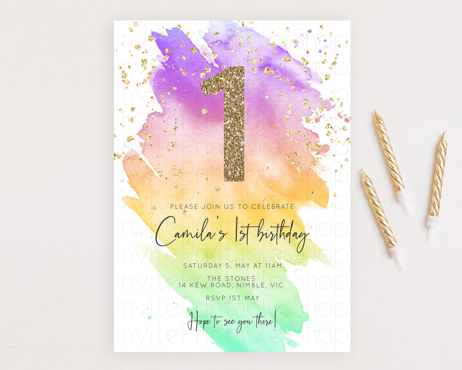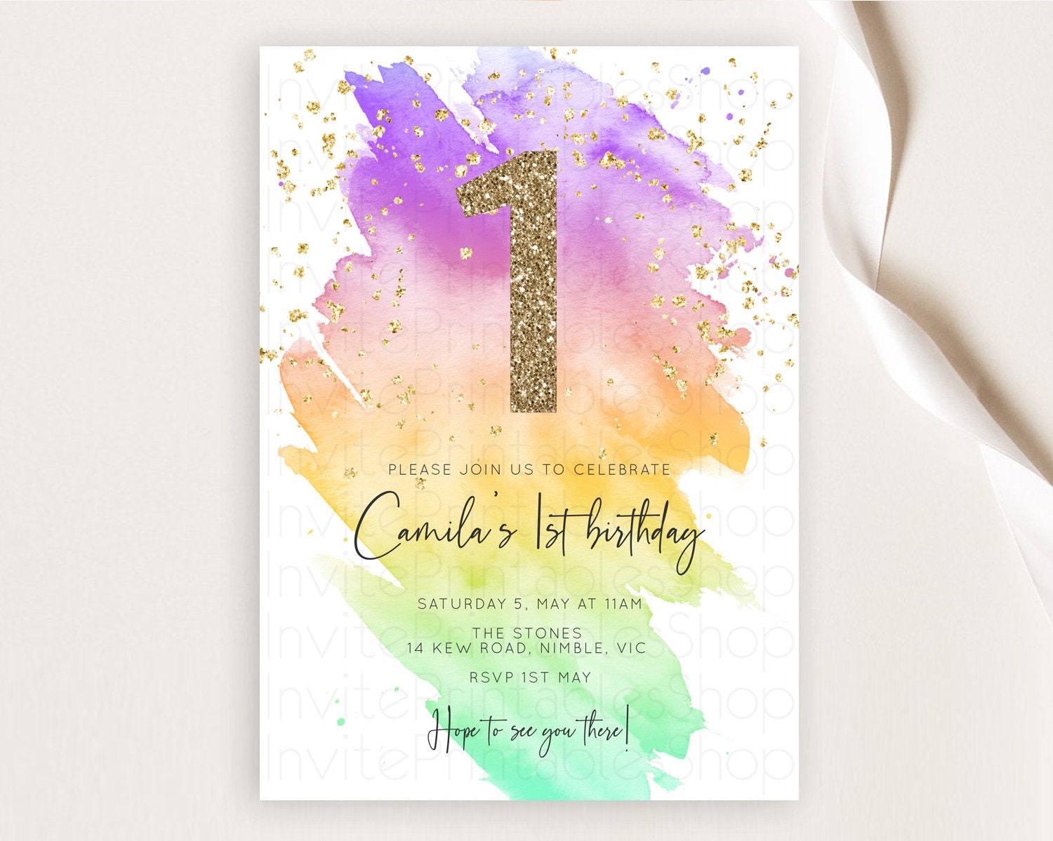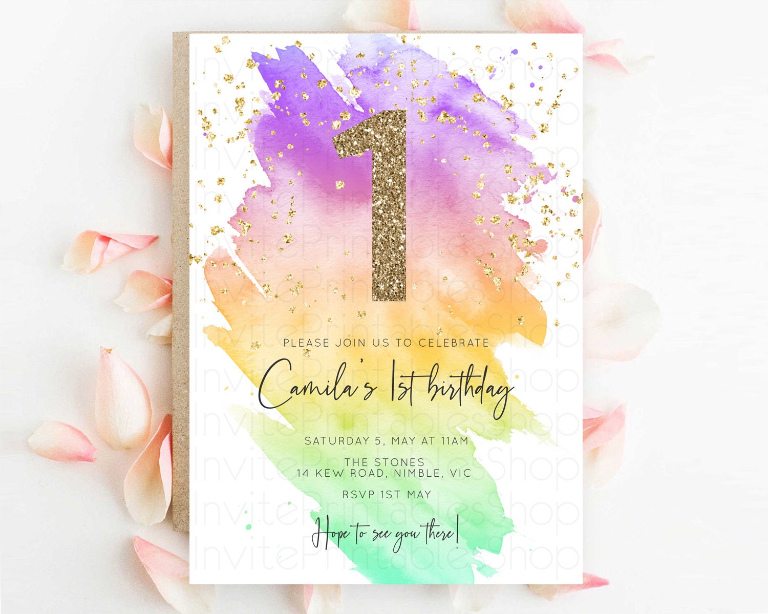 Rainbow Birthday Invitation Colorful Pastel Watercolor Invitation Gold Glitter Sprinkles Ombre Pastel 1st 2nd 3rd Birthday D10518