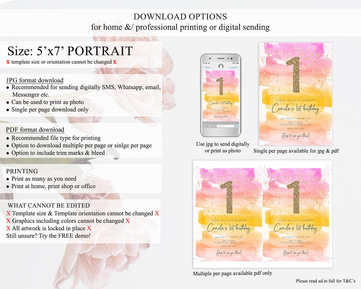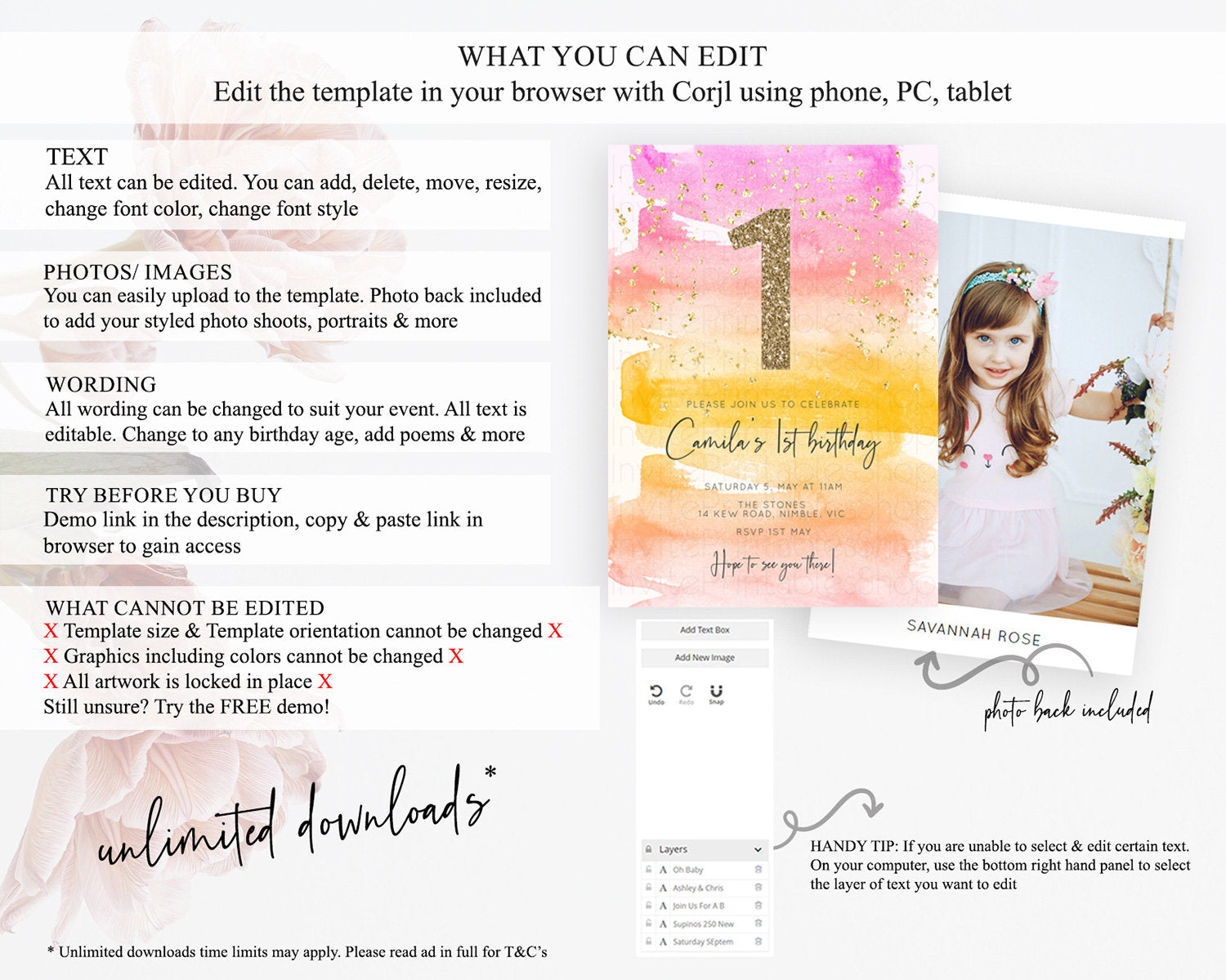 Rainbow Birthday Invitation Colorful Pastel Watercolor Invitation Gold Glitter Sprinkles Ombre Pastel 1st 2nd 3rd Birthday D10520