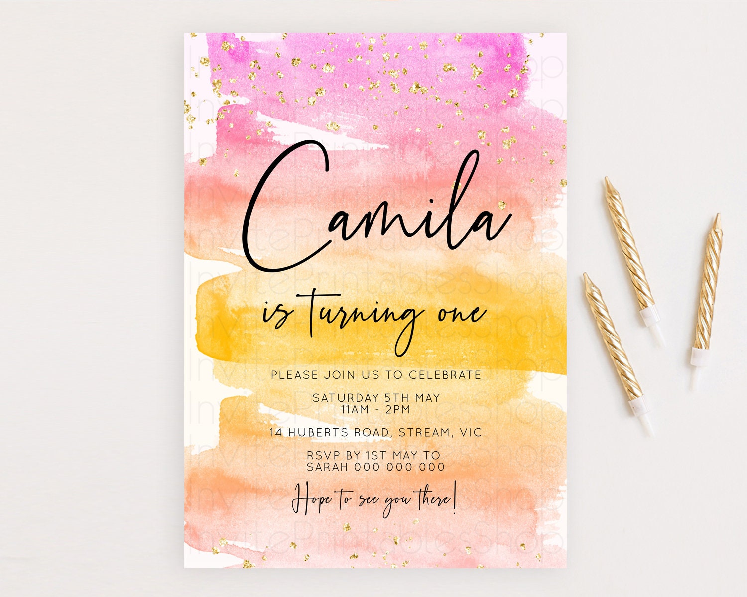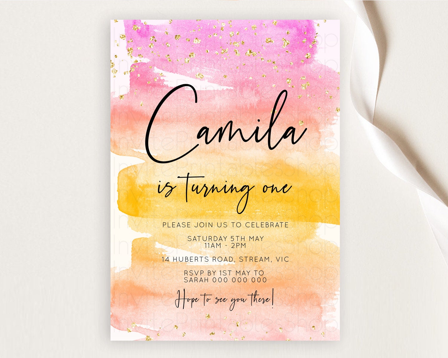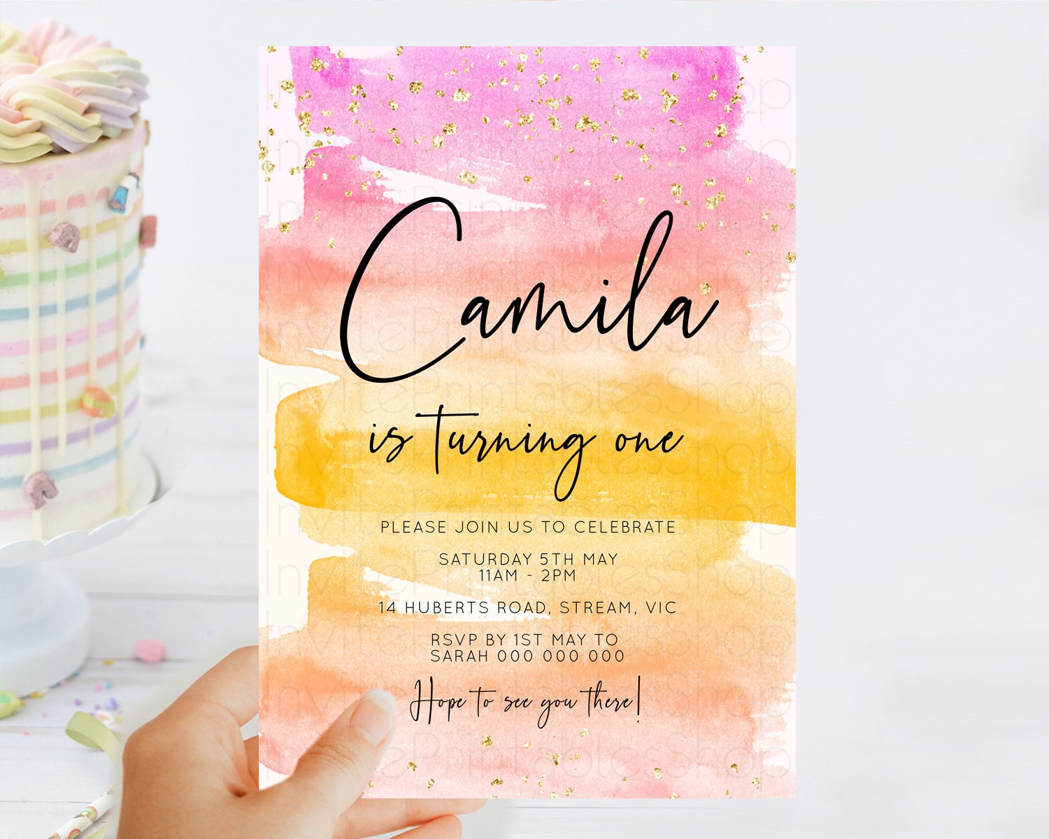 Rainbow Birthday Invitation Colorful Pastel Watercolor Invitation Gold Glitter Sprinkles Ombre Pastel 1st 2nd 3rd Birthday D10520