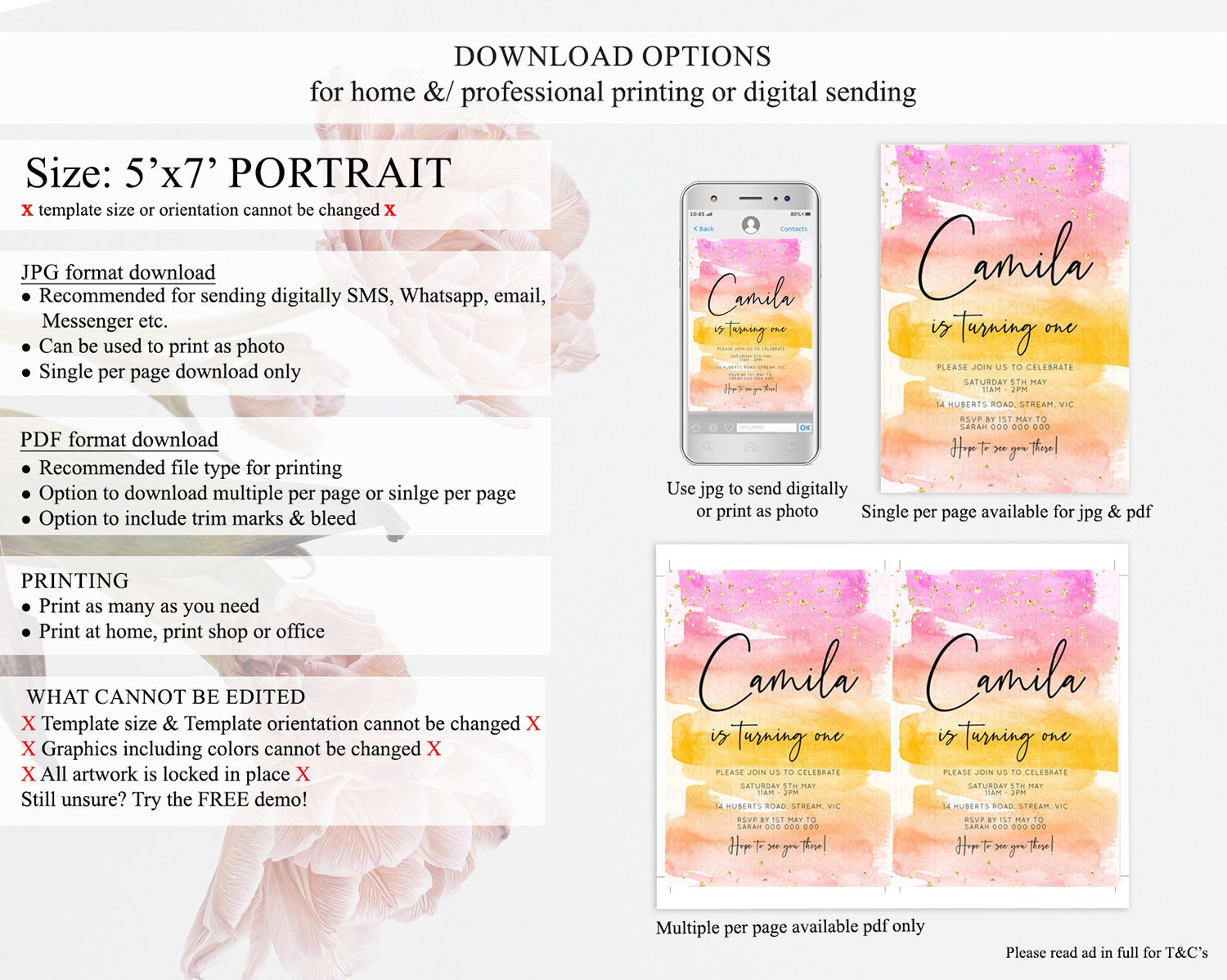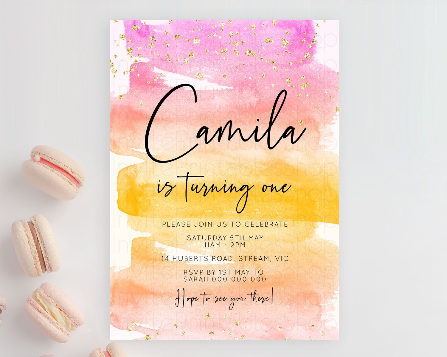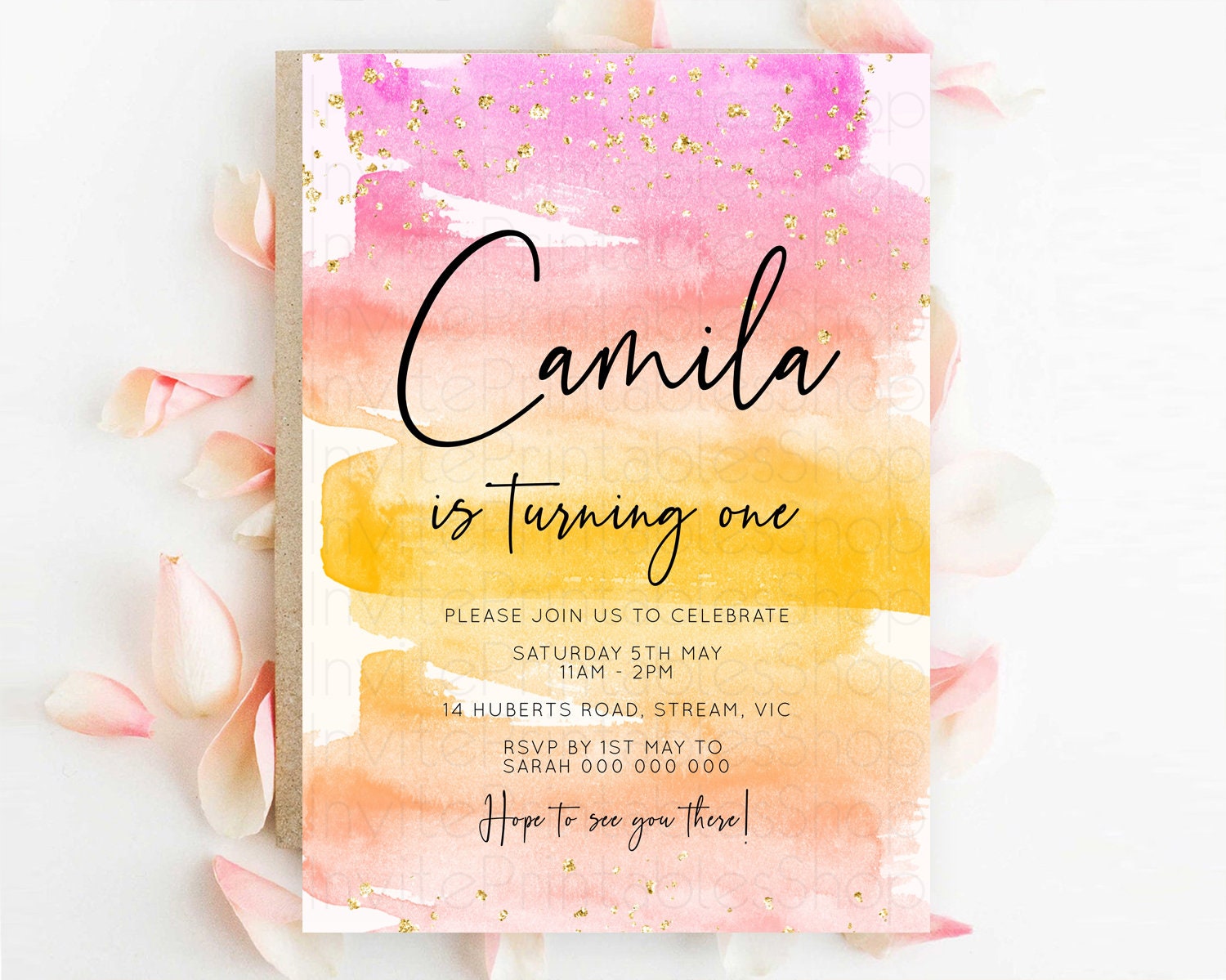 Rainbow Birthday Invitation Colorful Pastel Watercolor Invitation Gold Glitter Sprinkles Ombre Pastel 1st 2nd 3rd Birthday D10520