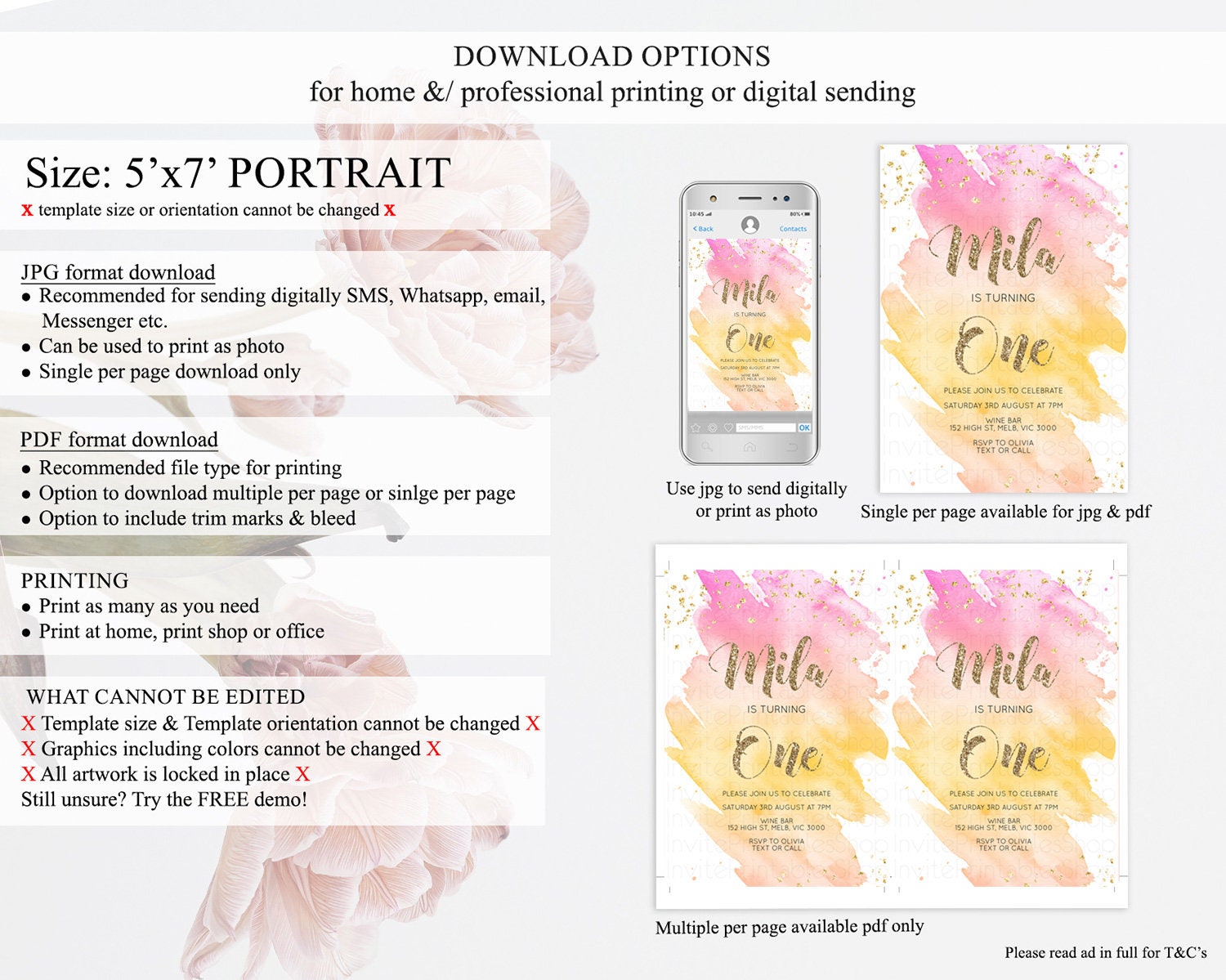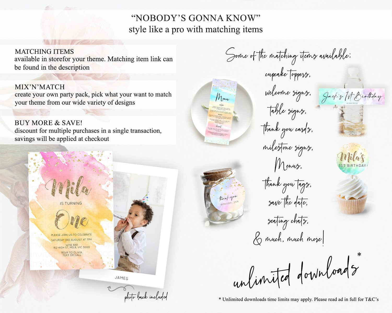 Rainbow Birthday Invitation Colorful Pastel Watercolor Invitation Gold Glitter Sprinkles Ombre Pastel 1st 2nd 3rd Birthday D10526