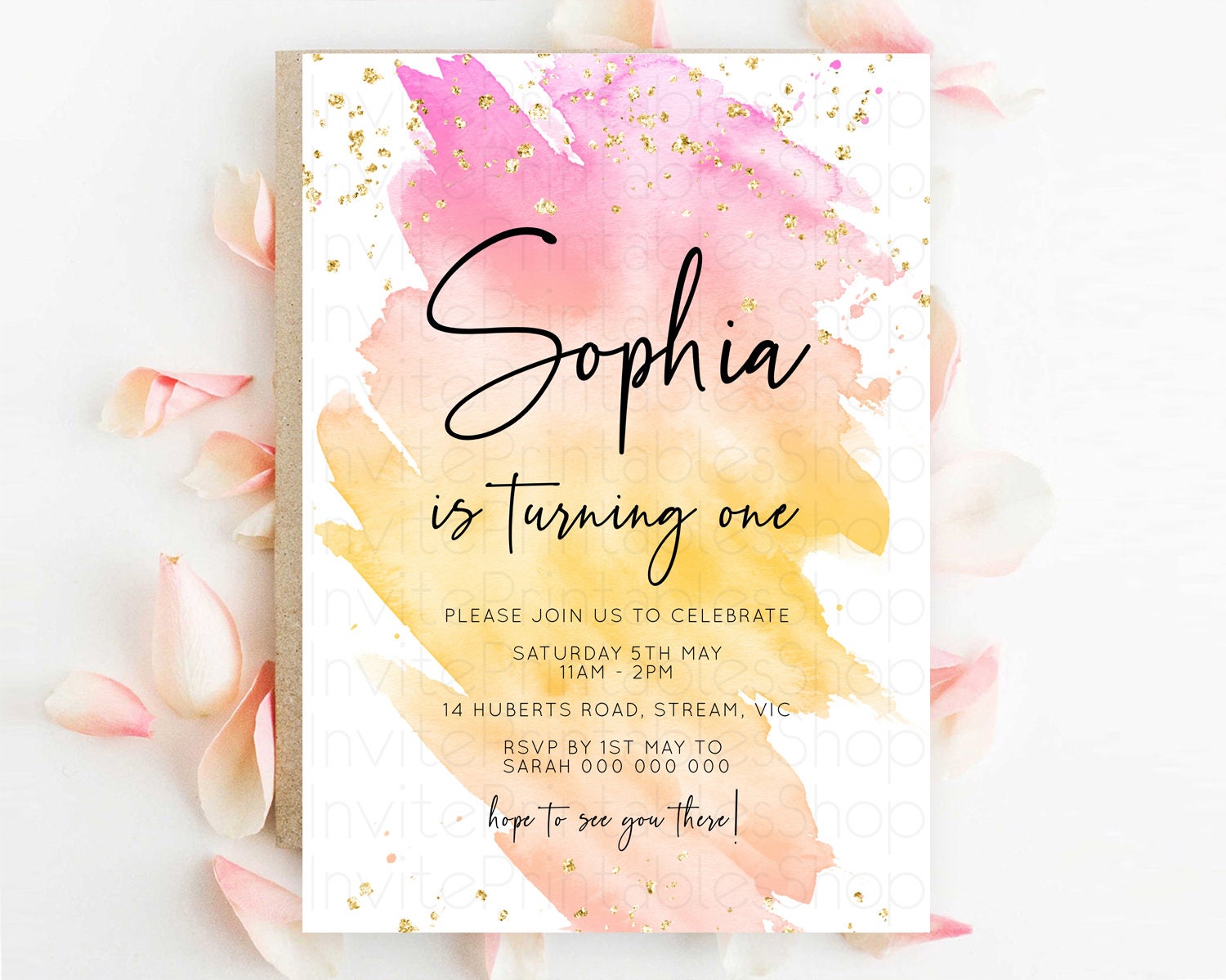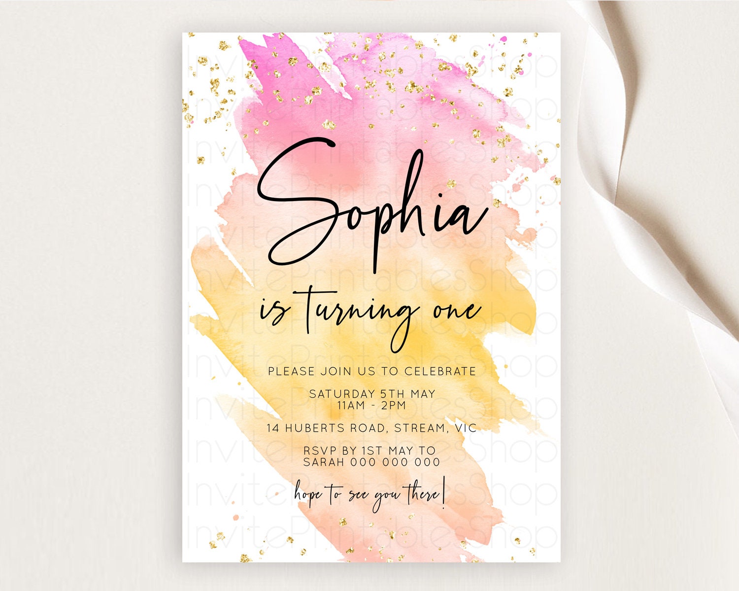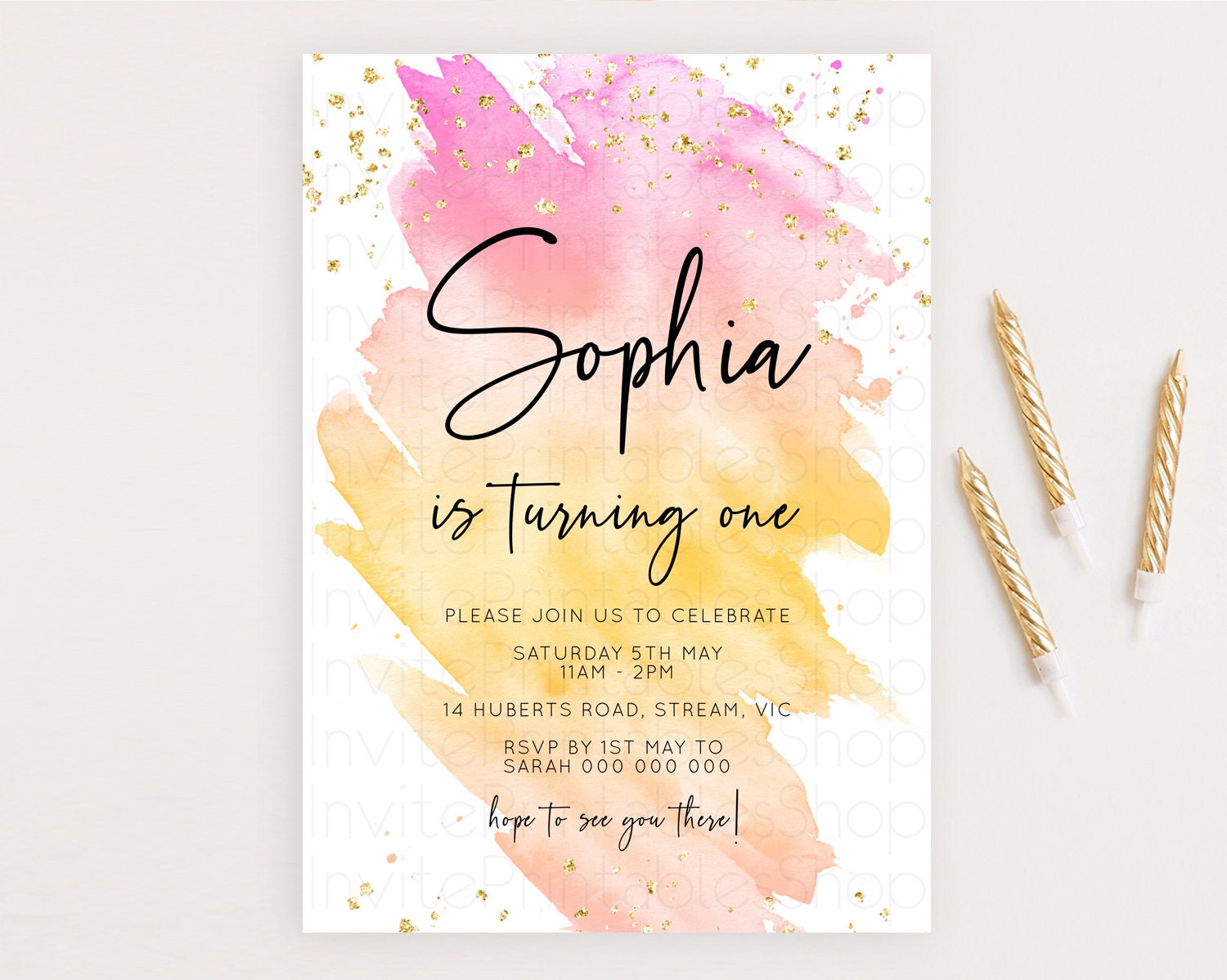 Rainbow Birthday Invitation Colorful Pastel Watercolor Invitation Gold Glitter Sprinkles Ombre Pastel 1st 2nd 3rd Birthday D10527