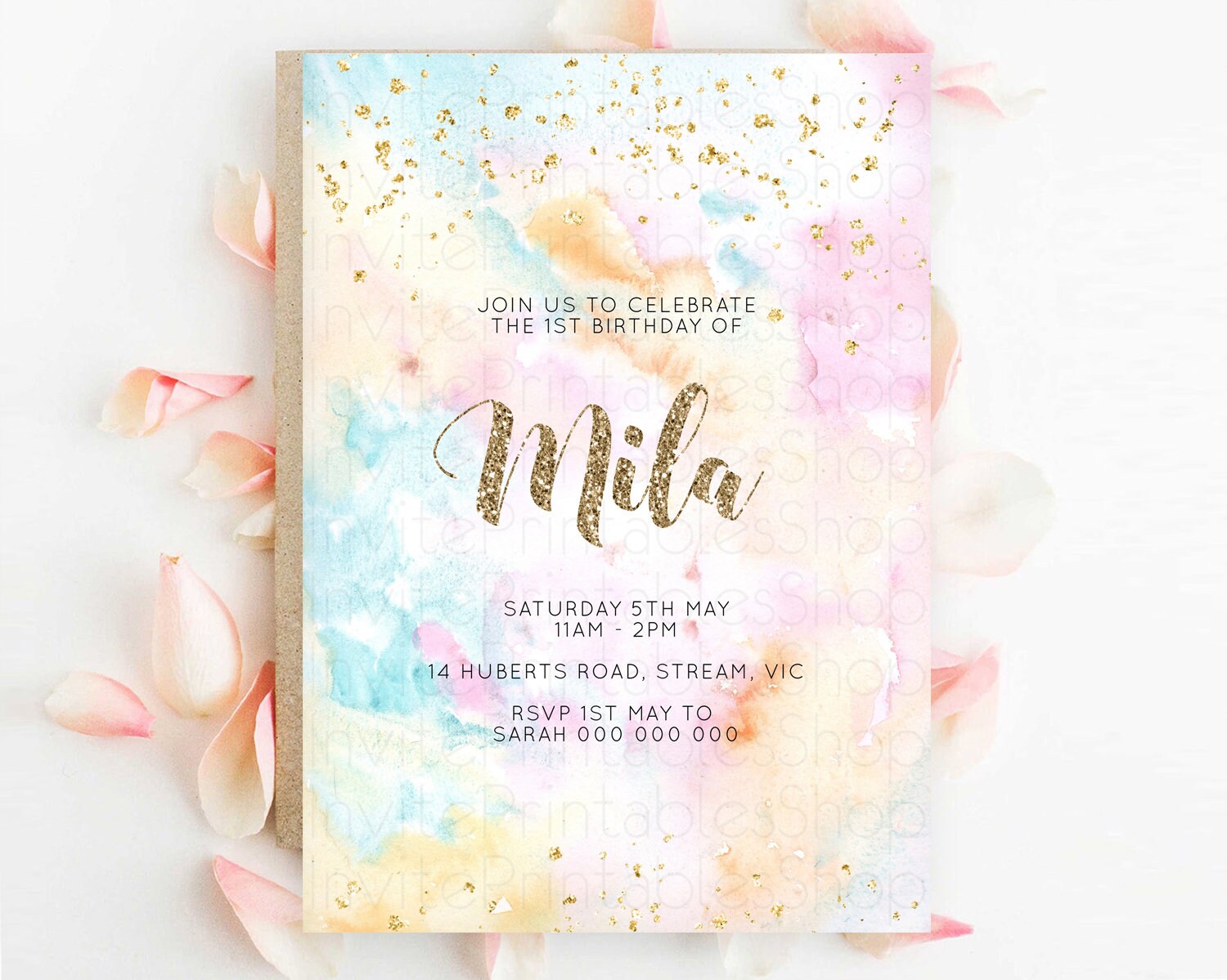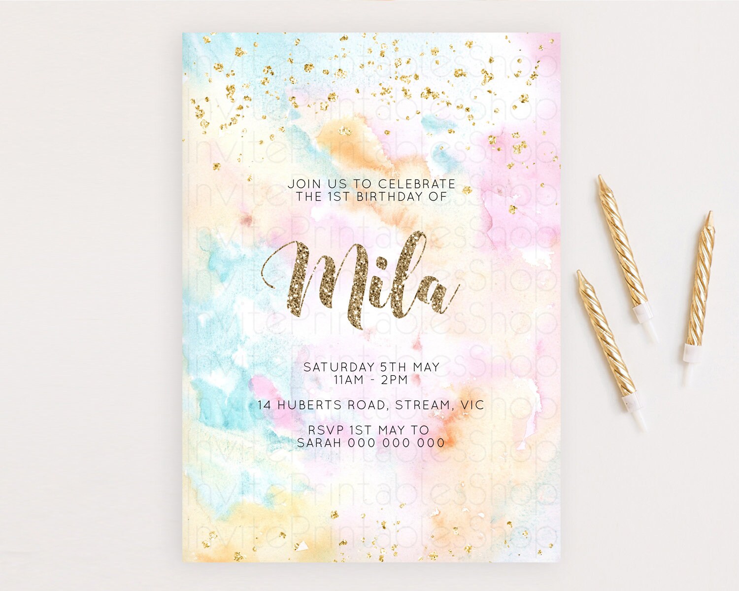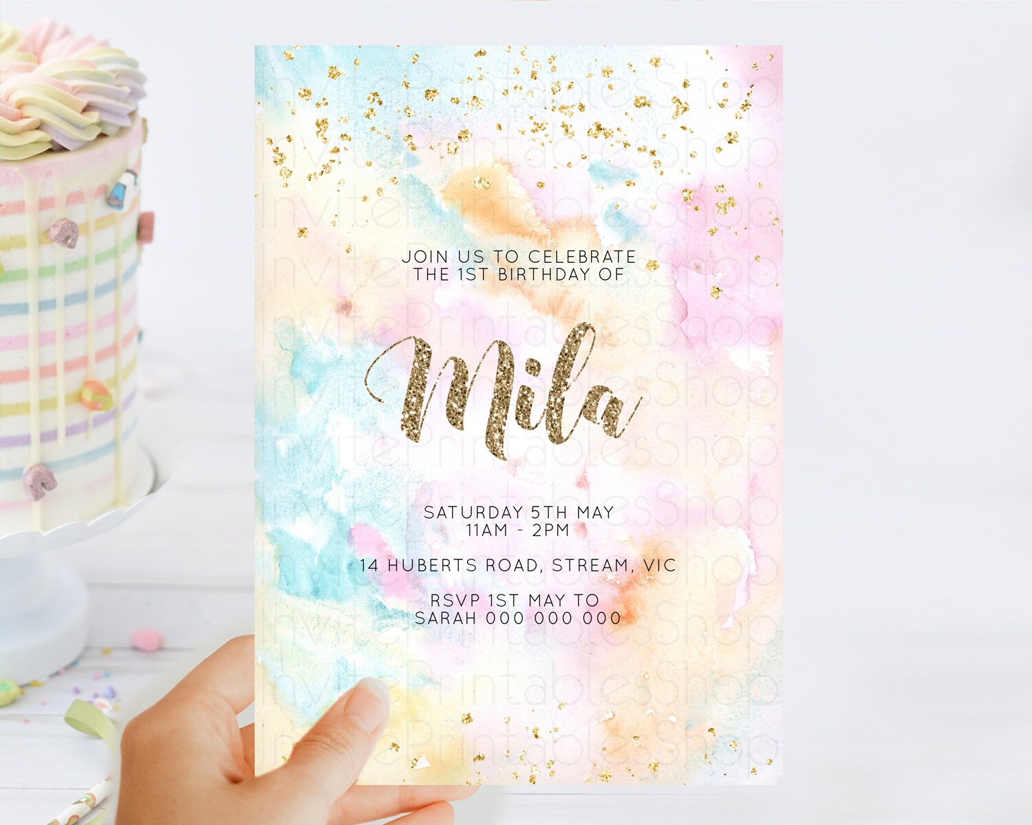Rainbow Birthday Invitation Colorful Pastel Watercolor Invitation Gold Glitter Sprinkles Ombre Pastel 1st 2nd 3rd Birthday D10548