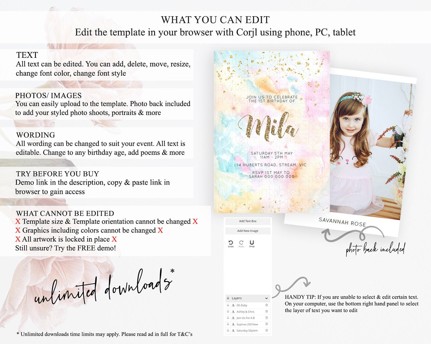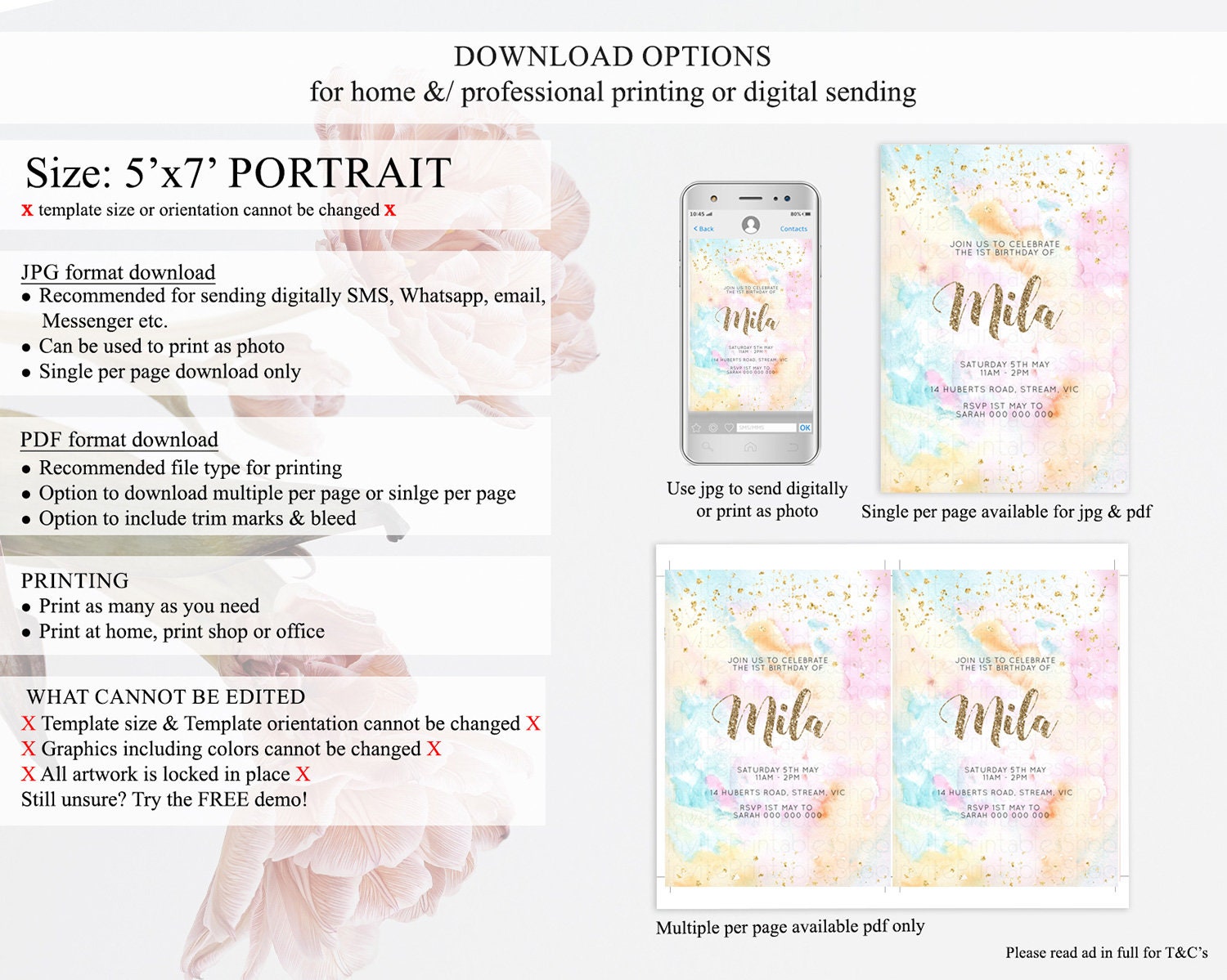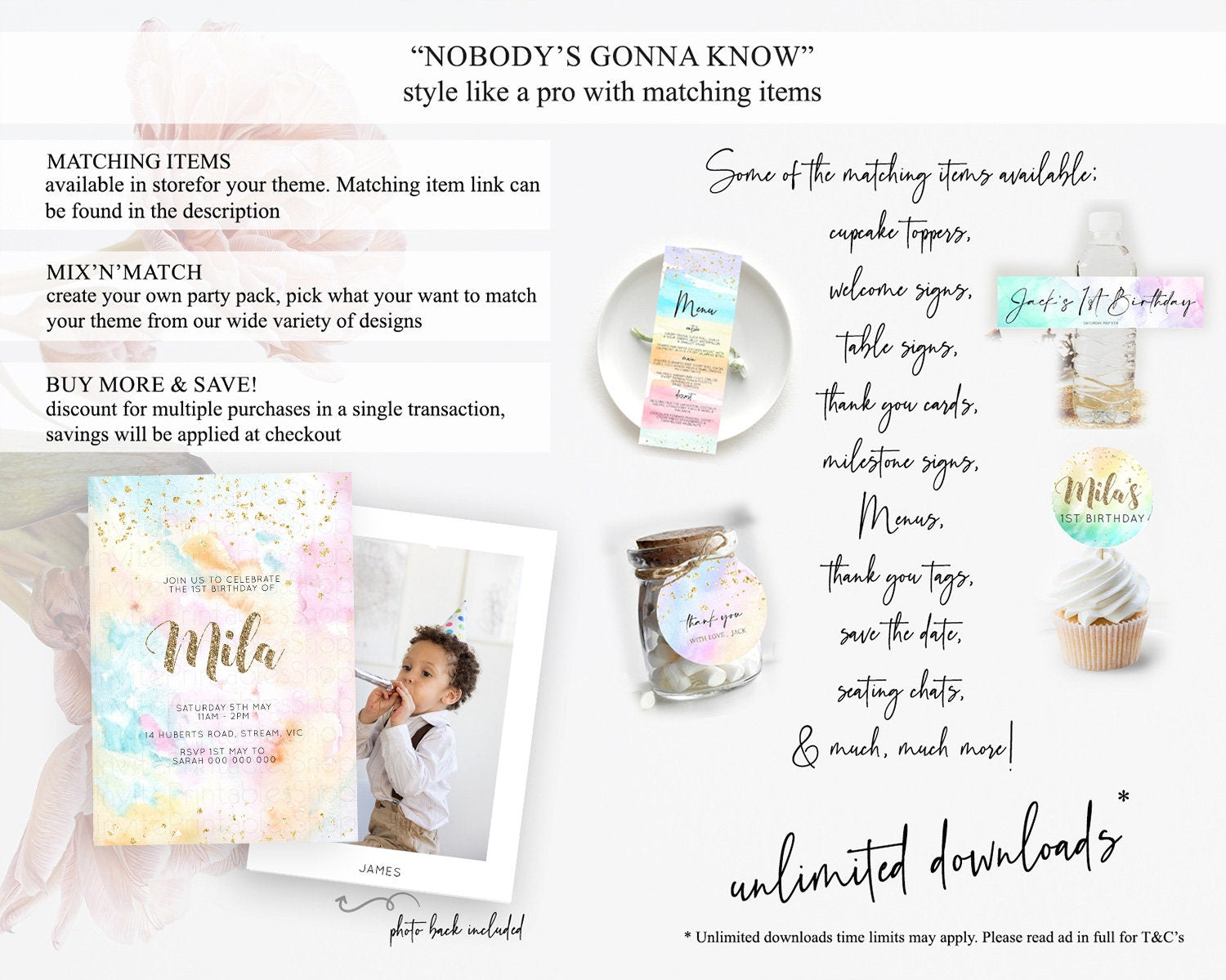 Rainbow Birthday Invitation Colorful Pastel Watercolor Invitation Gold Glitter Sprinkles Ombre Pastel 1st 2nd 3rd Birthday D10548