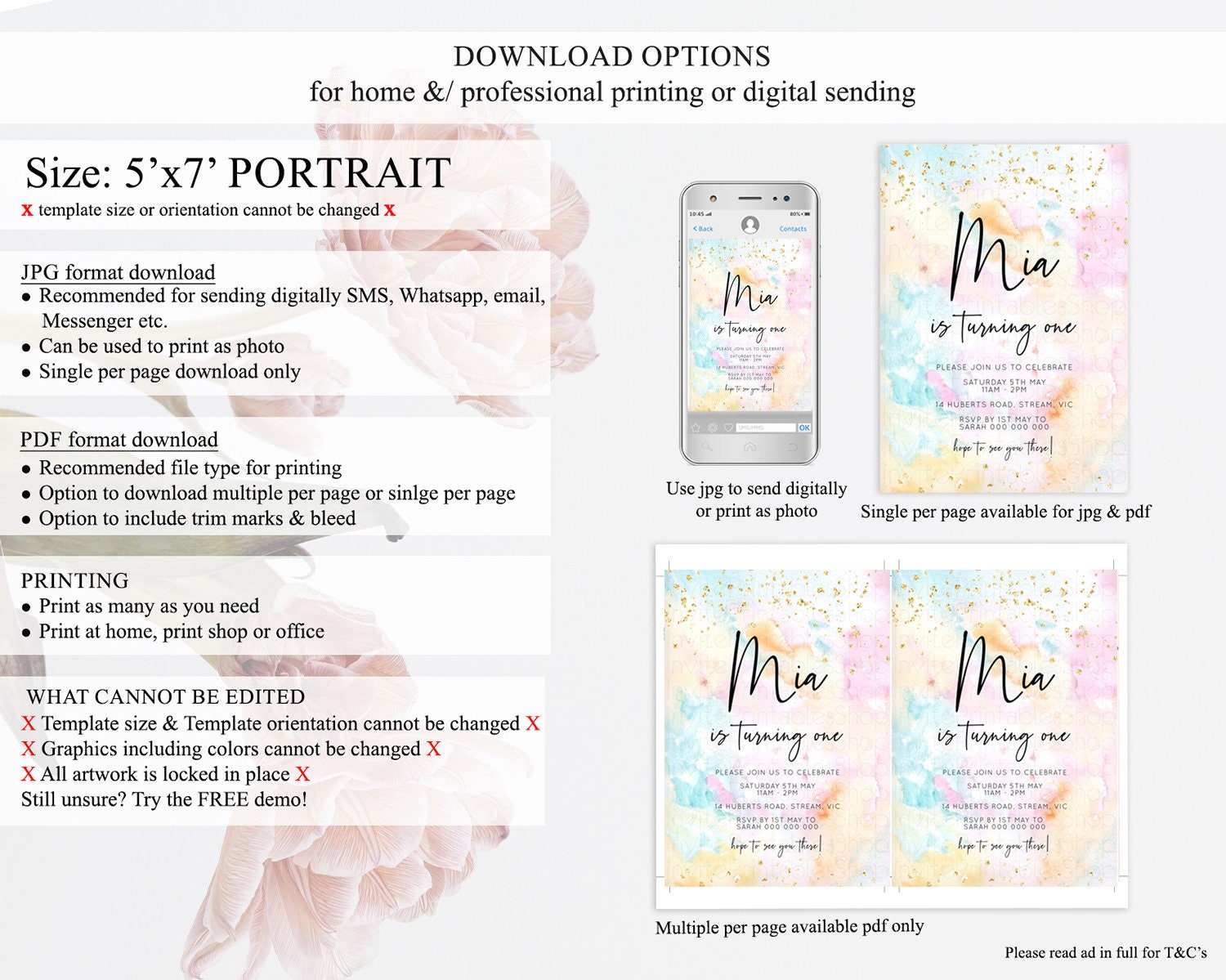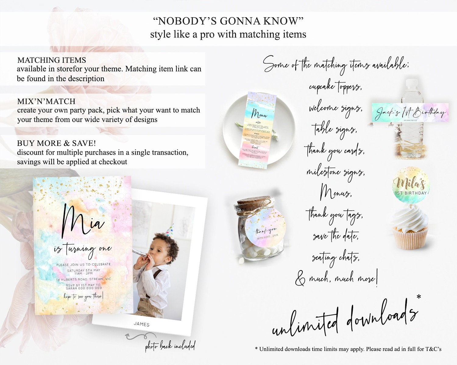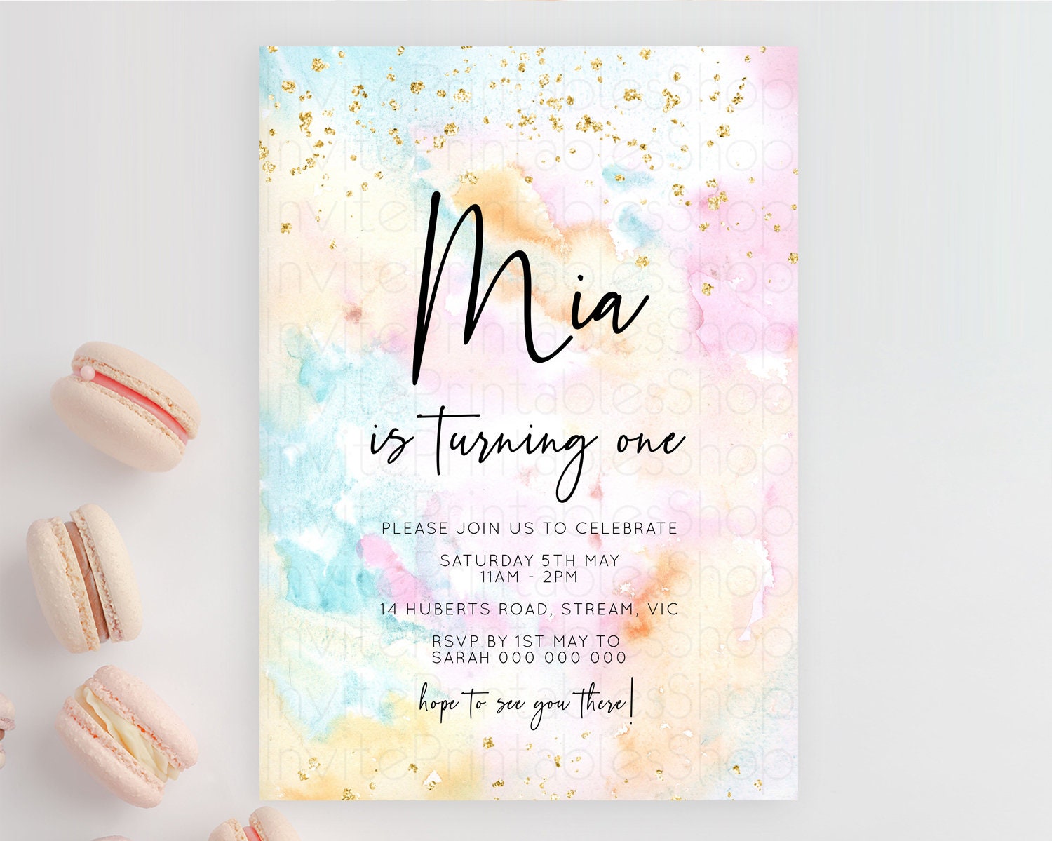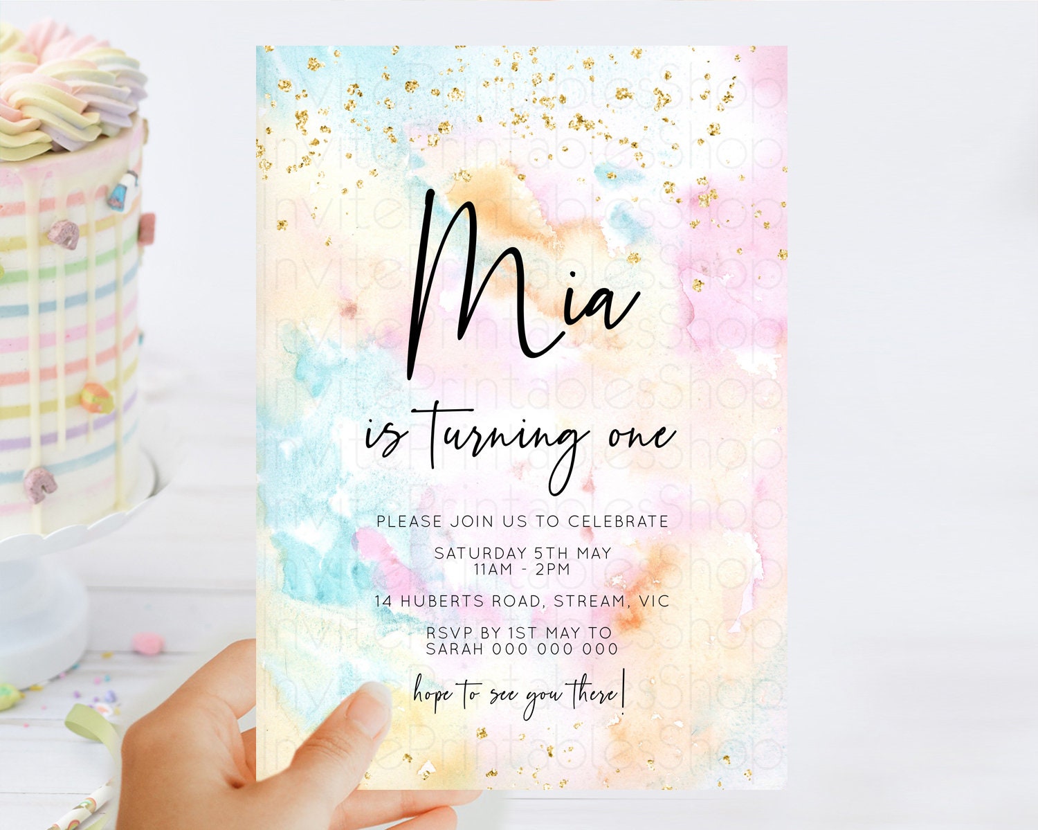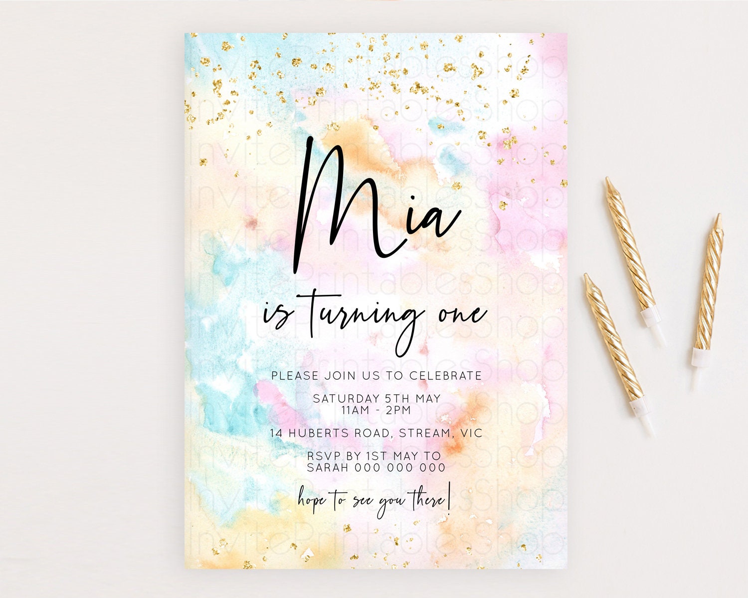 Rainbow Birthday Invitation Colorful Pastel Watercolor Invitation Gold Glitter Sprinkles Ombre Pastel 1st 2nd 3rd Birthday D10548