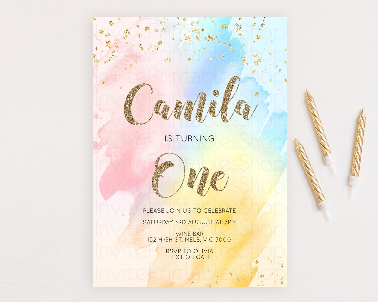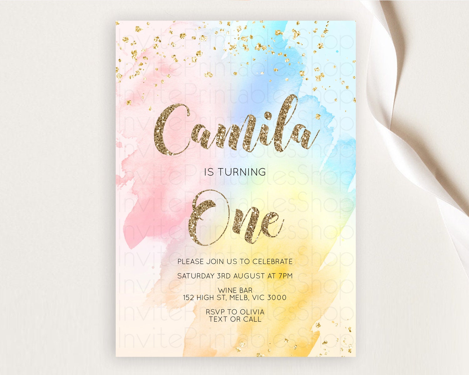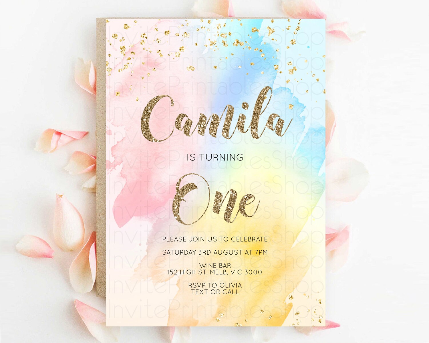 Rainbow Birthday Invitation Colorful Pastel Watercolor Invitation Gold Glitter Sprinkles Ombre Pastel 1st 2nd 3rd Birthday D10556