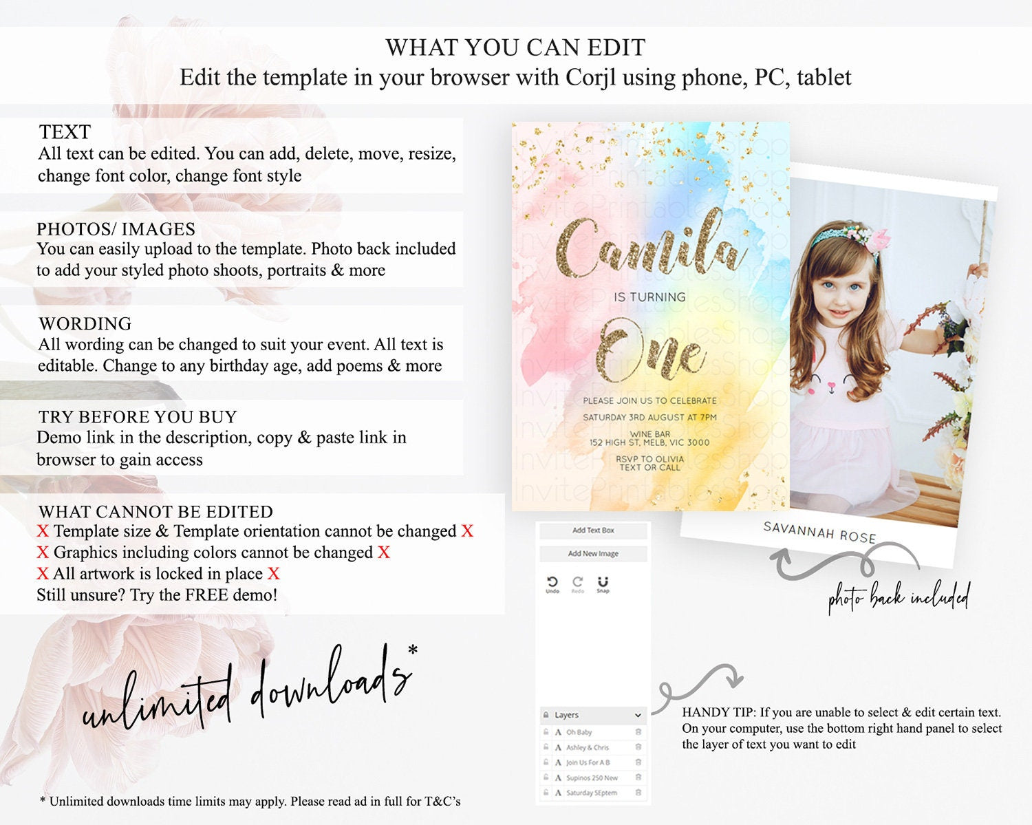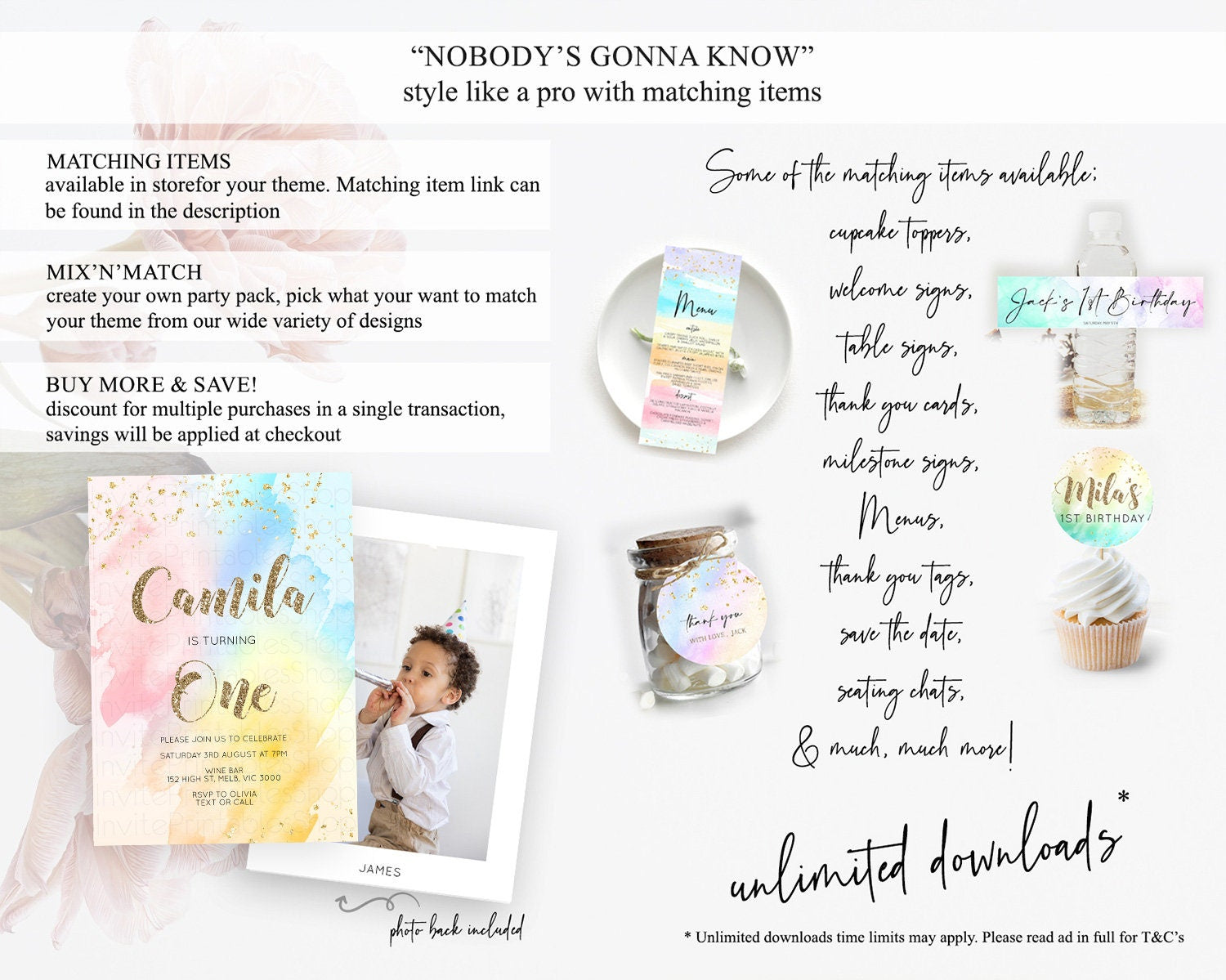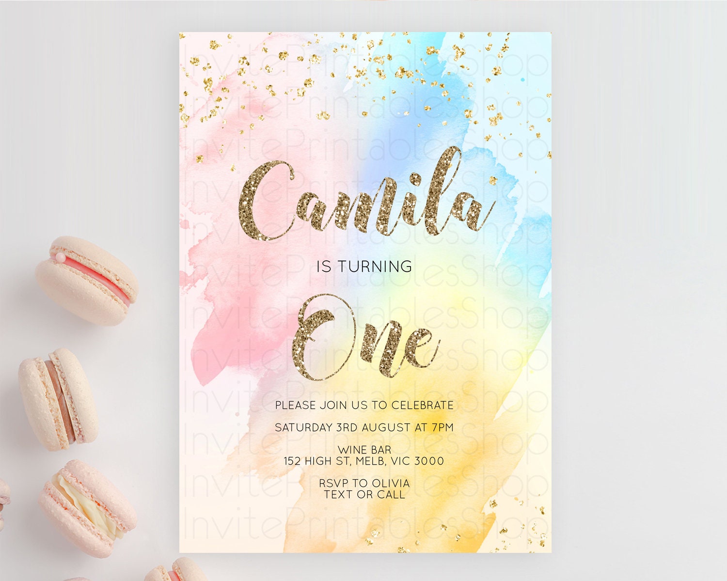 Rainbow Birthday Invitation Colorful Pastel Watercolor Invitation Gold Glitter Sprinkles Ombre Pastel 1st 2nd 3rd Birthday D10556
