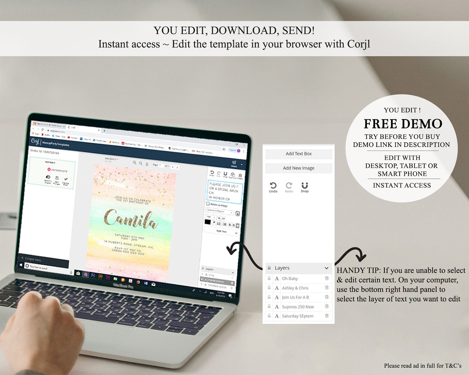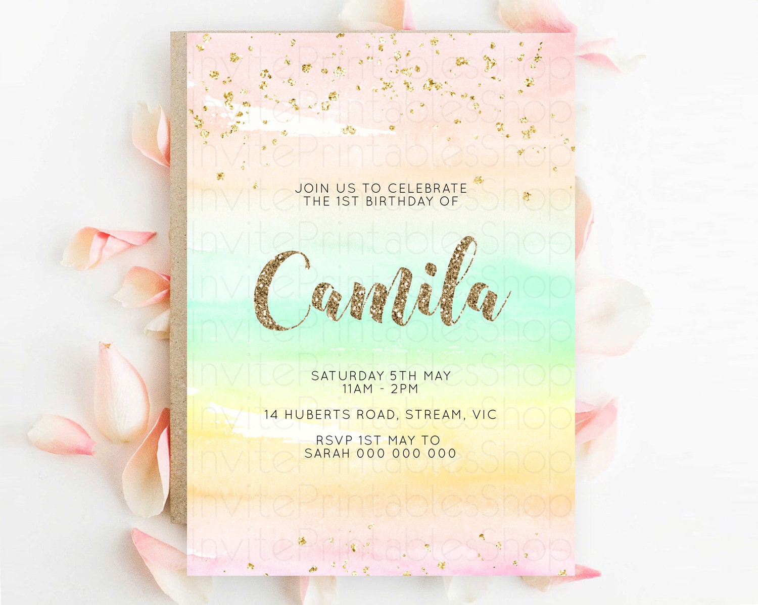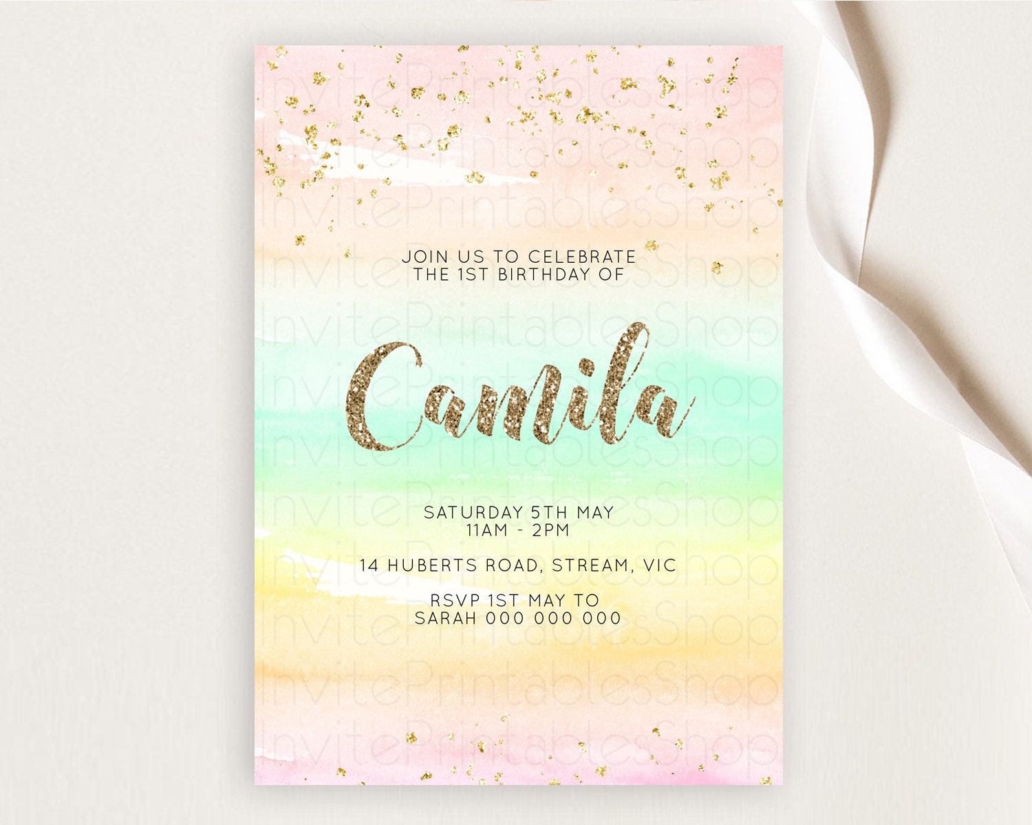 Rainbow Birthday Invitation Colorful Pastel Watercolor Invitation Gold Glitter Sprinkles Ombre Pastel 1st 2nd 3rd Birthday D10592