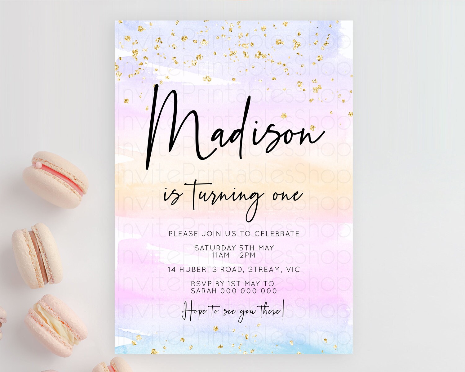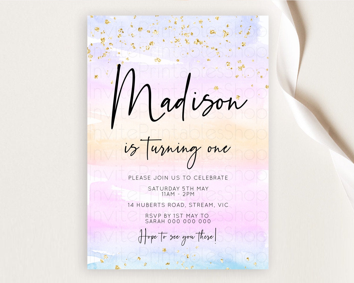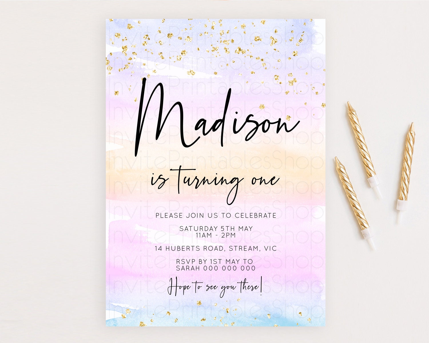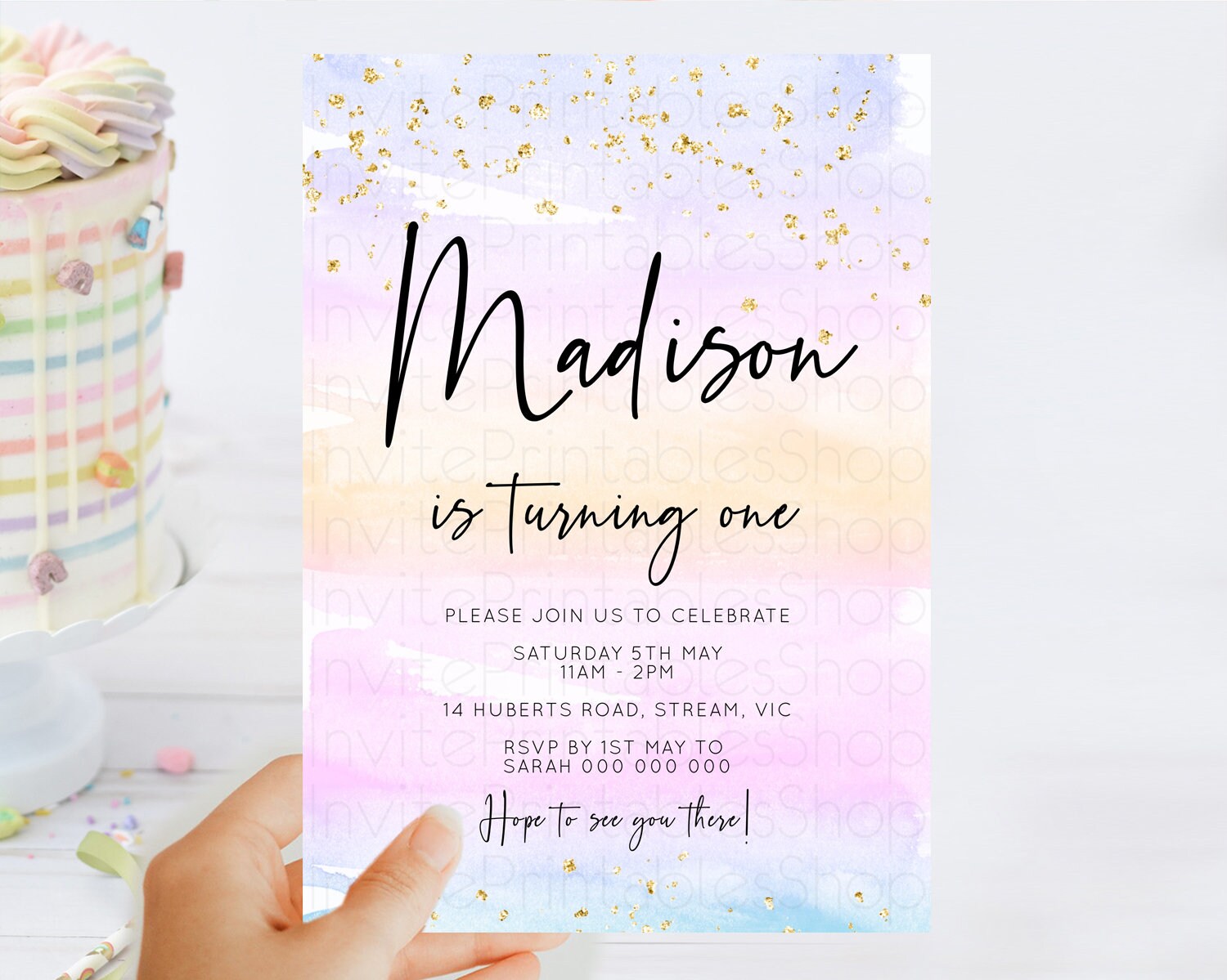 Rainbow Birthday Invitation Colorful Pastel Watercolor Invitation Gold Glitter Sprinkles Ombre Pastel 1st 2nd 3rd Birthday D10594